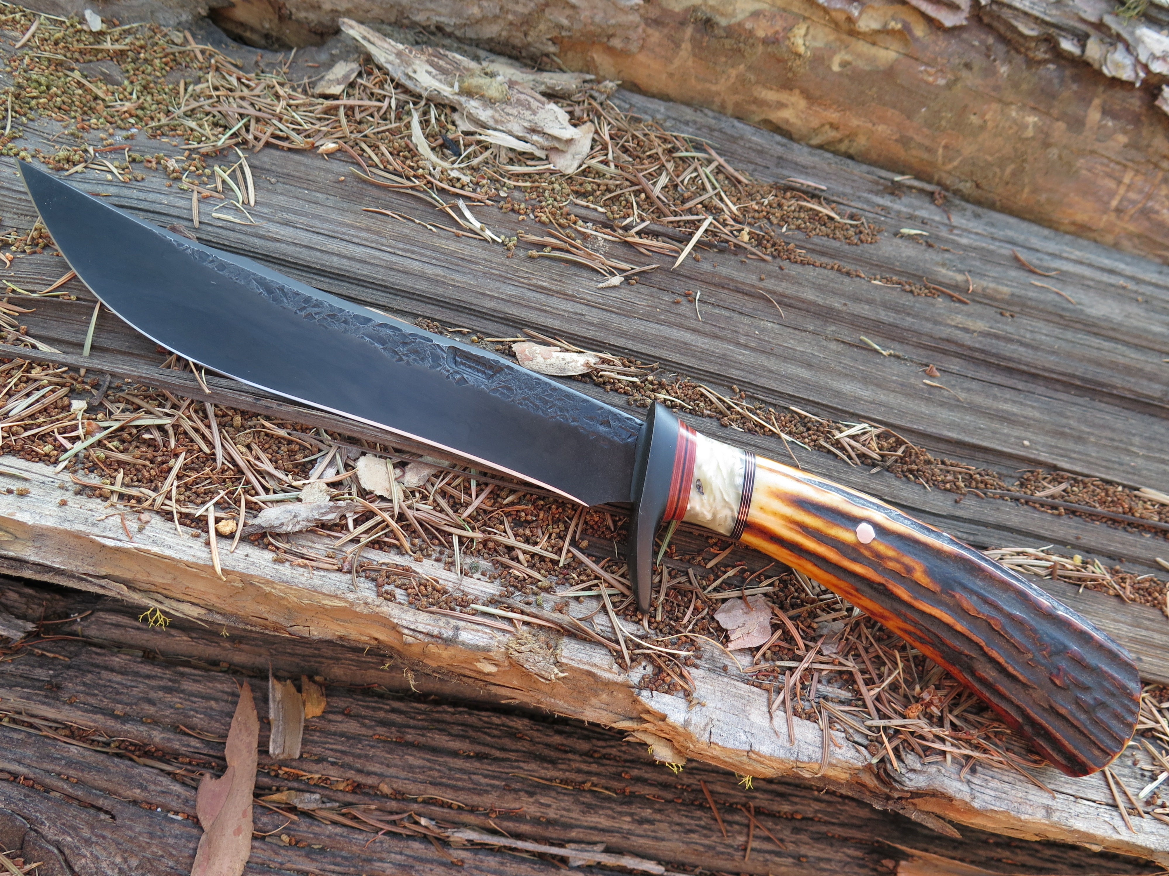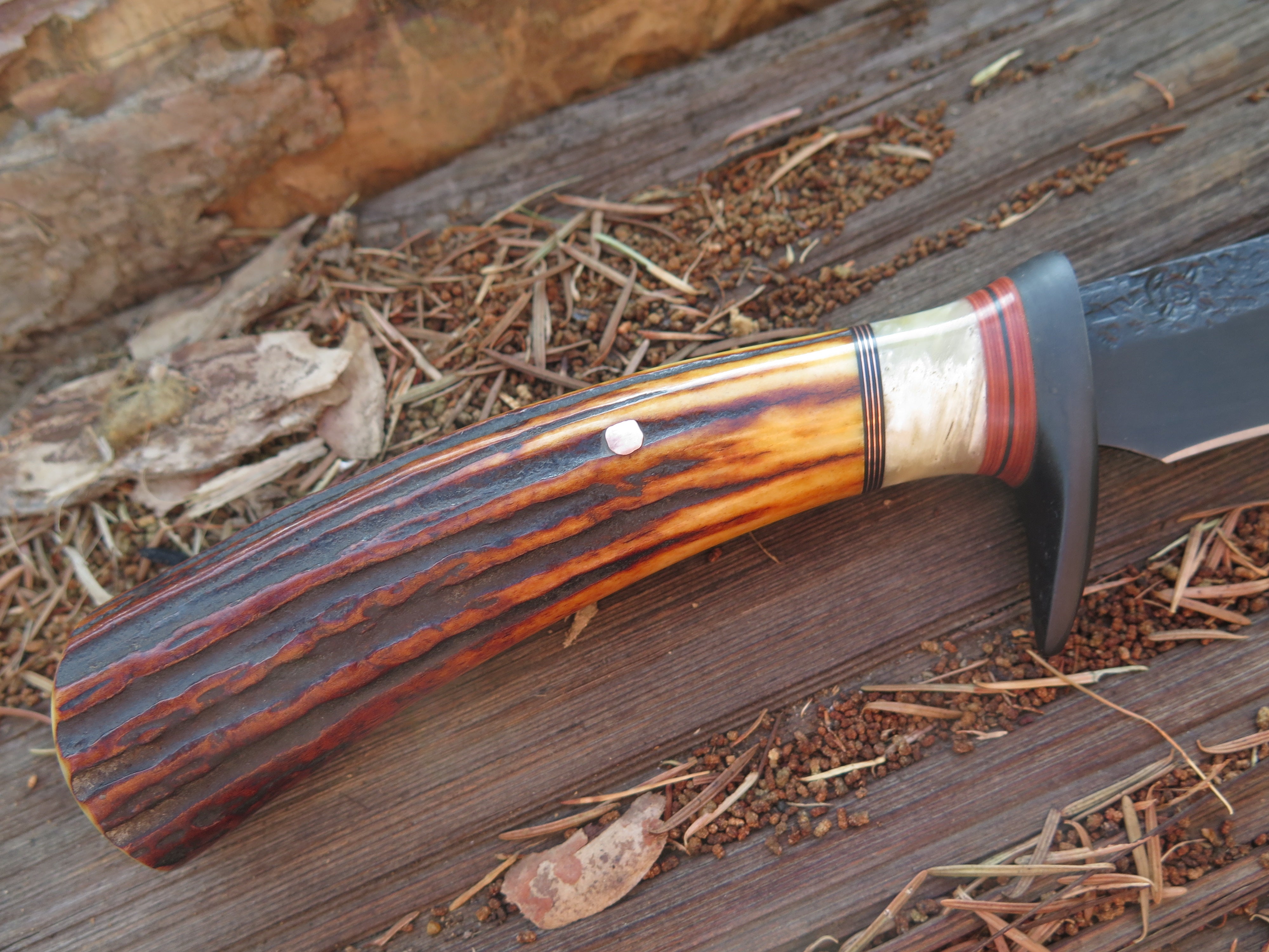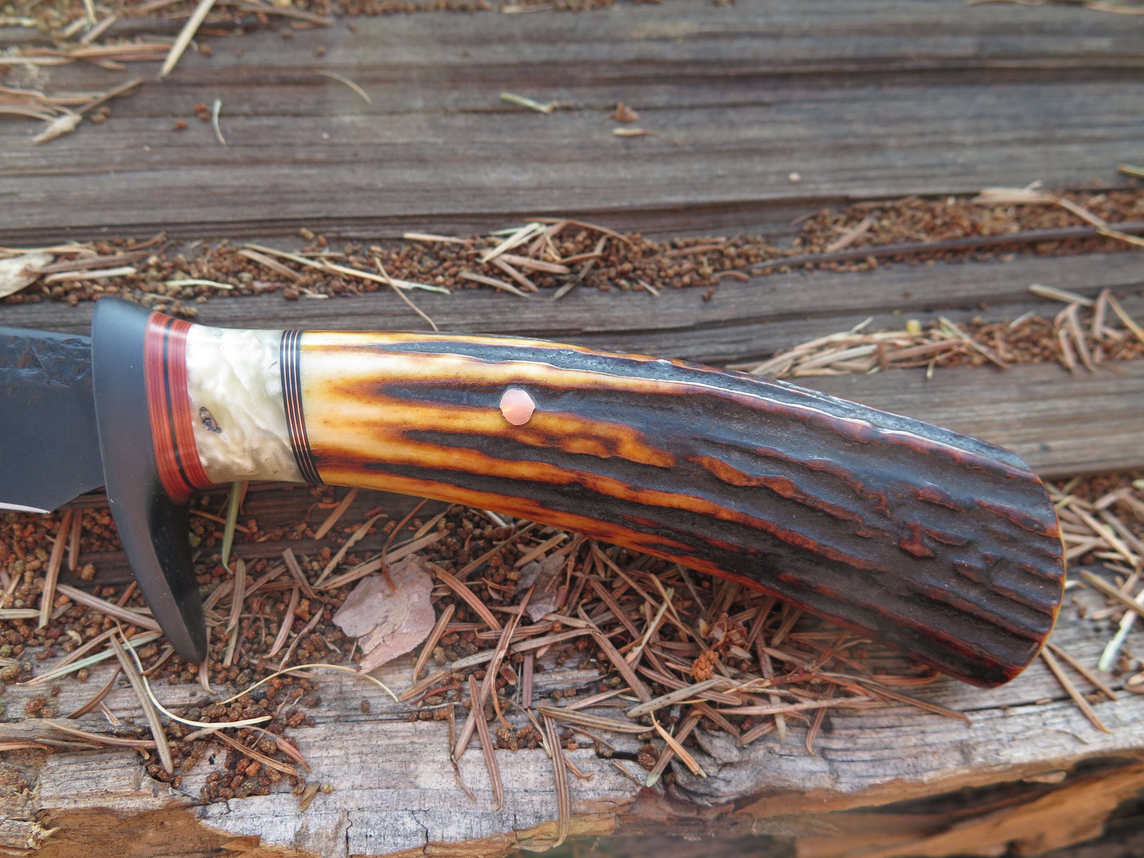 This bad ass Recurve Fighter from Behring Made© is hand forged from 1/4" thick high carbon 01 tool steel and it measures 6 3/4" from tip to guard with a razor sharp hollow grind, hammermarks and our forced patina blued finish. The blued steel guard is forged to a slight curve and is soldered in place above black and maroon fiber, copper and musk ox boss spacers. The natural amber toned sambar stag is pinned through the tang with copper and overall length measures just under 12". This thing is so stinkin' cool!!! It'll come in a custom leather sheath from Warlander Leather as well.