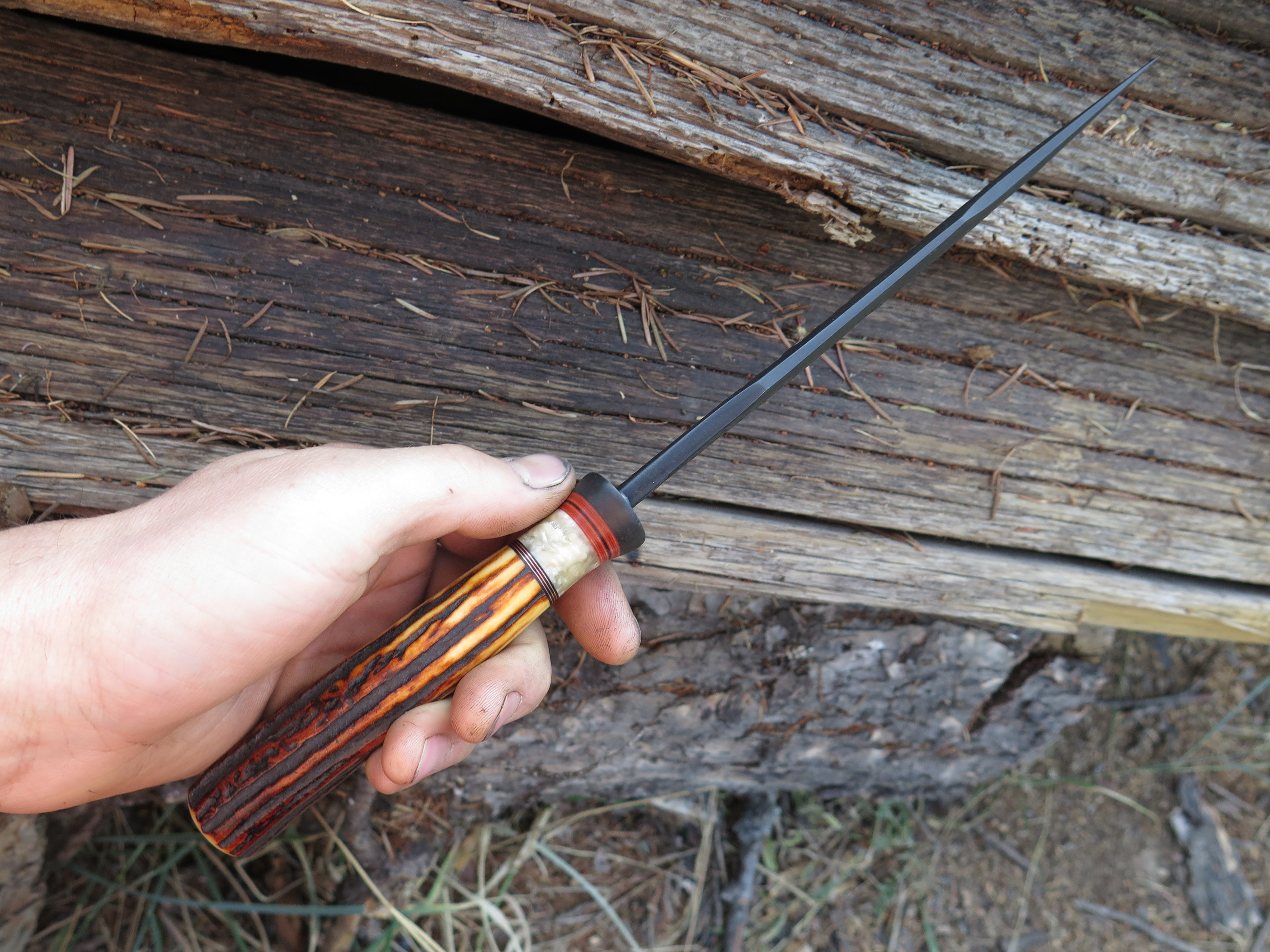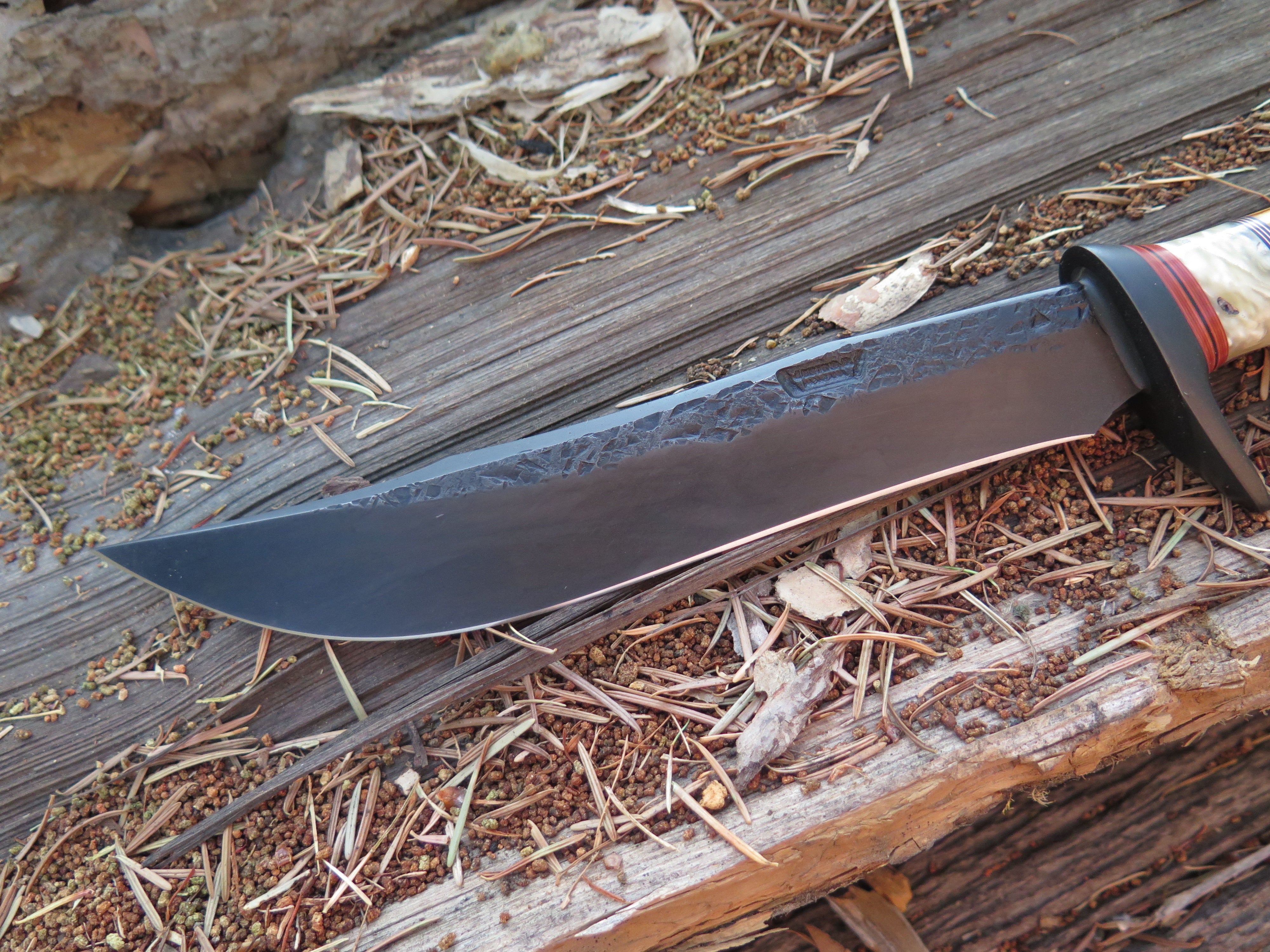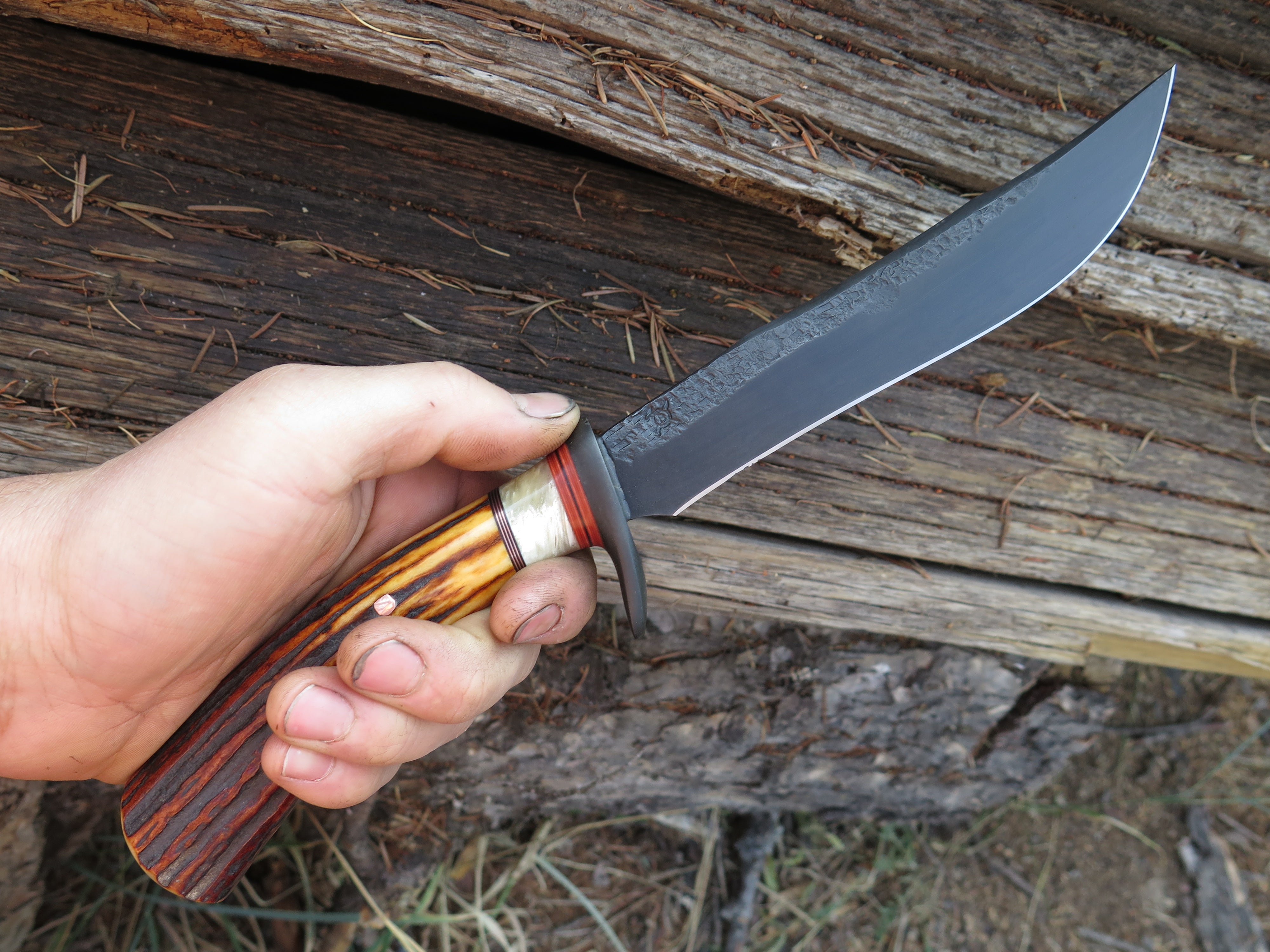 This bad ass Recurve Fighter from Behring Made© is hand forged from 1/4" thick high carbon 01 tool steel and it measures 6 3/4" from tip to guard with a razor sharp hollow grind, hammermarks and our forced patina blued finish. The blued steel guard is forged to a slight curve and is soldered in place above black and maroon fiber, copper and musk ox boss spacers. The natural amber toned sambar stag is pinned through the tang with copper and overall length measures just under 12". This thing is so stinkin' cool!!! It'll come in a custom leather sheath from Warlander Leather as well.