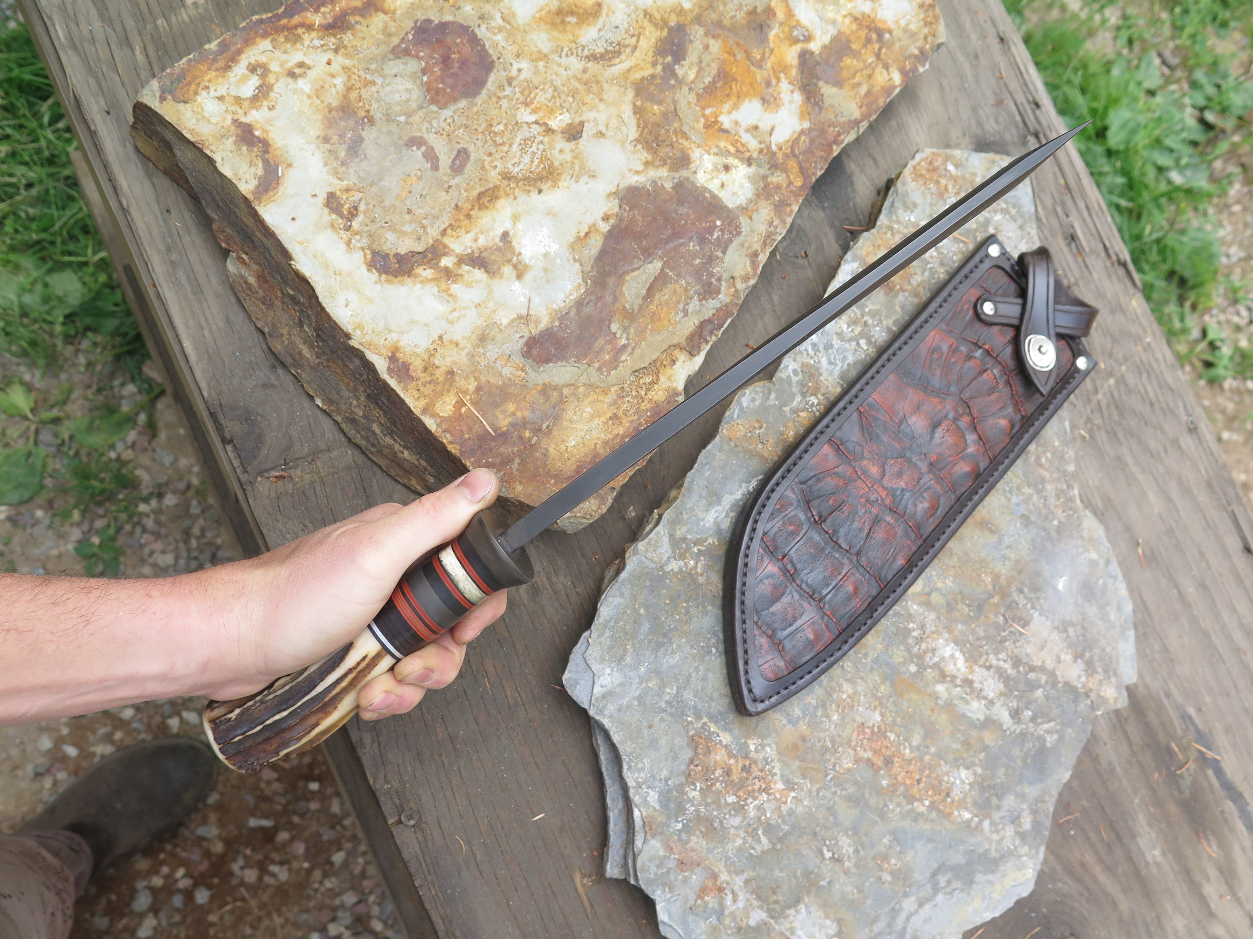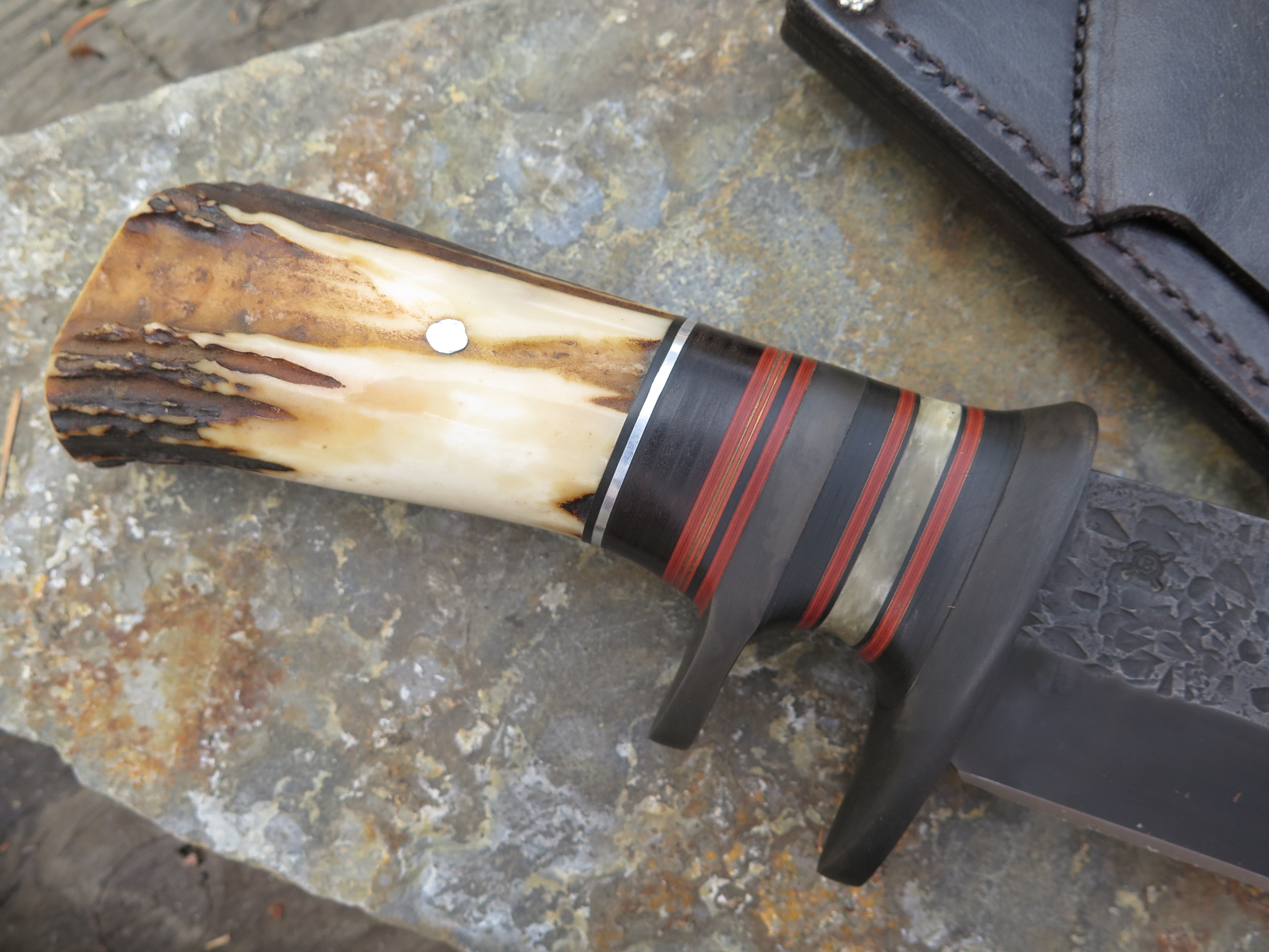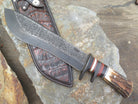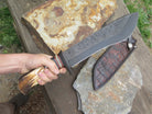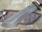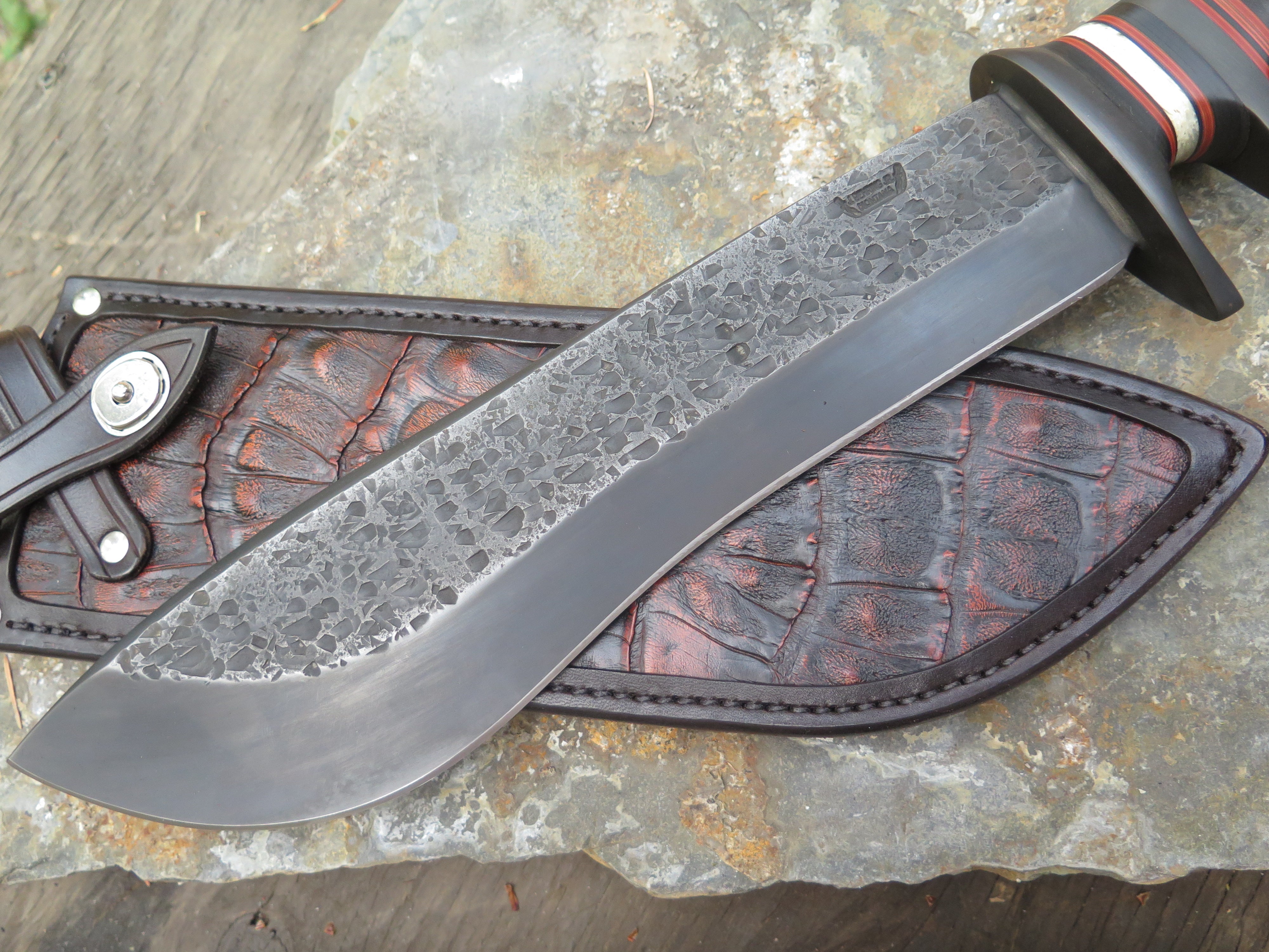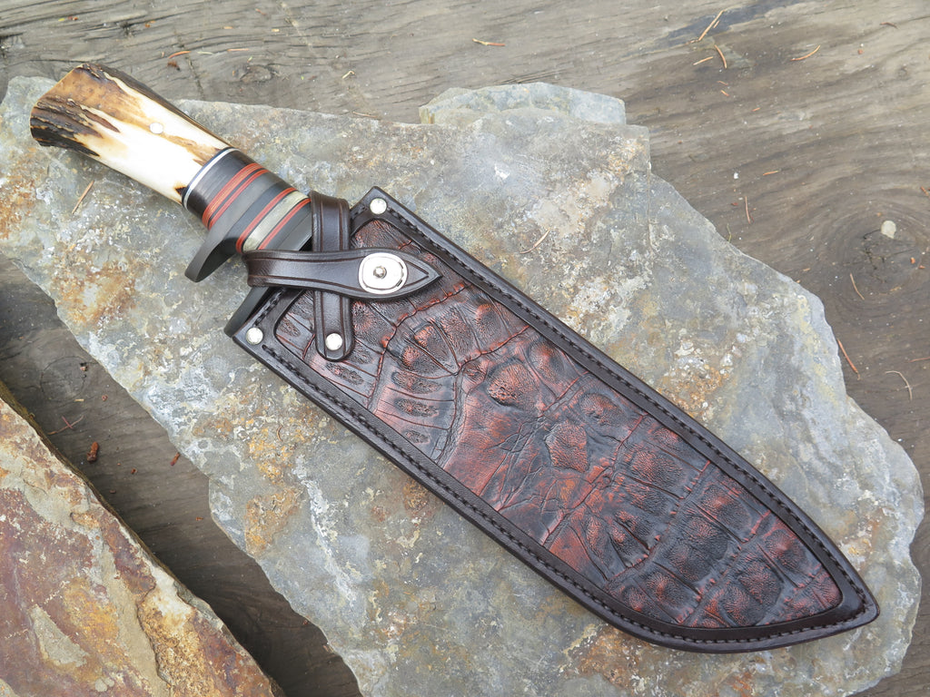 This absolute beast of a Kukri from Behring Made© is hand forged from 3/8" thick high carbon 01 tool steel and it measures 11 1/2" from tip to guard with a razor sharp hollow grind, hammermarks and our forced patina blued finish. The blued steel guard is soldered in place above black and maroon fiber, horsehide, aluminum and musk ox boss spacers with a blued steel sub-hilt. The sambar stag handle is pinned through the tang with aluminum and the overall length measures just over 17 3/4". The custom Warlander Leather sheath is inlaid with a remarkable caiman inlay.