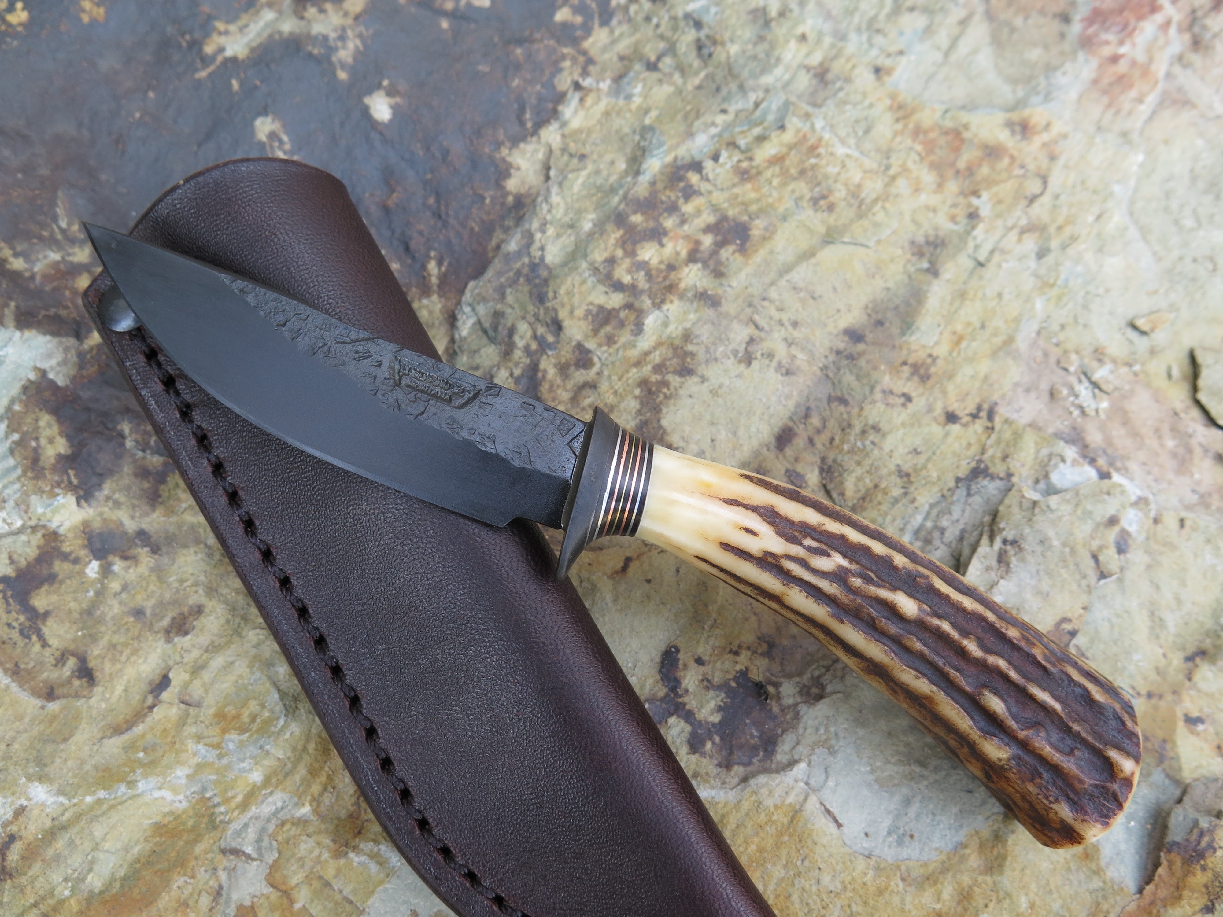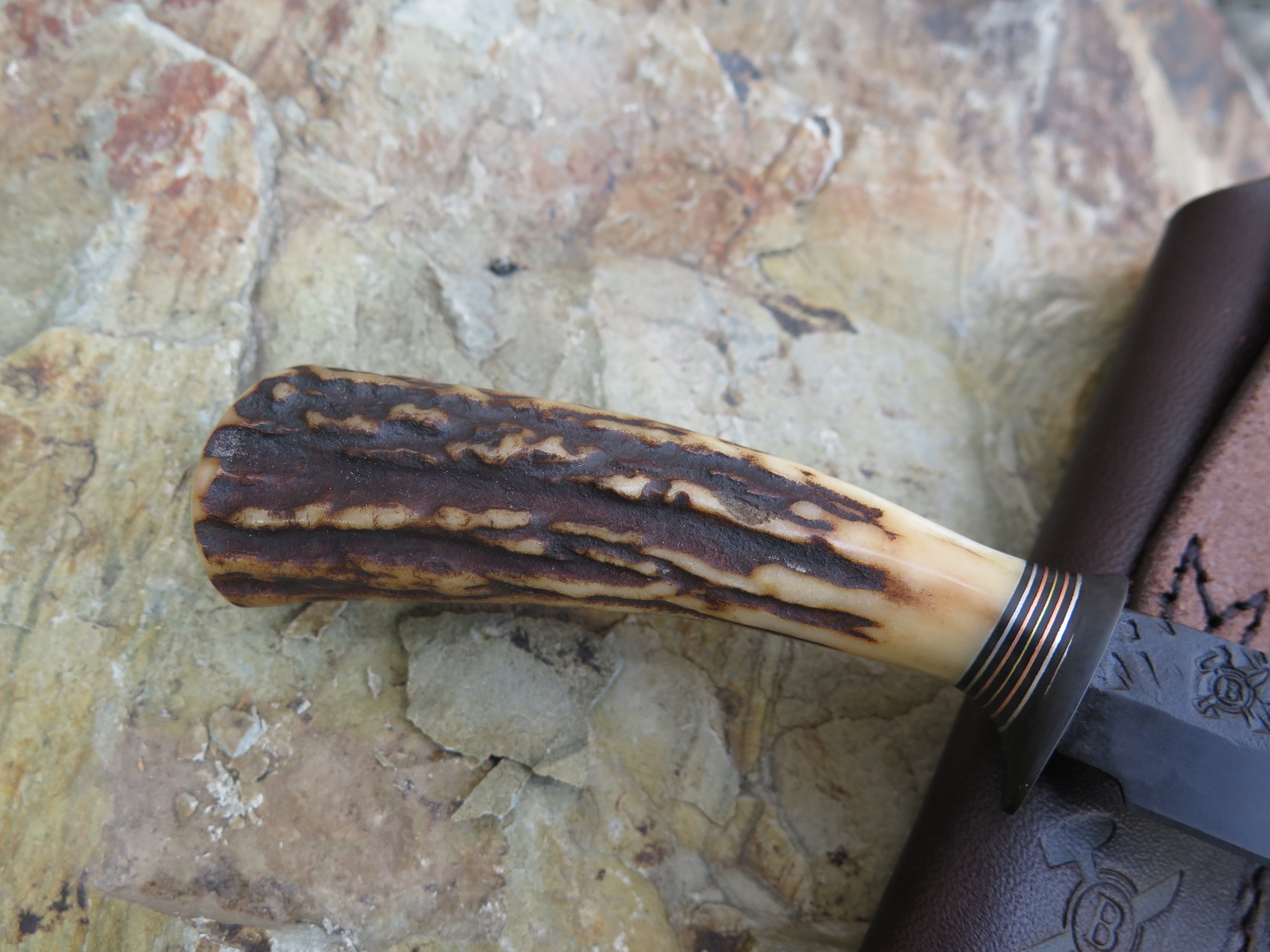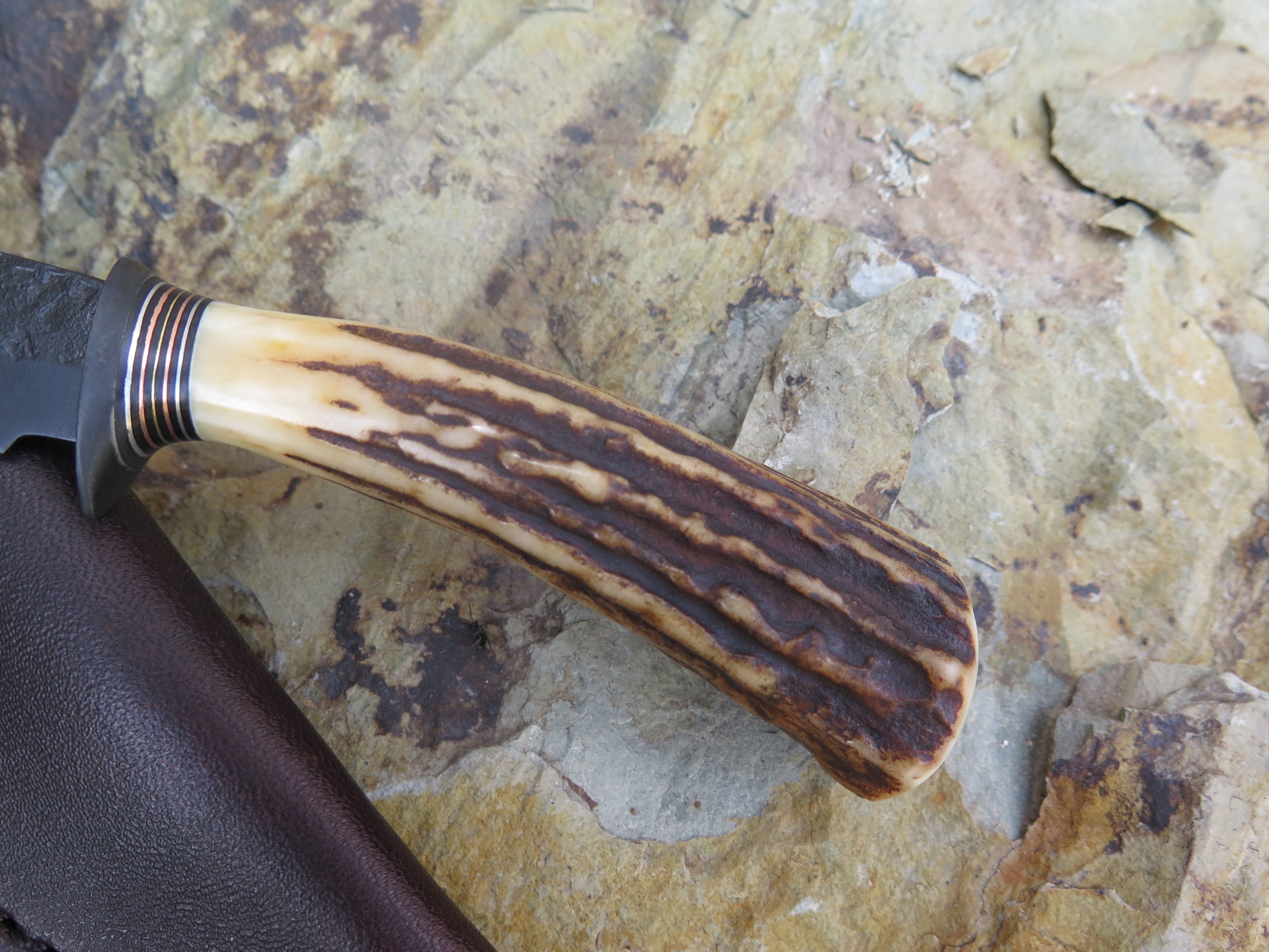This bad ass new Woodcraft from Behring Made© is hand forged from 1/8" thick high carbon 01 tool steel and it measures 3 1/4" from tip to guard with a razor sharp hollow grind, hammermarks and our forced patina blued finish. The blued steel guard is soldered in place above black fiber, aluminum, copper and brass spacers. The handle is premium sambar stag and it brings the overall length to just over 6 3/4", plus it comes in a classic pouch sheath from Warlander Leather.