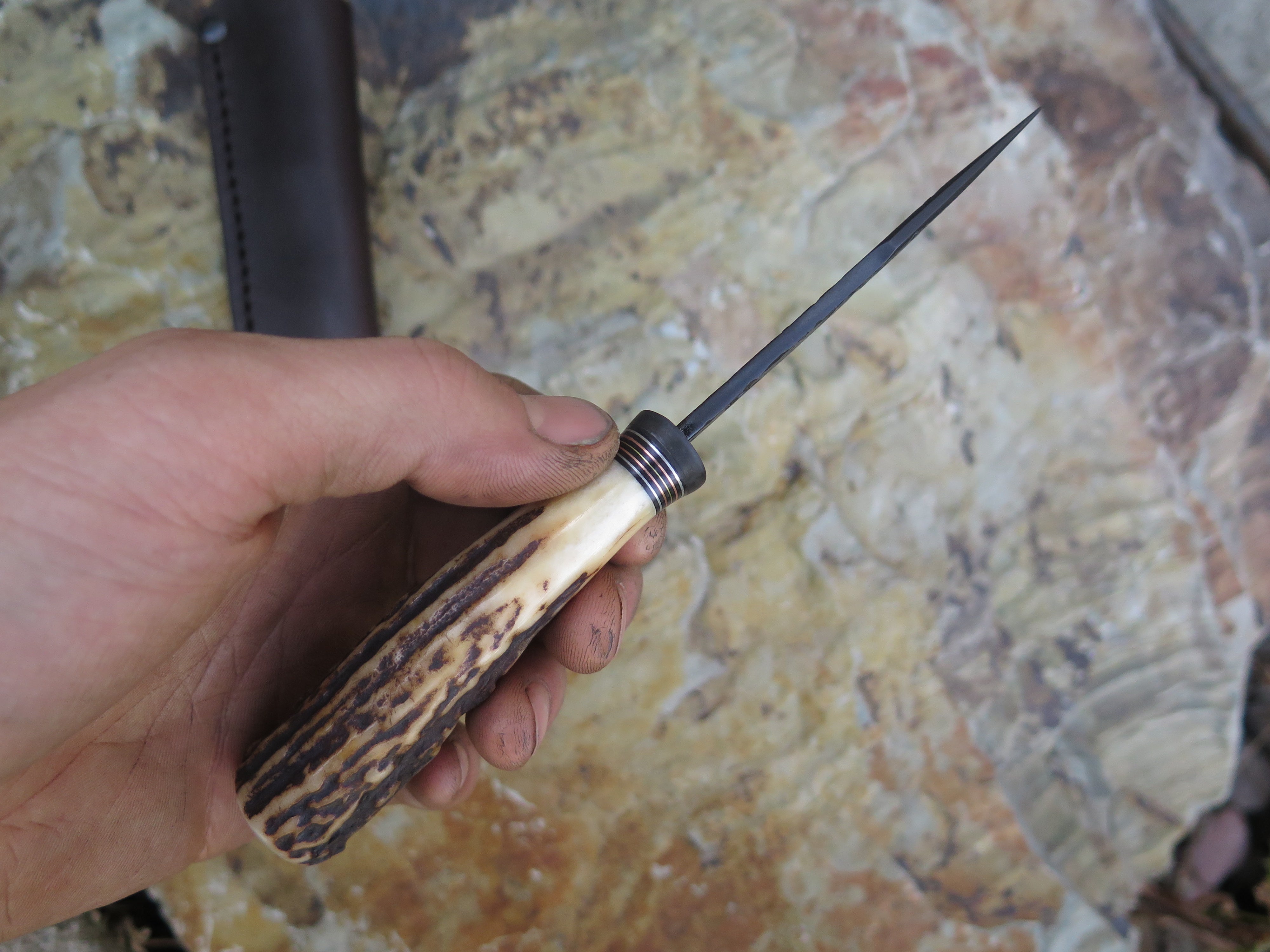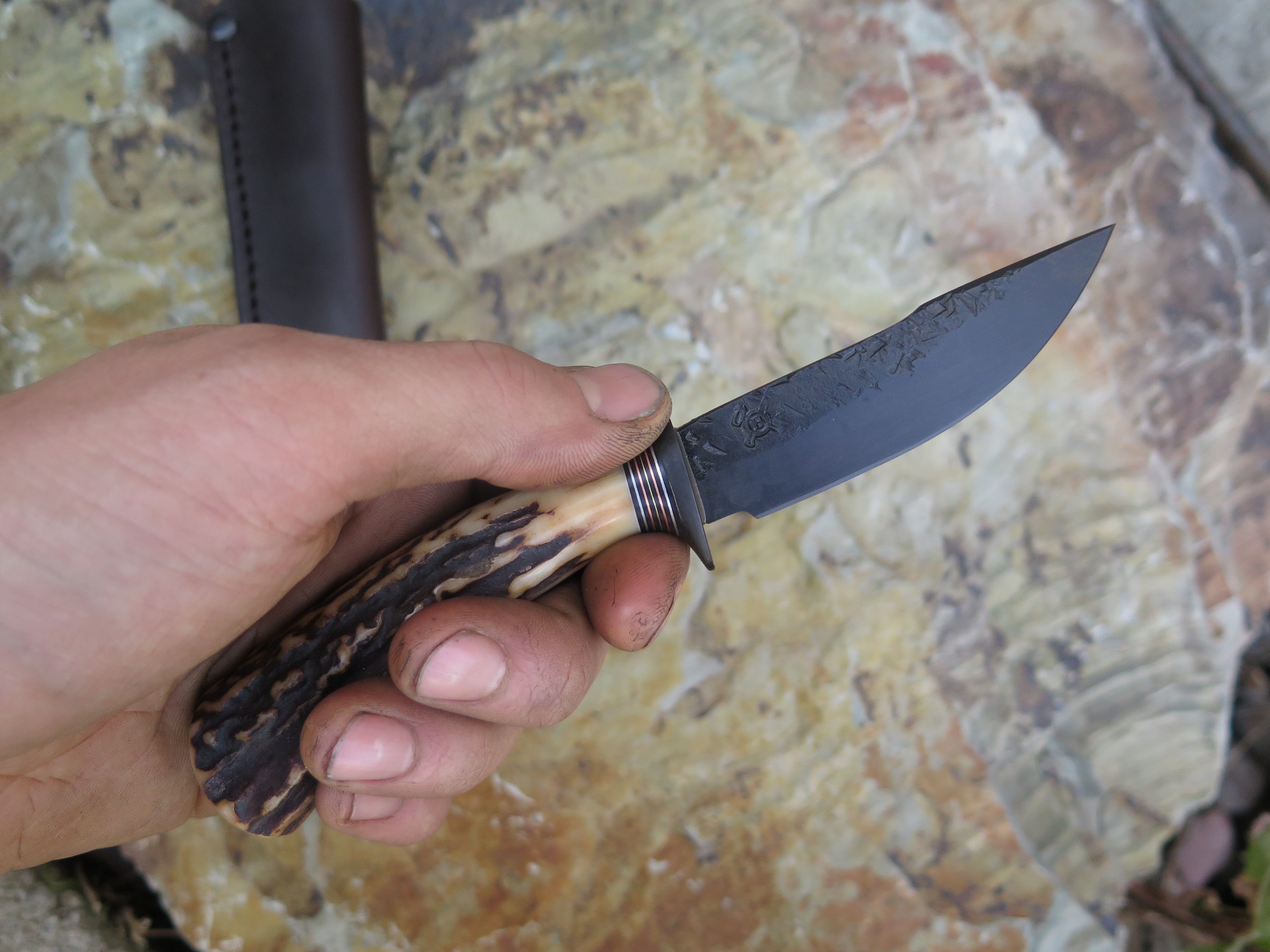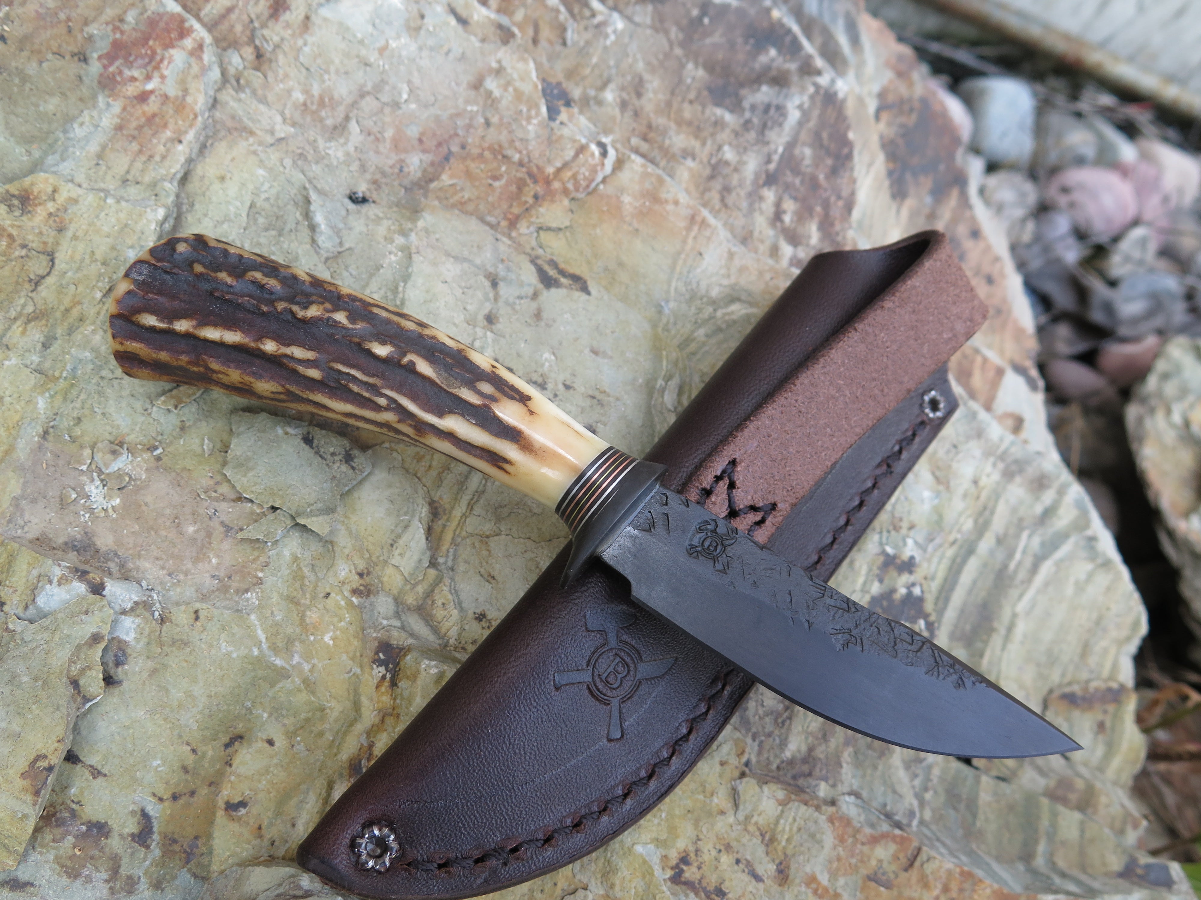This bad ass new Woodcraft from Behring Made© is hand forged from 1/8" thick high carbon 01 tool steel and it measures 3 1/4" from tip to guard with a razor sharp hollow grind, hammermarks and our forced patina blued finish. The blued steel guard is soldered in place above black fiber, aluminum, copper and brass spacers. The handle is premium sambar stag and it brings the overall length to just over 6 3/4", plus it comes in a classic pouch sheath from Warlander Leather.