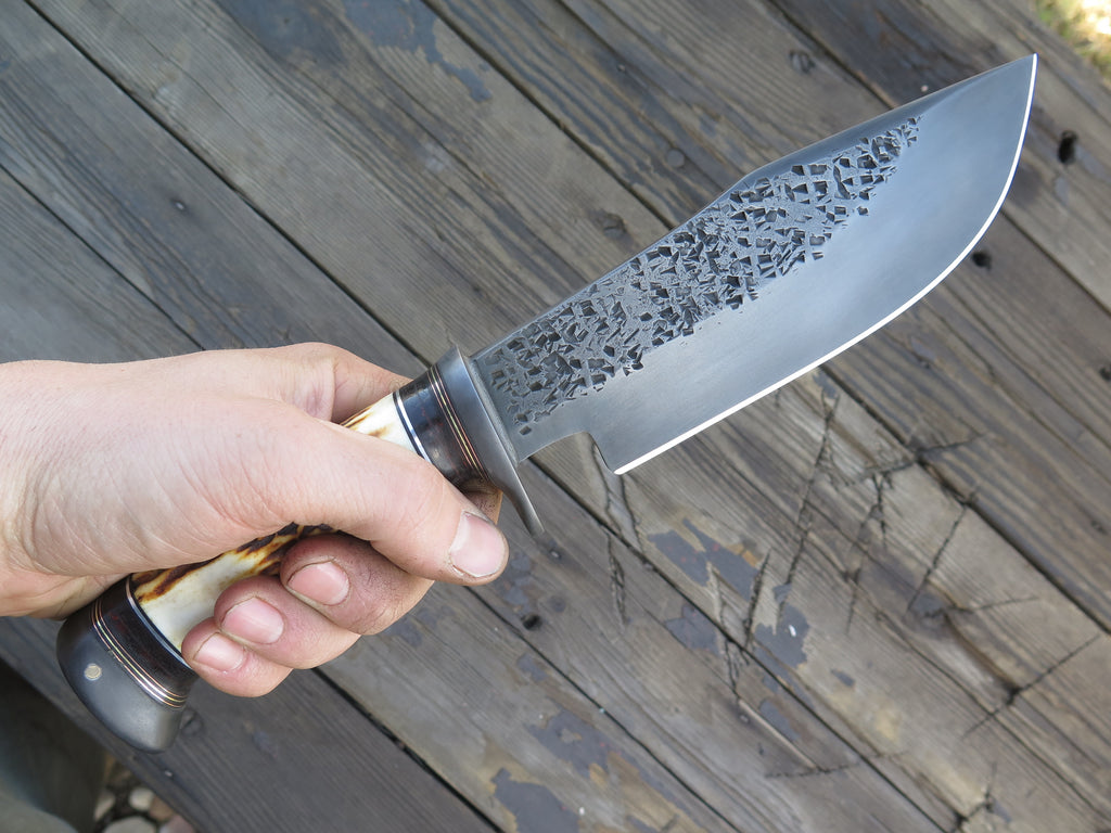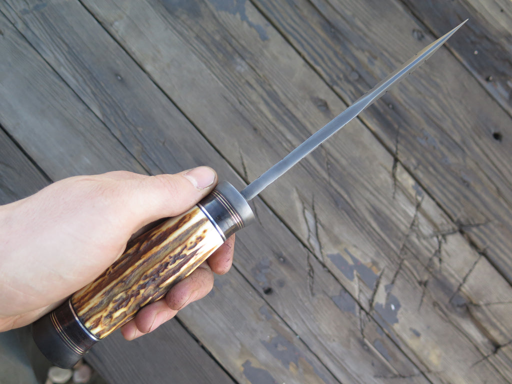 This new XL Bushmaster from Behring Made™ is a absolute tank of a knife. The blade is hand forged from 1/4" thick high carbon 01 tool steel and it measures 6 1/2" from tip to guard with 2 1/8" of belly, a razor sharp hollow grind, hammermarks, and our forced patina blued finish. The blued steel guard is soldered in place above black fiber, aluminum, brass, copper and horsehide spacers- all of which beautifully compliment the premium sambar stag handle that's capped with blued steel. Overall length measures 11 1/4" and Amy at Warlander Leather will be giving this one the premium custom treatment.
