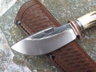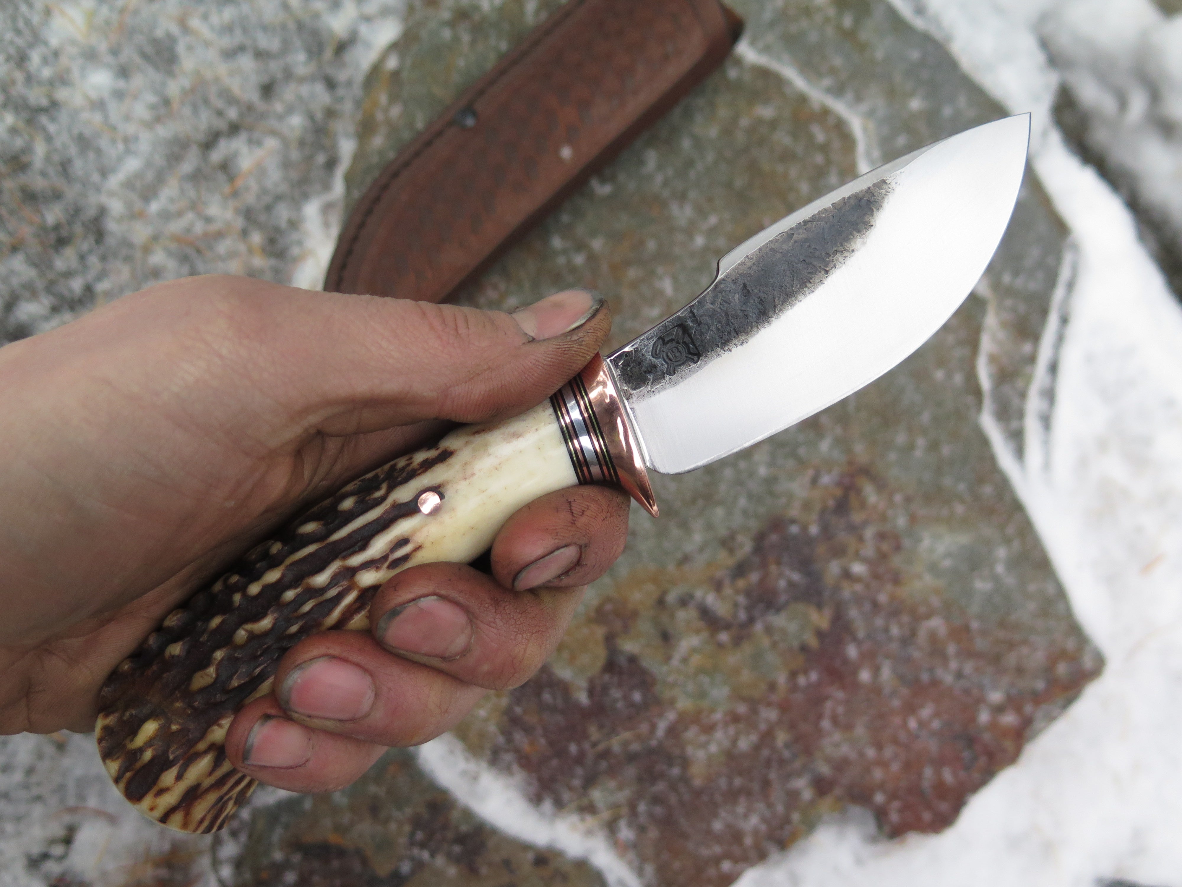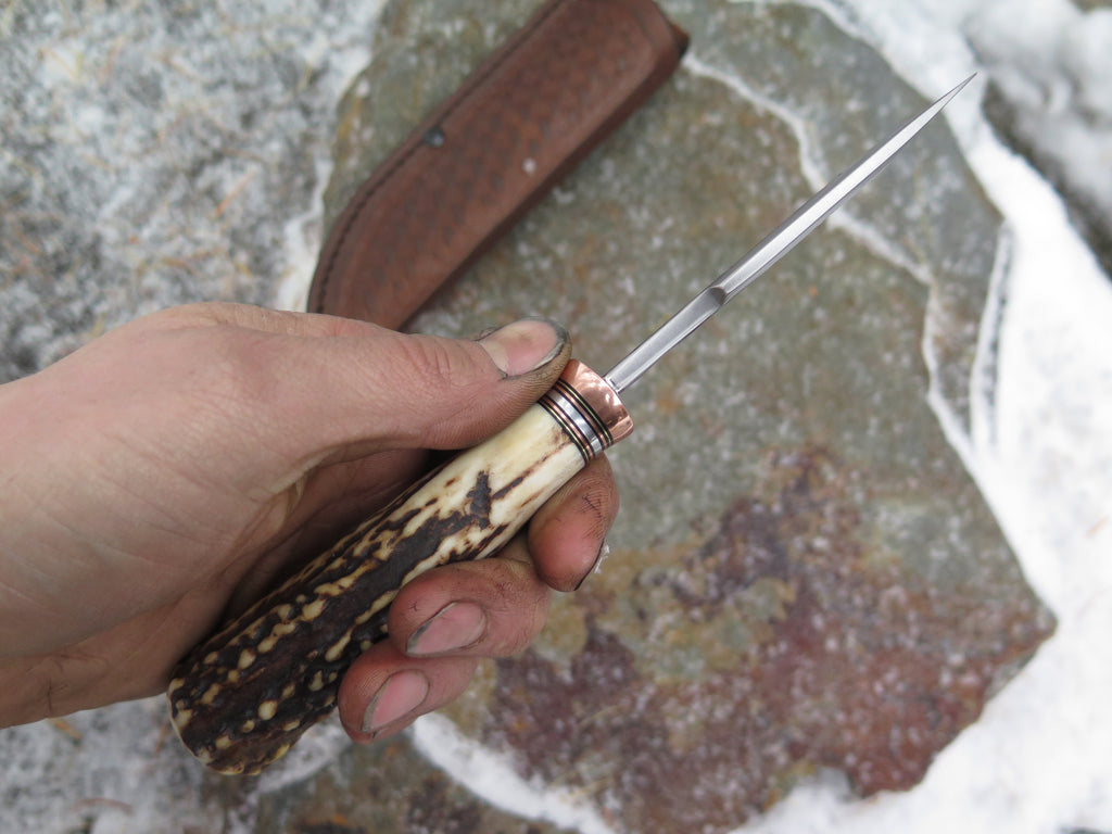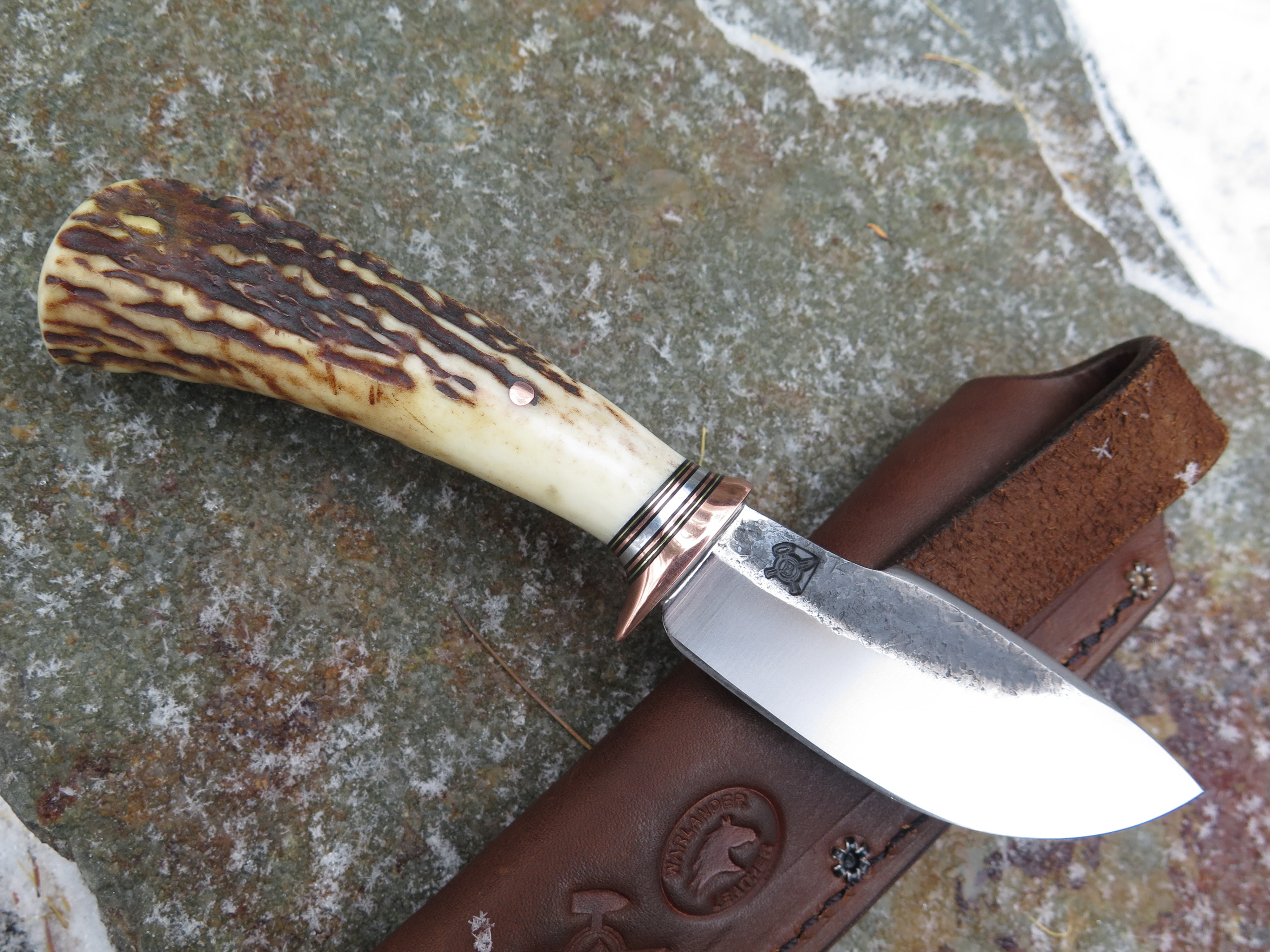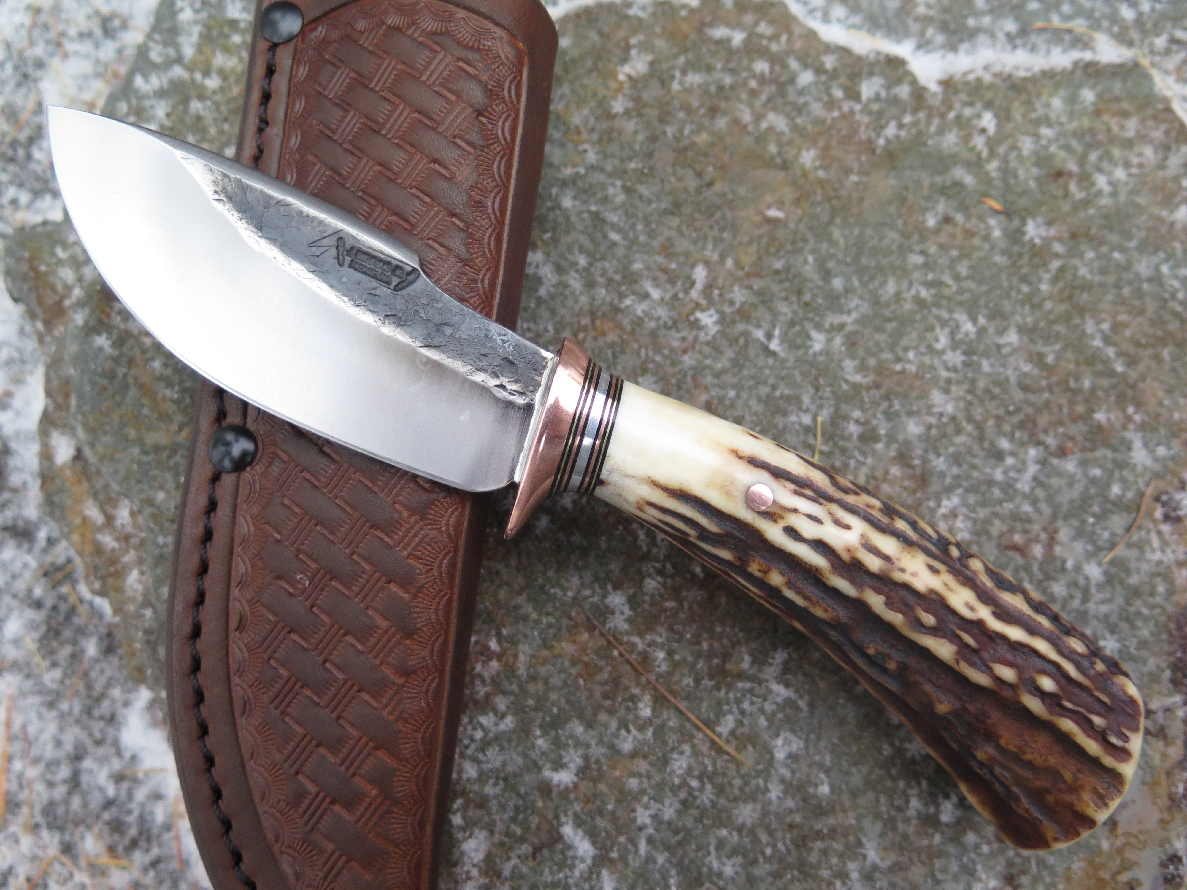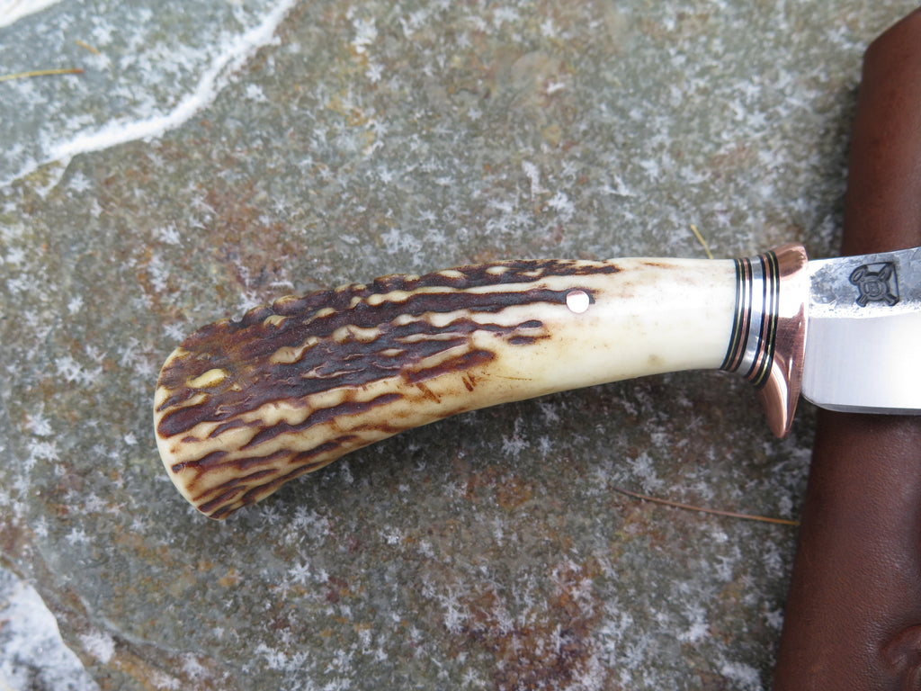 This beautiful new Canoe Knife from Behring Made© is hand forged from 3/16" thick high carbon 01 tool steel and measures 3 3/4" from tip to guard with a razor sharp hollow grind and our hammermark finish. The copper guard is soldered in place above black fiber, brass, copper and aluminum spacers as well as a premium sambar stag handle that's pinned through the tang with copper. The overall length measures right under 8" and it comes in a premium leather belt pouch sheath, though substitutions are available upon request.