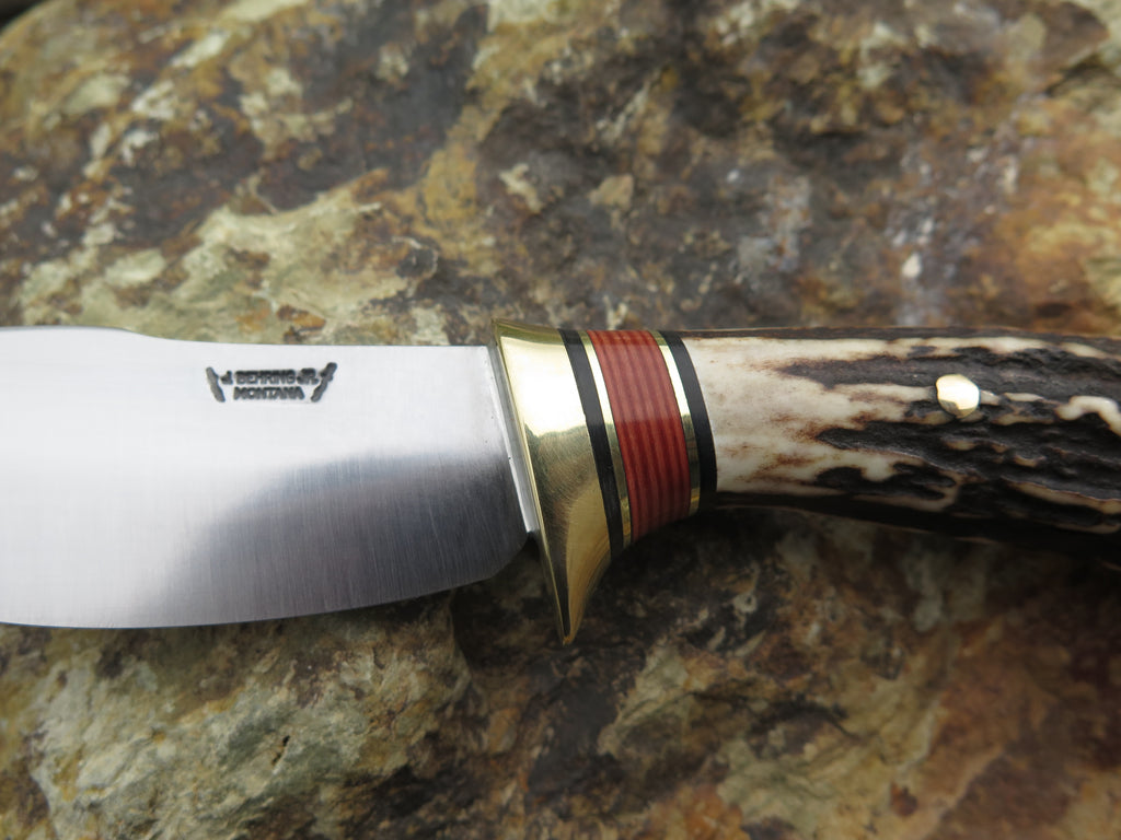 This new shape from Behring Made© is the Canoe Knife. Lightweight and versatile, it's an excellent field shape for when every ounce counts. It's hand forged from 1/8" thick high carbon 01 tool steel and measures 3 1/2" from tip to guard with a razor sharp convex grind. The brass guard is soldered in place above black, maroon and brass spacers. The premium sambar stag handle is pinned through the tang with brass and the overall length measures 7 3/4". Something as unique and cool as this could only come in a Mudbone sheath, and it will feature tooled imagery of an old handmade canoe.