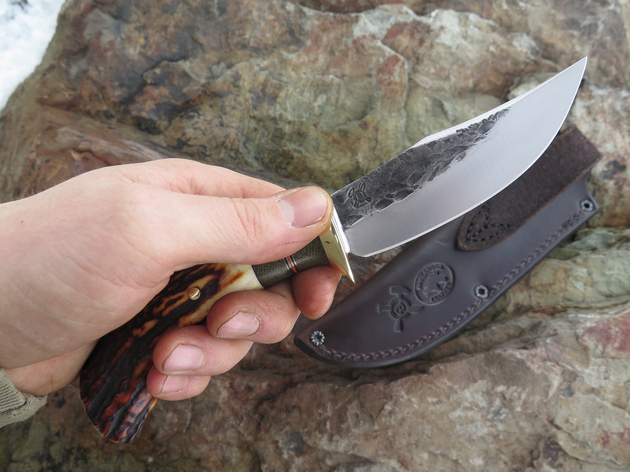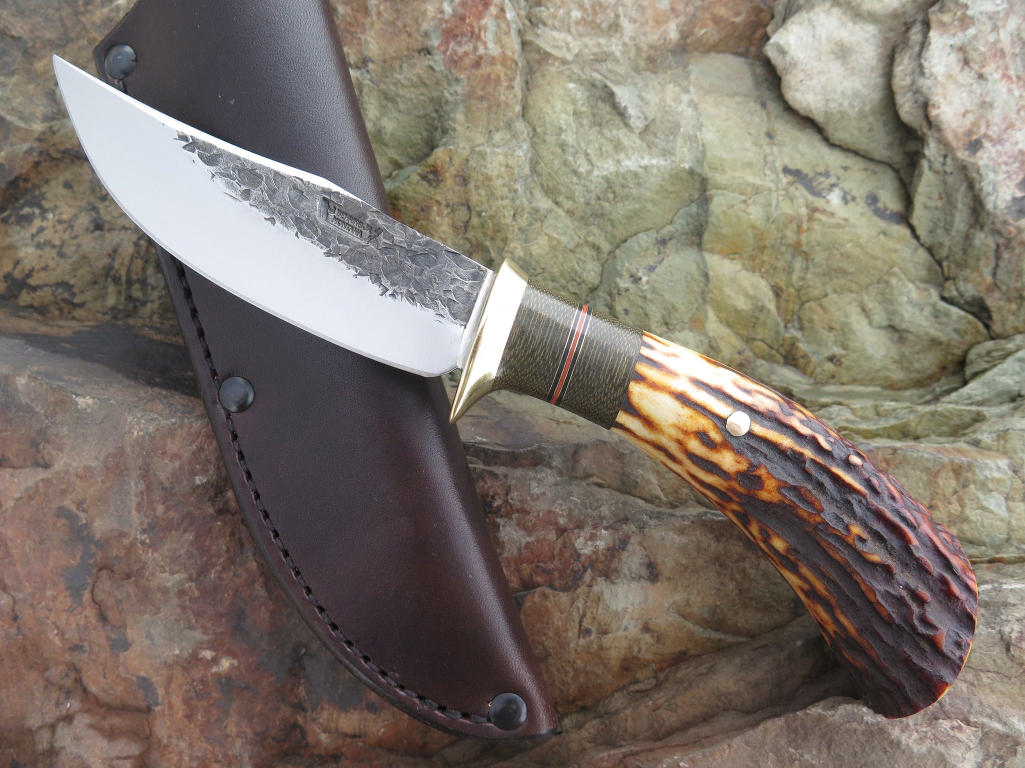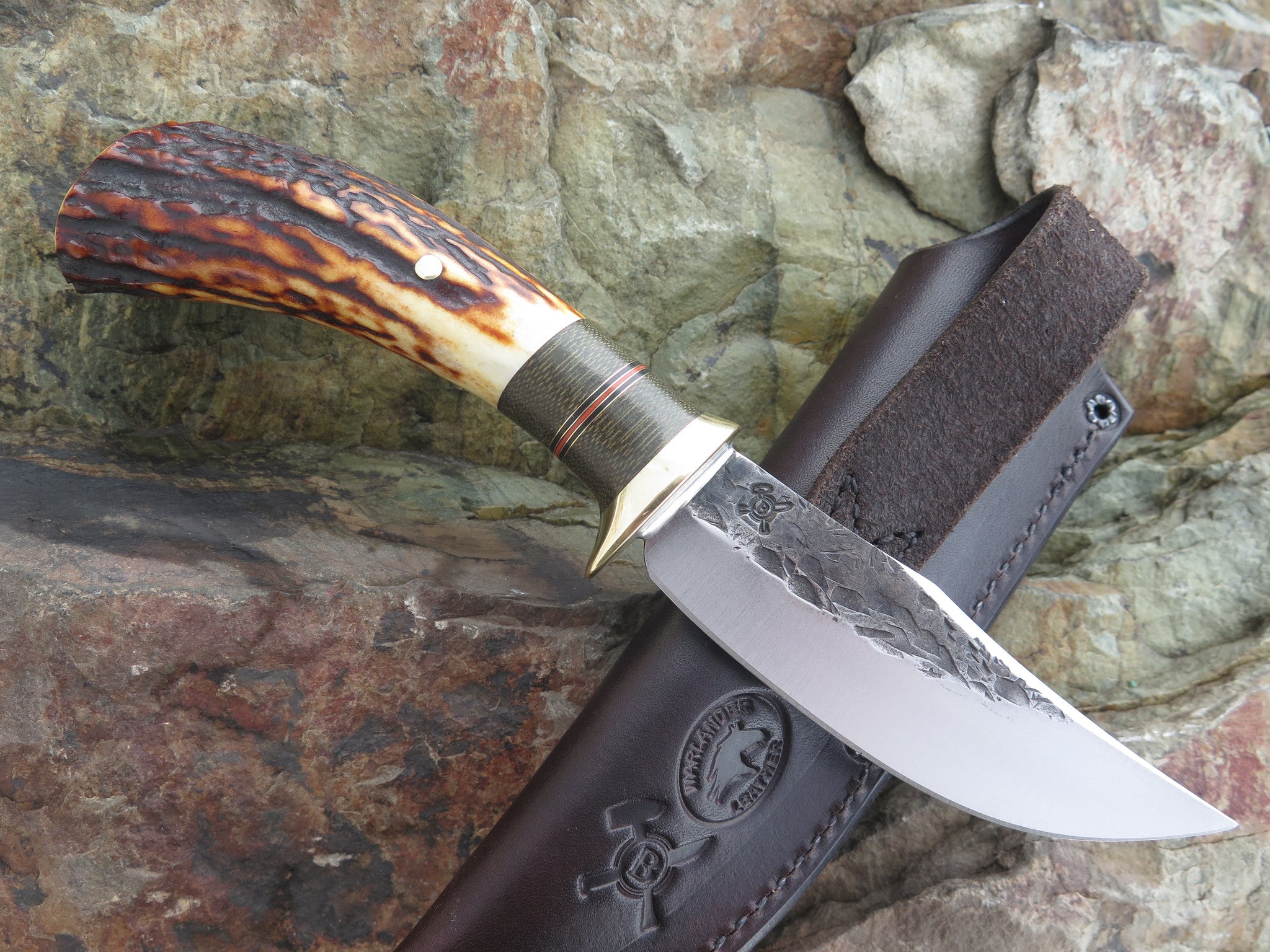 This new Clip Hunter from Behring Made is hand forged from 1/8" thick high carbon 01 tool steel and it measures 4 1/4" from tip to guard with a razor sharp hollow grind and a hammermark finish. The brass guard is soldered in place above black and maroon fiber, brass and green canvas micarta spacers that pop beautifully off the premium sambar stag handle that's pinned with brass. The overall length measures 8 3/8" and it comes in a custom pouch sheath from Warlander Leather.