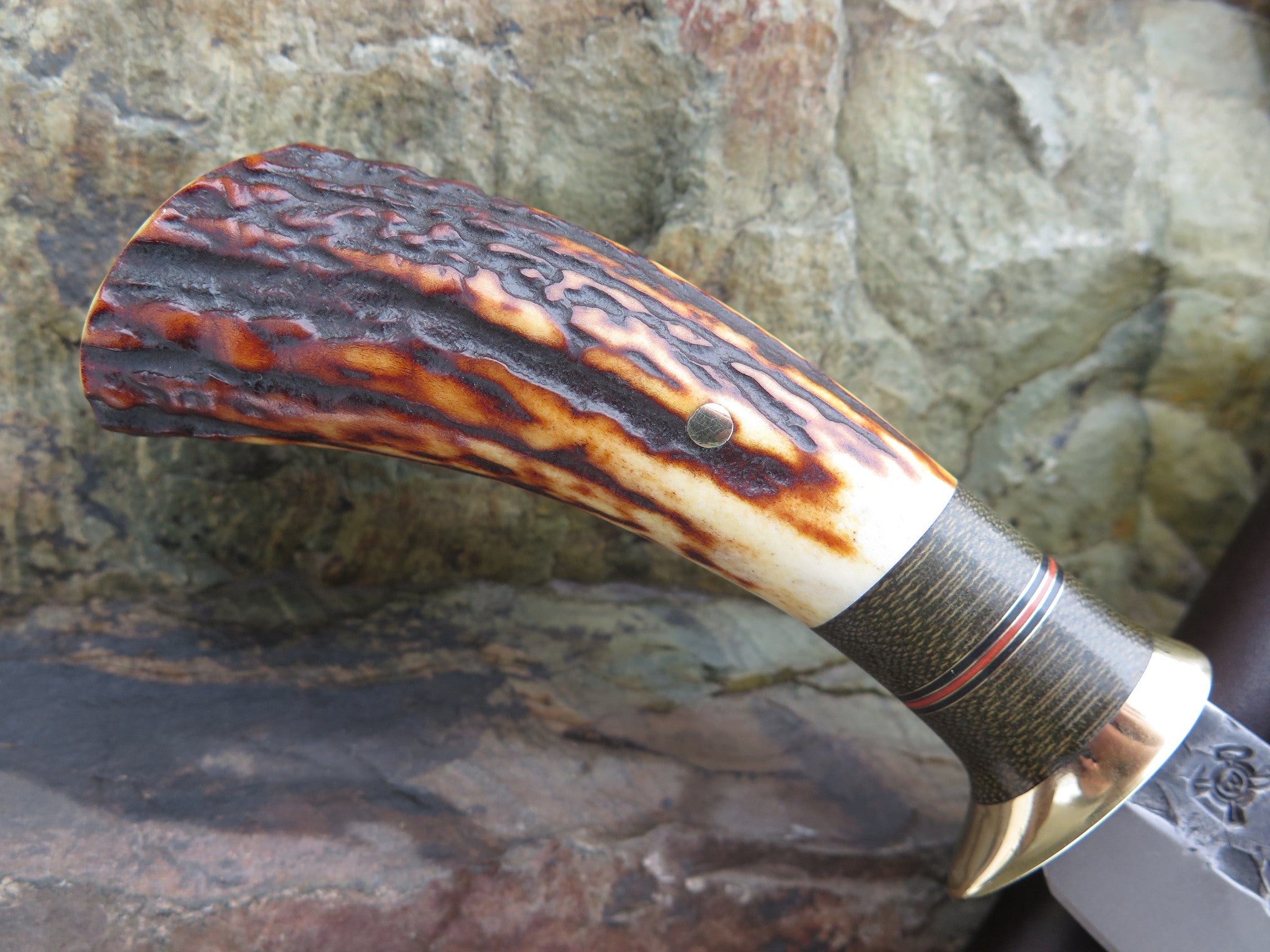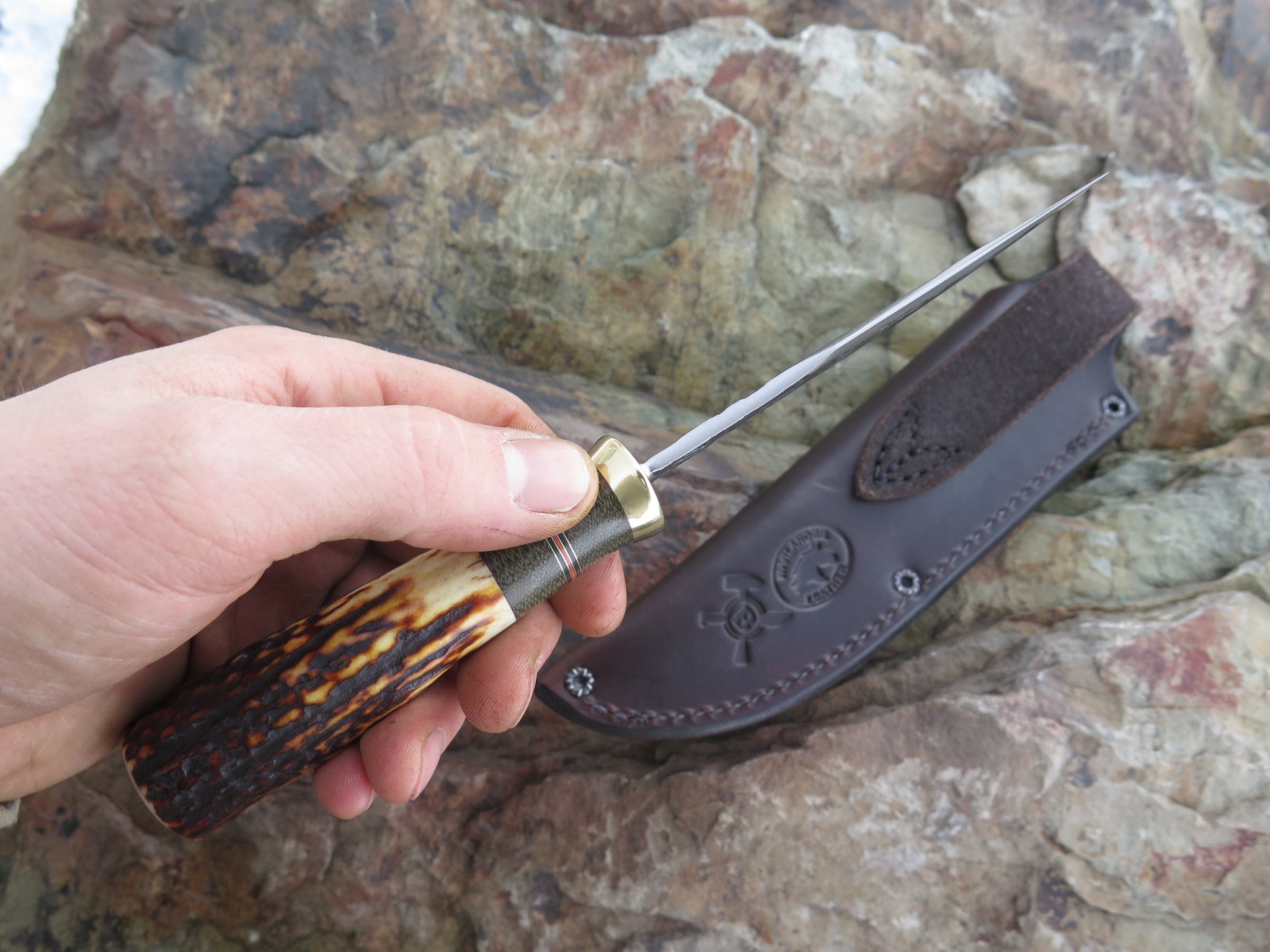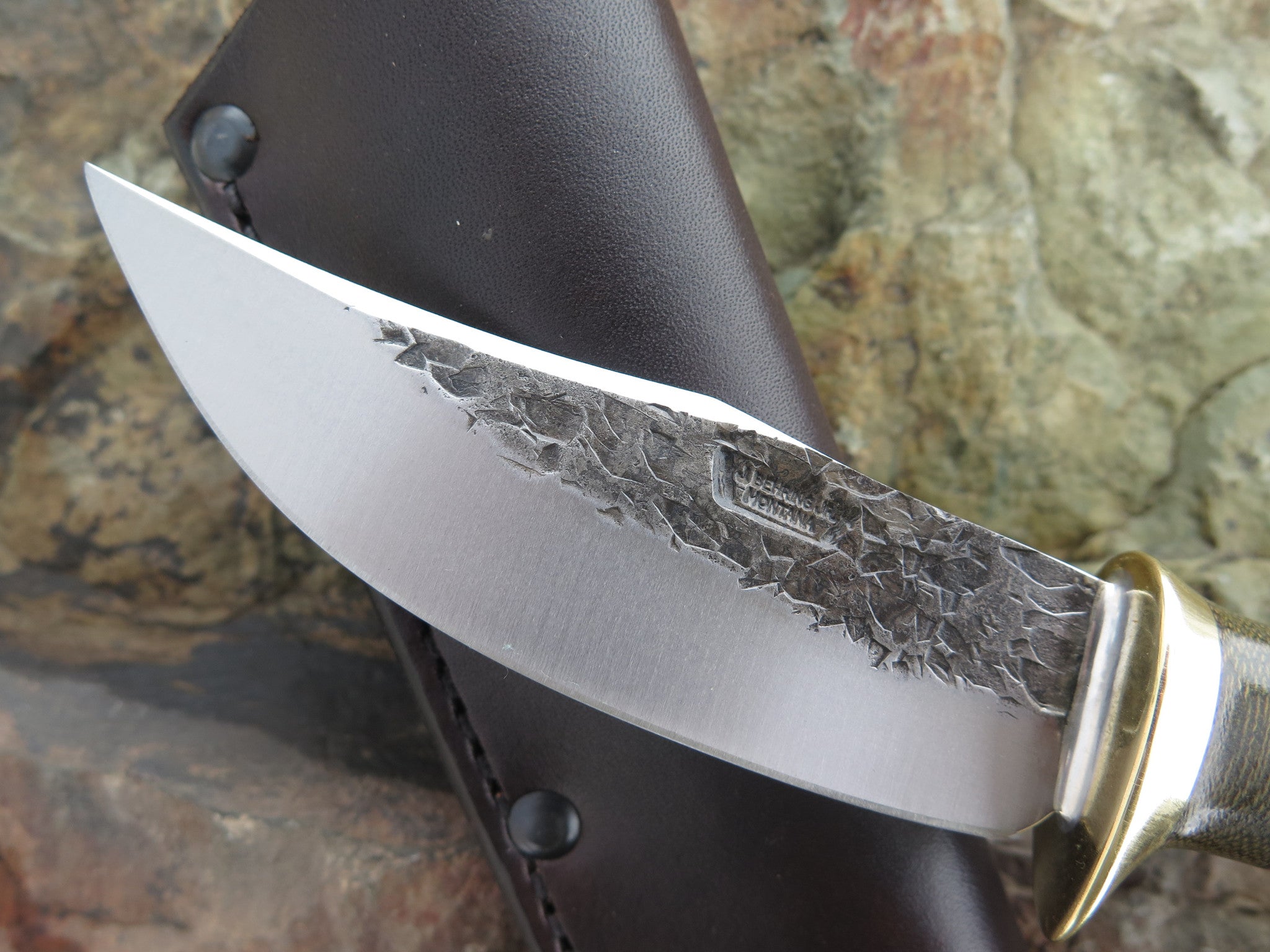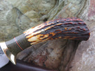 This new Clip Hunter from Behring Made is hand forged from 1/8" thick high carbon 01 tool steel and it measures 4 1/4" from tip to guard with a razor sharp hollow grind and a hammermark finish. The brass guard is soldered in place above black and maroon fiber, brass and green canvas micarta spacers that pop beautifully off the premium sambar stag handle that's pinned with brass. The overall length measures 8 3/8" and it comes in a custom pouch sheath from Warlander Leather.