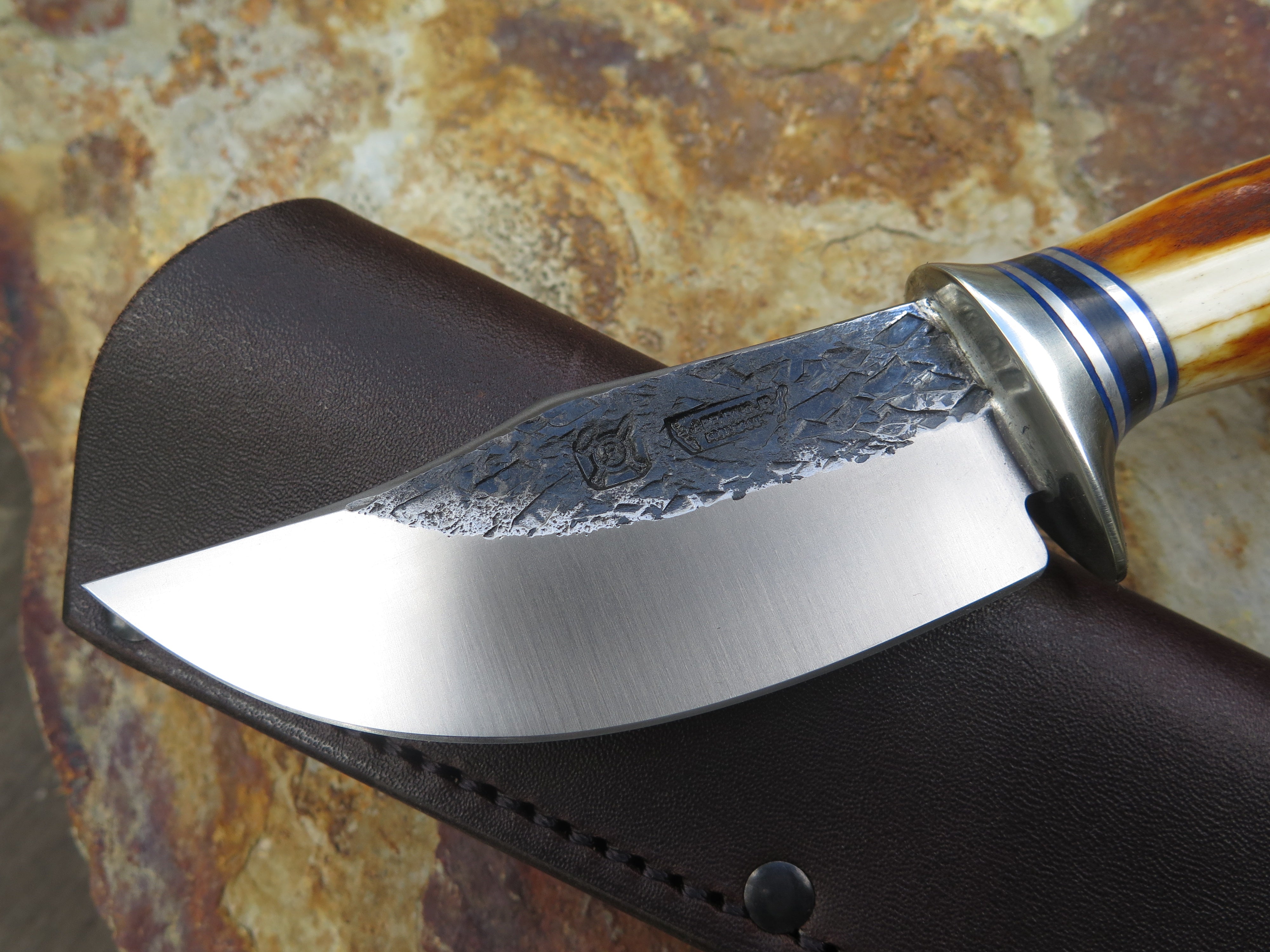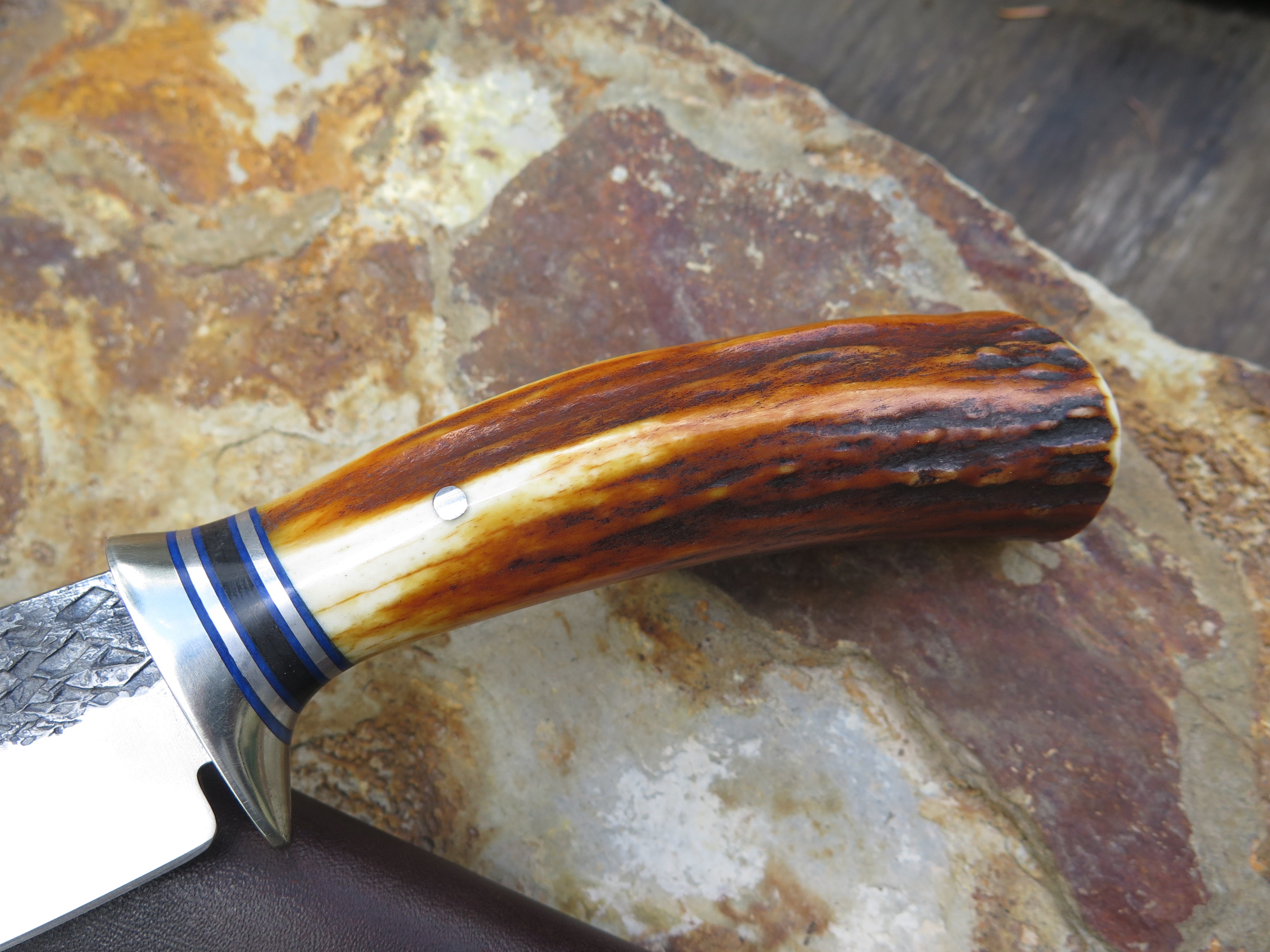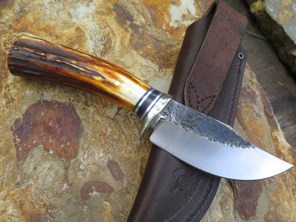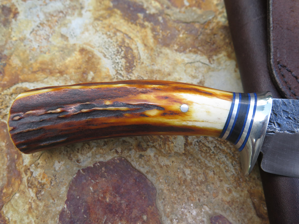 This beautiful new Clip Hunter from Behring Made© is hand forged from 3/16" thick high carbon 01 tool steel and it measures 4" from tip to guard with a razor sharp hollow grind and our hammermark finish. The nickel silver guard is soldered in place above black and blue fiber with aluminum spacers atop a premium sambar stag handle that's pinned through the tang with aluminum. The overall length measures 8 5/8" and it comes in a leather belt pouch sheath.