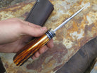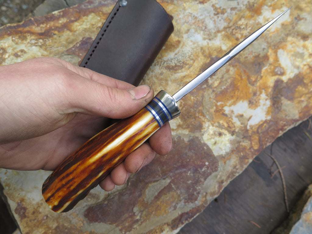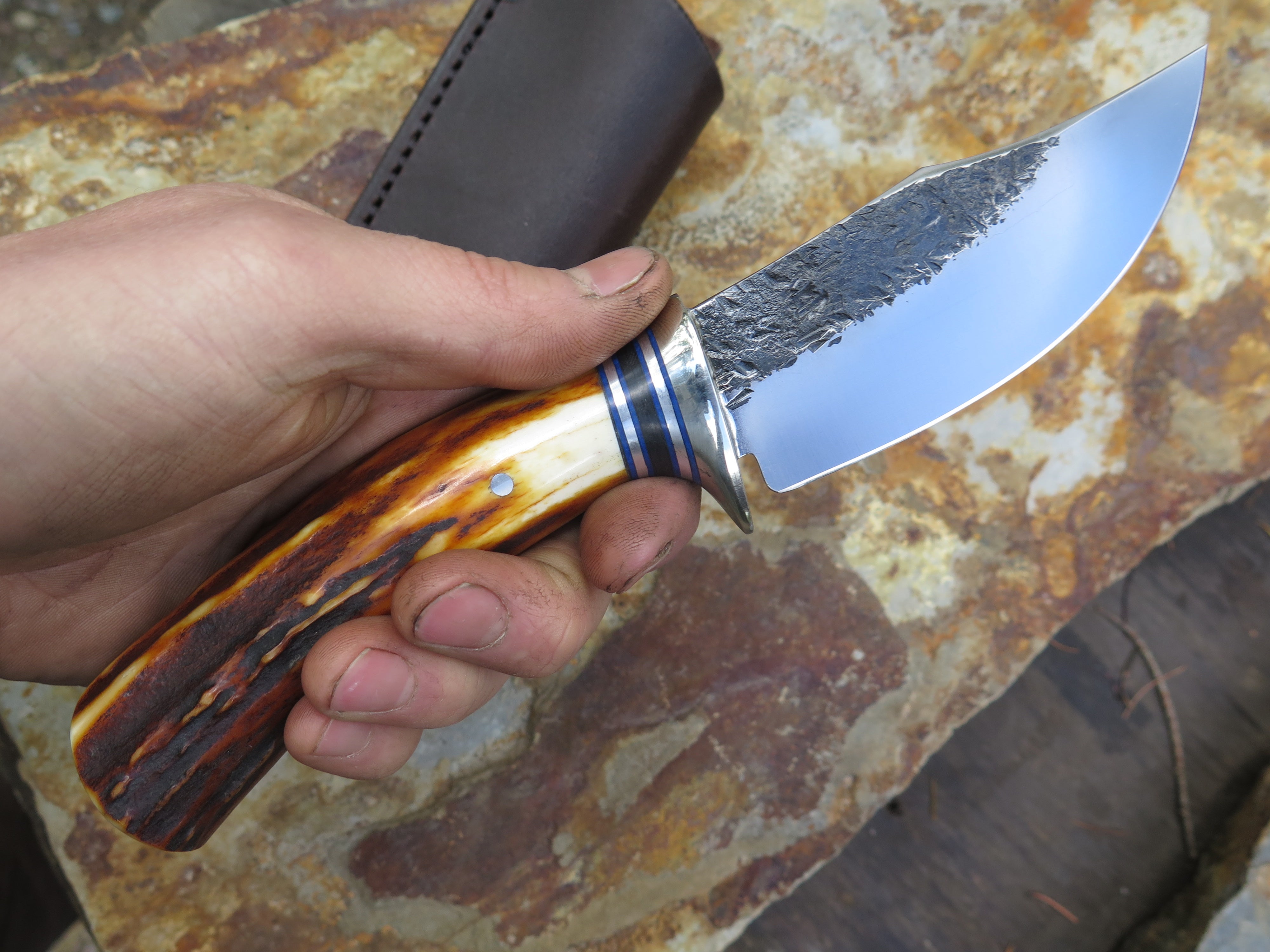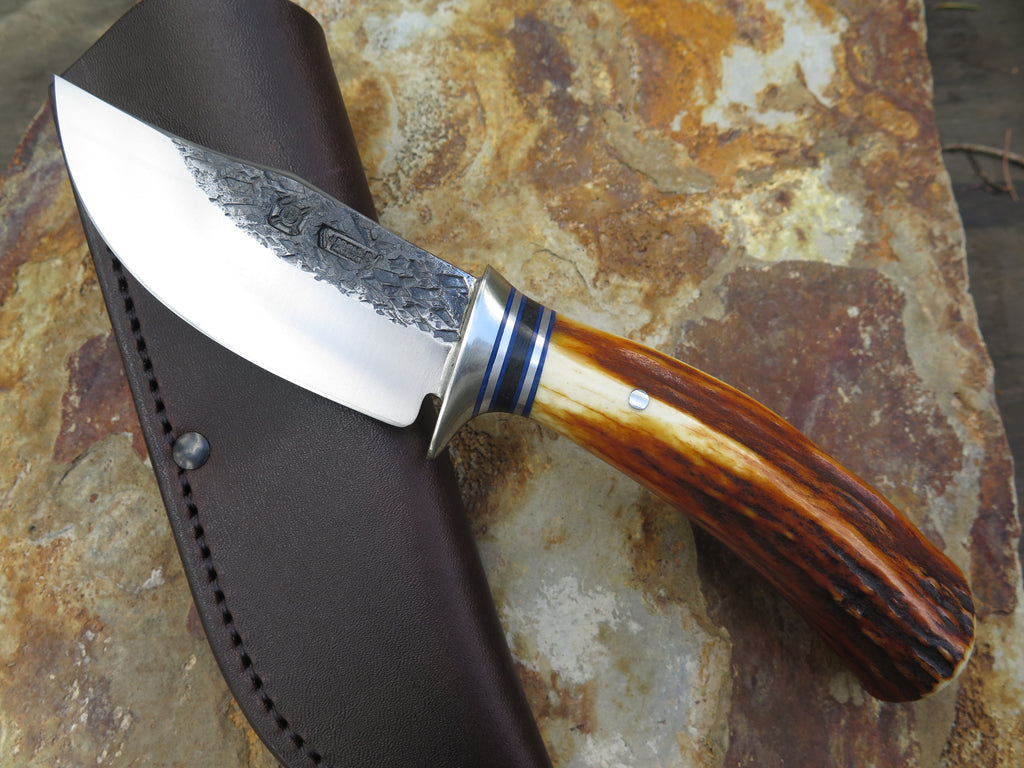 This beautiful new Clip Hunter from Behring Made© is hand forged from 3/16" thick high carbon 01 tool steel and it measures 4" from tip to guard with a razor sharp hollow grind and our hammermark finish. The nickel silver guard is soldered in place above black and blue fiber with aluminum spacers atop a premium sambar stag handle that's pinned through the tang with aluminum. The overall length measures 8 5/8" and it comes in a leather belt pouch sheath.