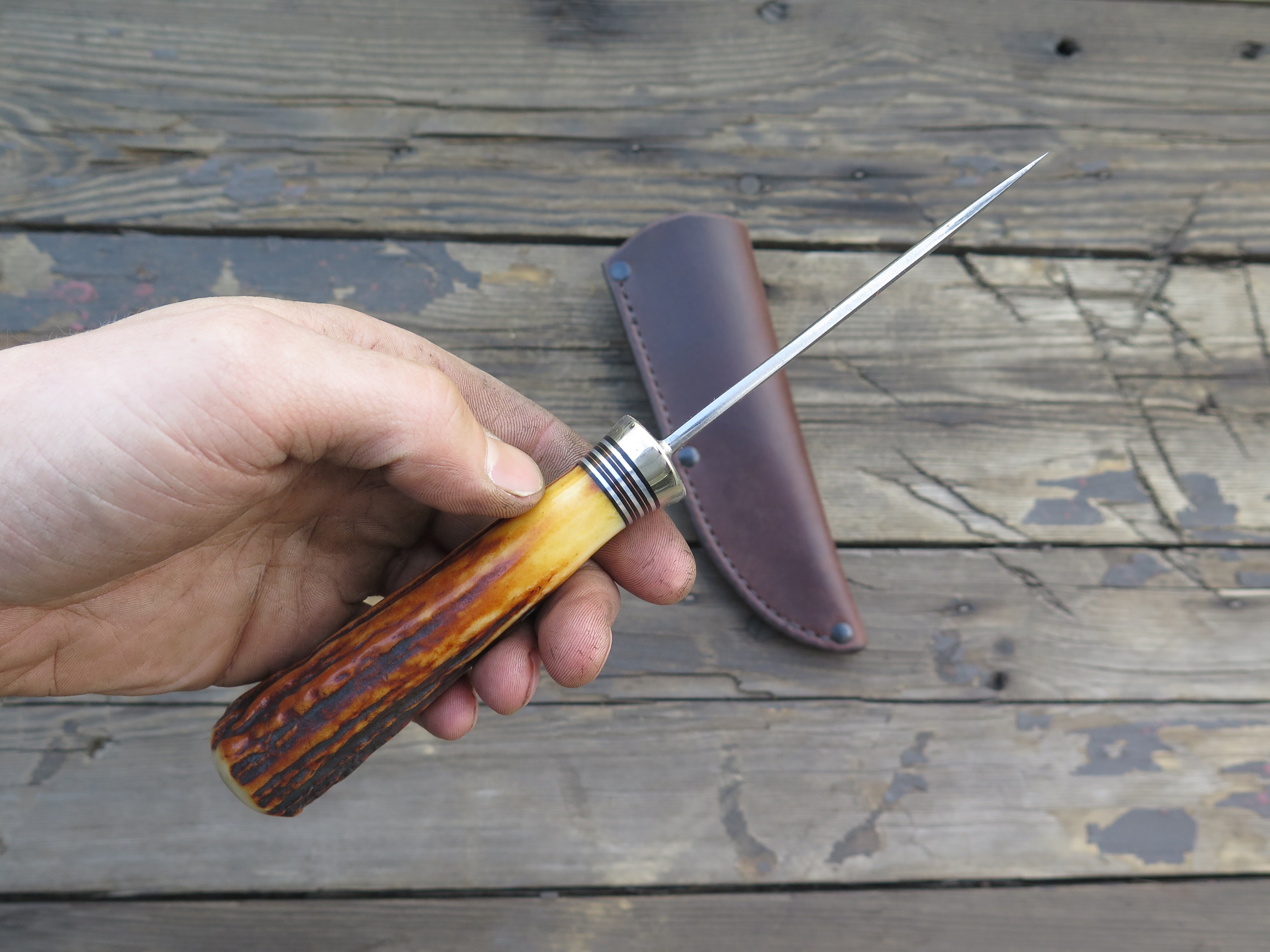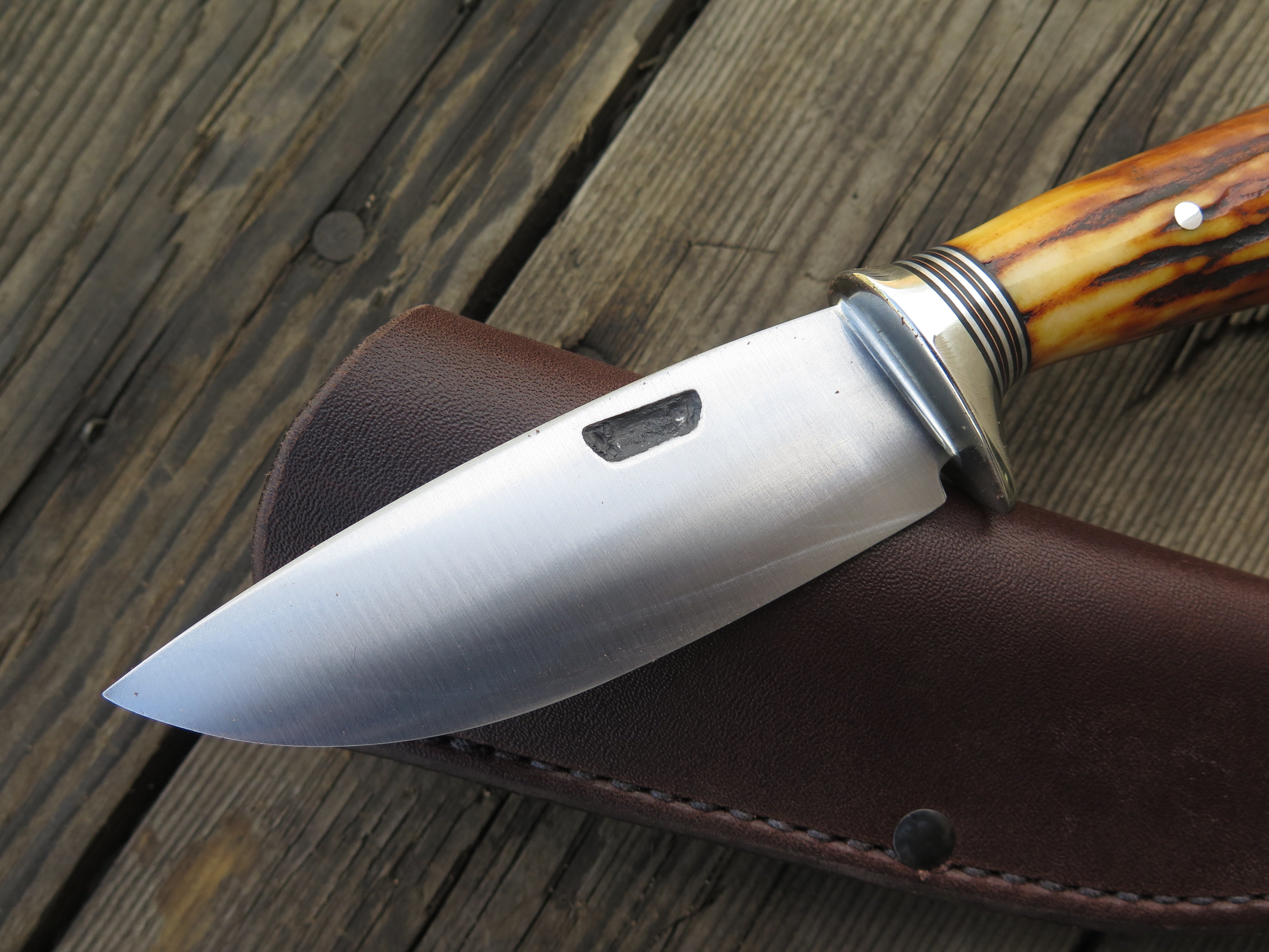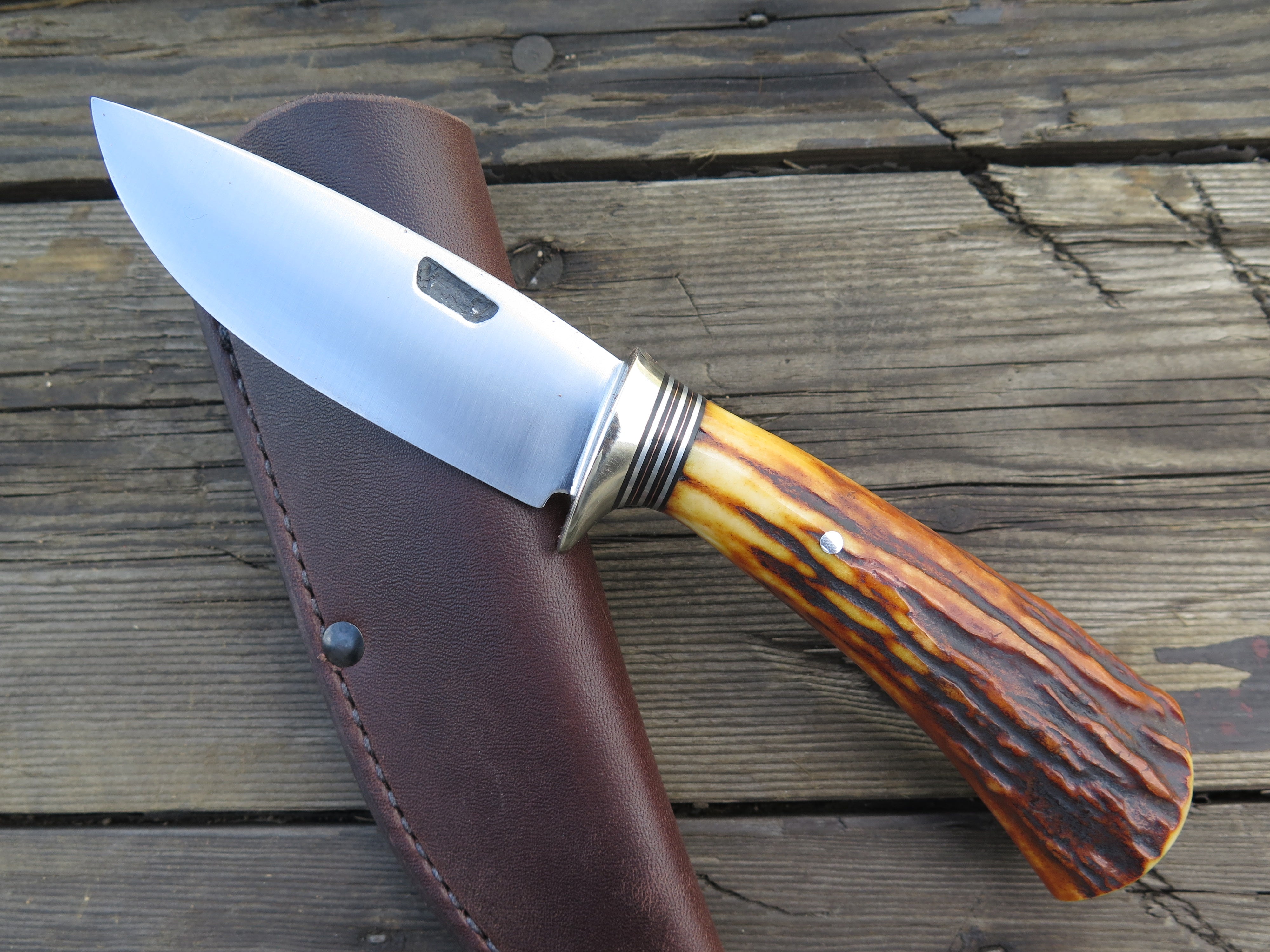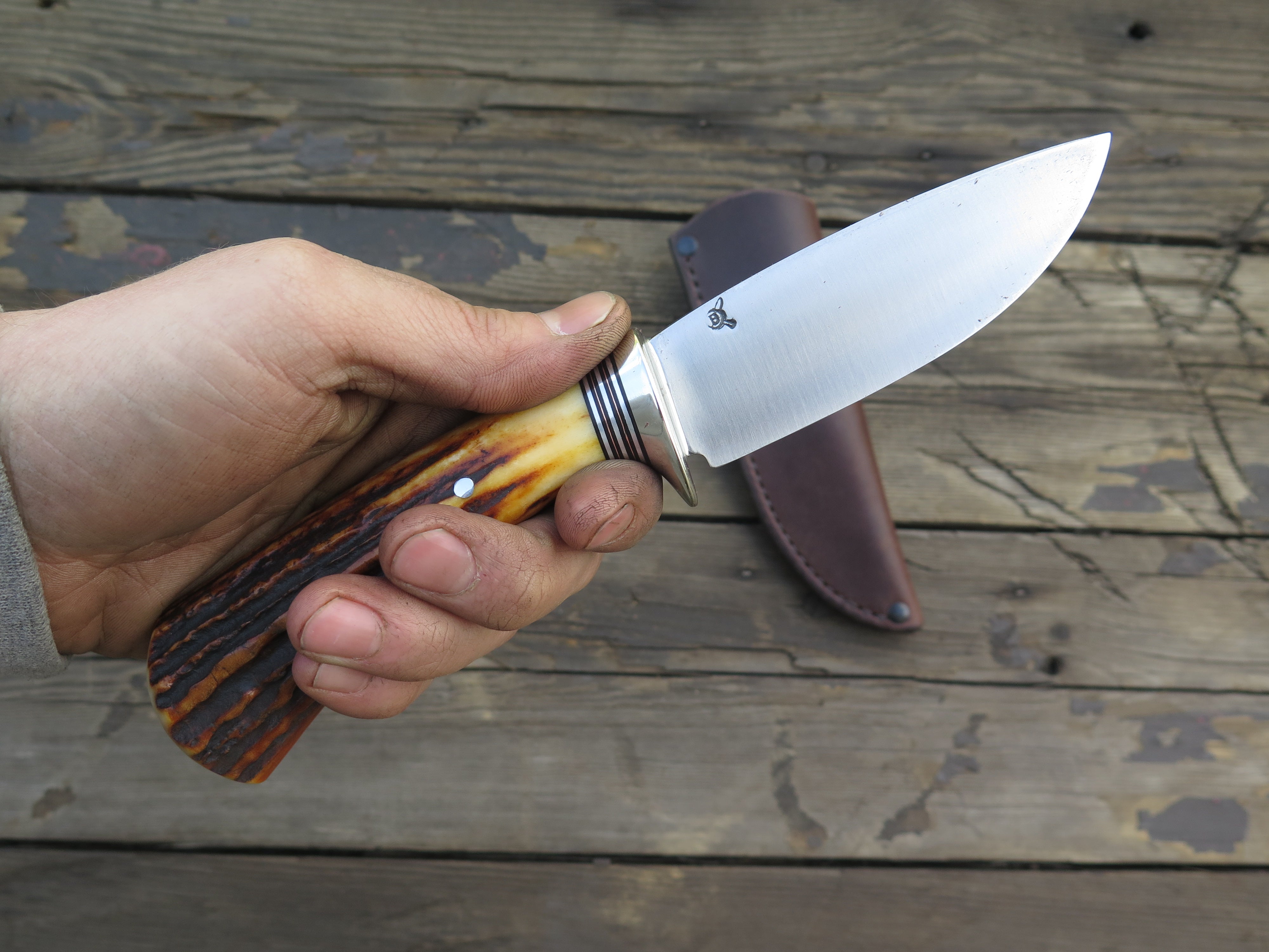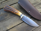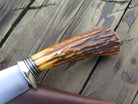 This beautiful new Behring Made™ Drop Point is hand forged from 1/8" thick high carbon 01 tool steel and it measures 4" from tip to guard with a razor sharp convex grind that won't quit! The nickel silver guard is soldered in place above black fiber, copper and aluminum spacers as well as a premium sambar stag handle that's pinned through the tang with aluminum. The overall length measures 8 3/8" and it comes in a Warlander Leather pouch sheath.
