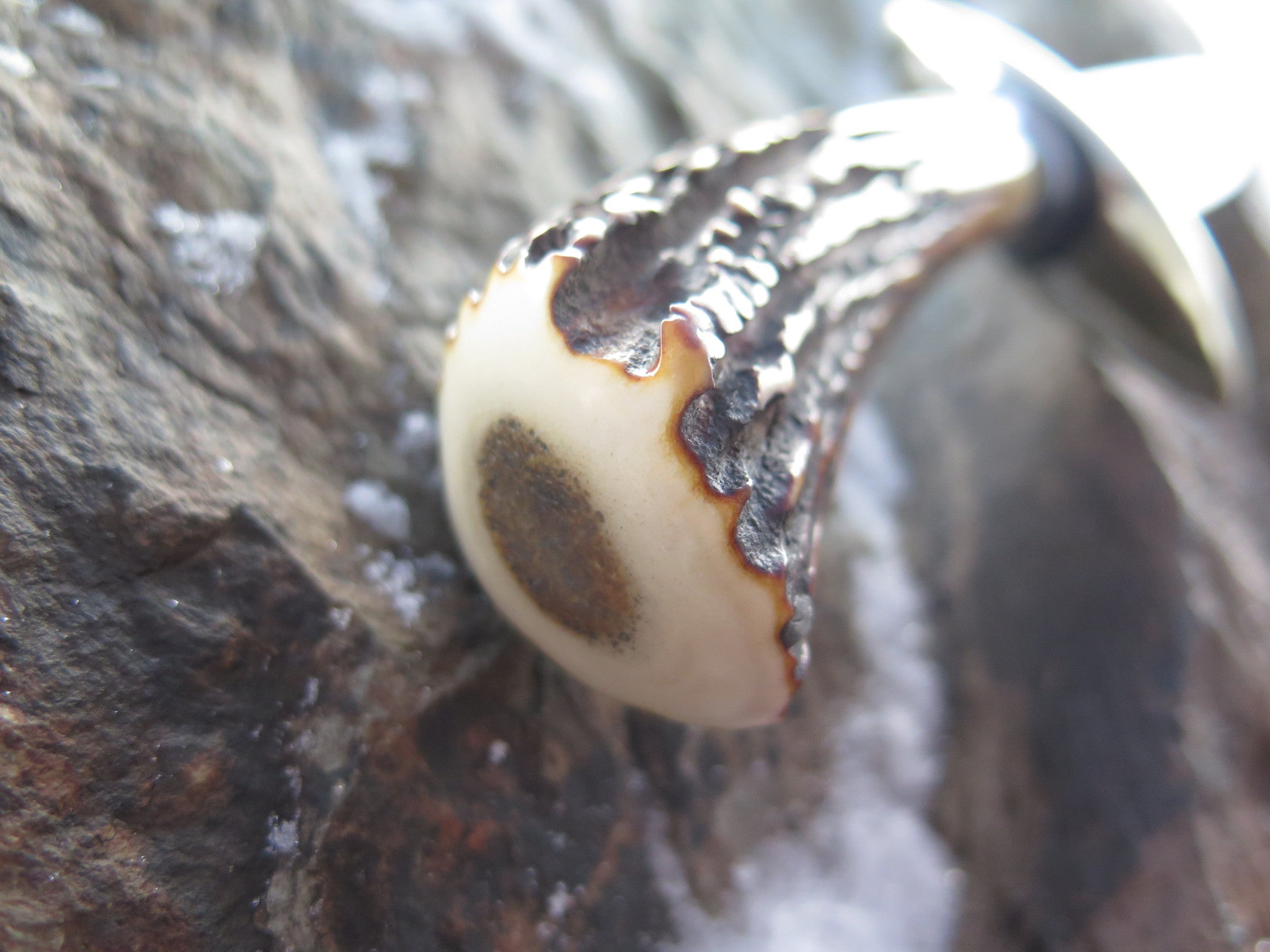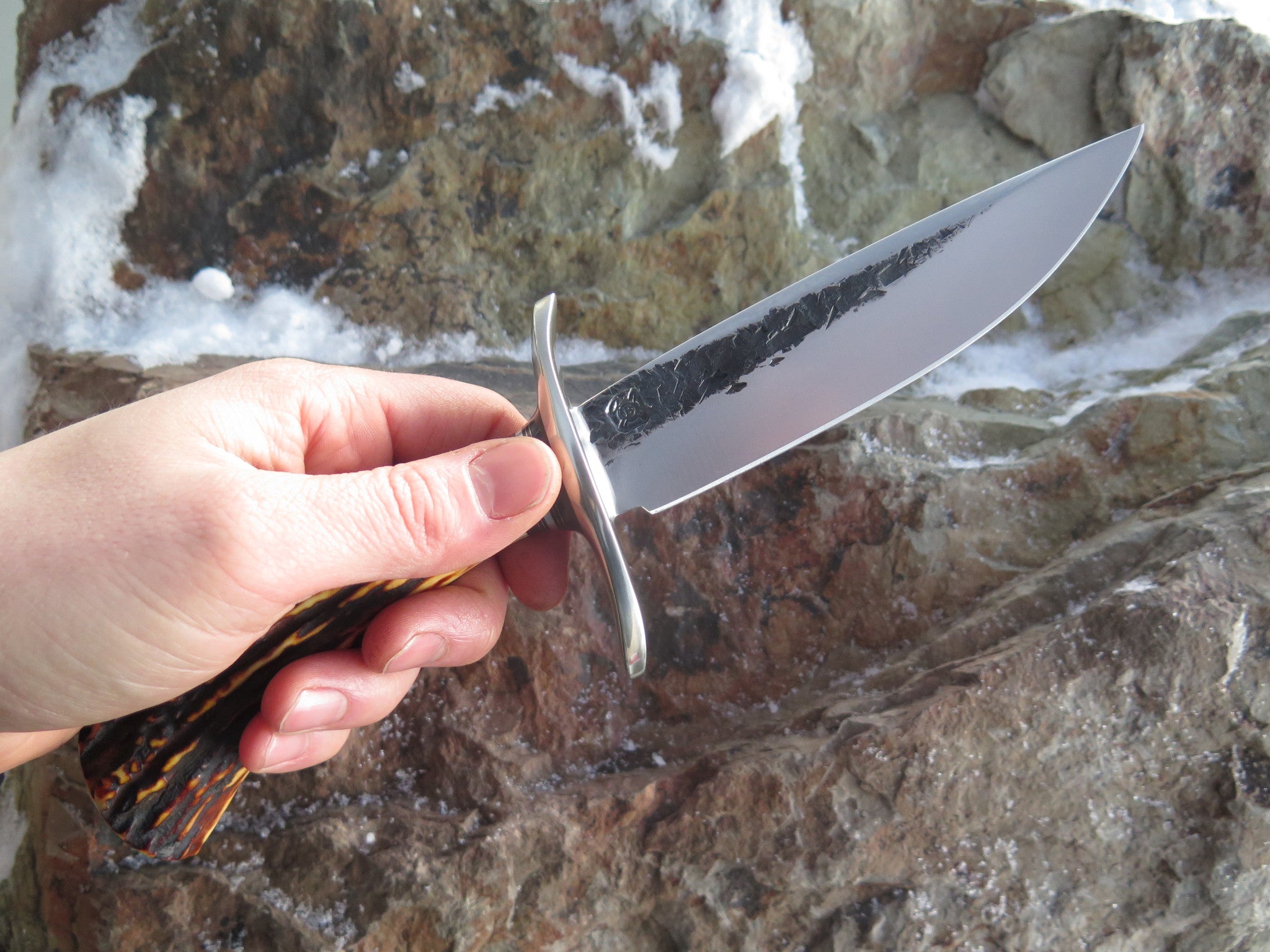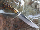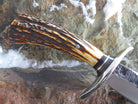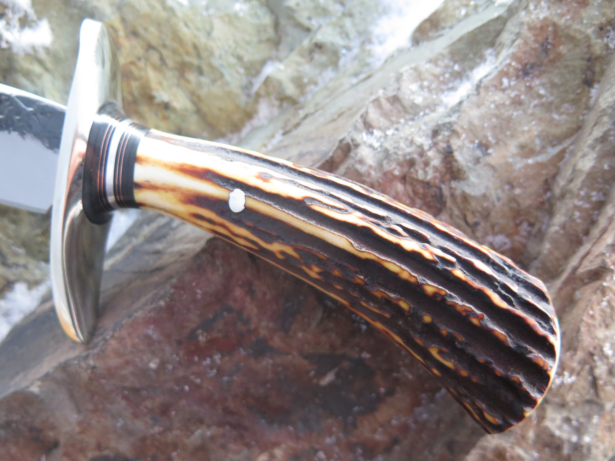 This bad ass new Fighter from Behring Made is hand forged from 3/16" thick high carbon steel and it measures 5 1/2" from tip to guard with a razor sharp hollow grind and a hammermark finish. The forged nickel silver s-guard is soldered in place above black fiber, copper and aluminum spacers. The handle is a sambar stag-collector's dream with bright reds to light creams and dark browns, not to mention the remarkable texture. The overall length measures 10 3/8" and it comes in a custom sheath from Rowe's Leather.