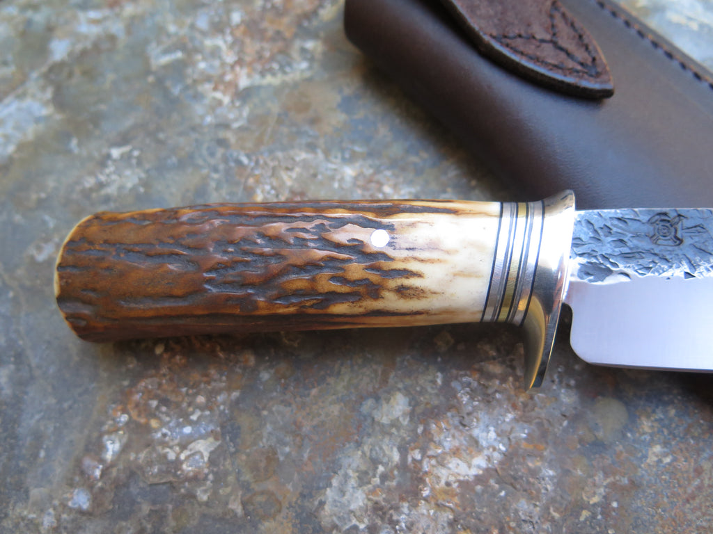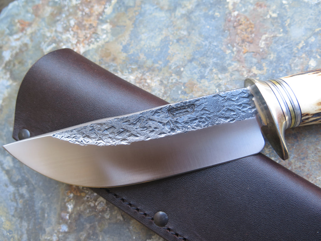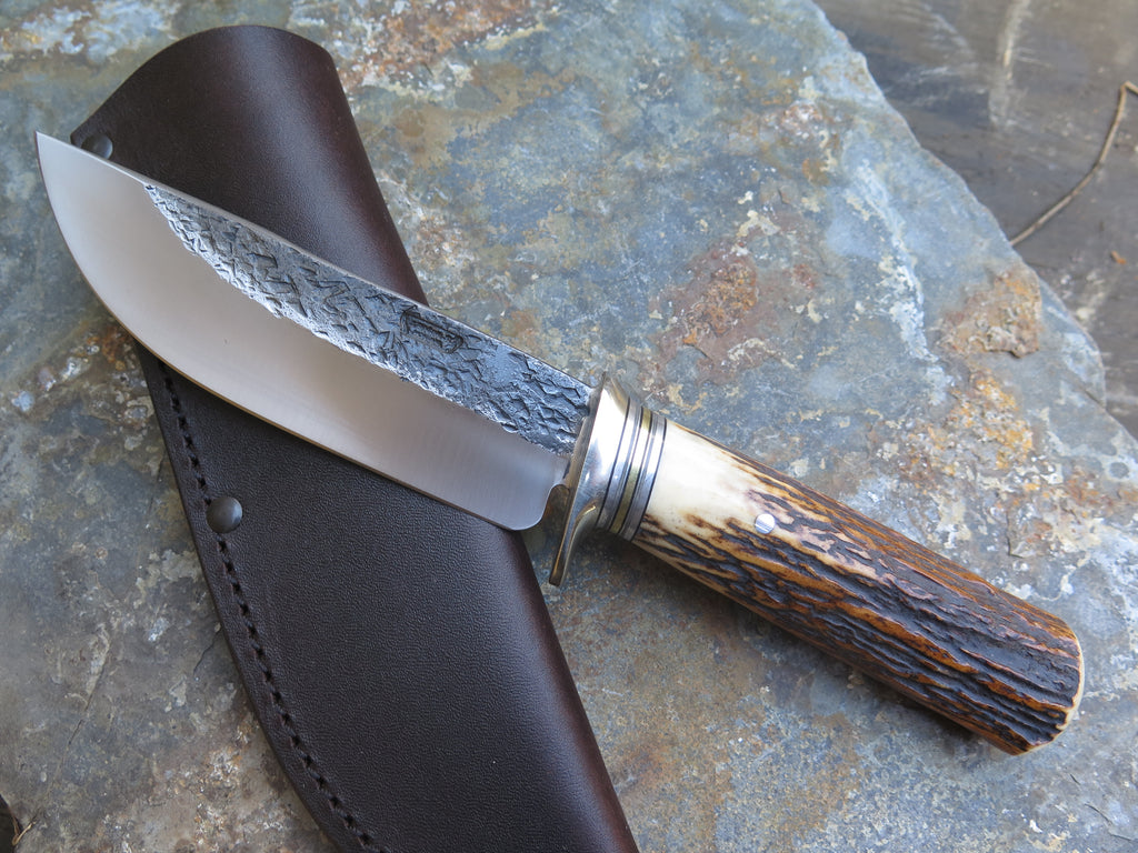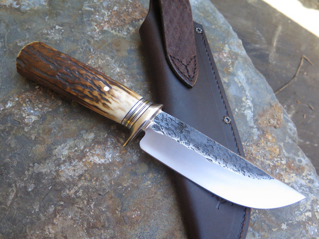This classic Hunter from Behring Made© is hand forged from 3/16" thick high carbon 01 tool steel and it measures 5 1/2" from tip to guard with a razor sharp hollow grind and our hammermark finish. The nickel silver guard is soldered in place above black and gray fiber, aluminum and brass spacers as well as a premium sambar stag handle that's pinned through the tang with brass. The overall length measures 10 1/8" and it comes in a leather belt pouch sheath.