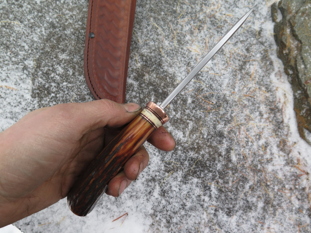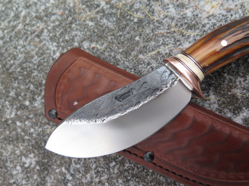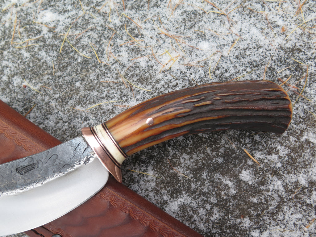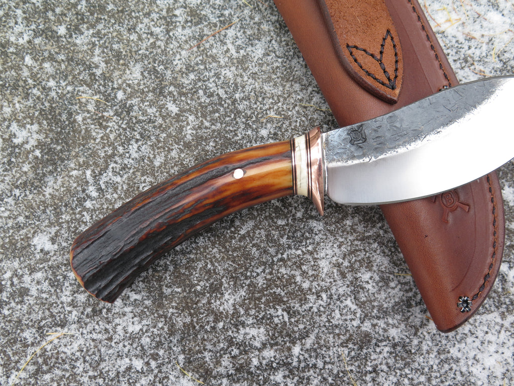 This beautiful new Nessmuk from Behring Made© is hand forged from 3/16" thick high carbon 01 tool steel and measures 4 1/2" from tip to guard with a razor sharp hollow grind and our hammermark finish. The copper guard is soldered in place above black fiber, copper and ancient mammoth ivory spacers as well as a premium sambar stag handle that's pinned through the tang with copper. The overall length measures right under 8 3/4" and it comes in a premium leather belt pouch sheath, though substitutions are available upon request.