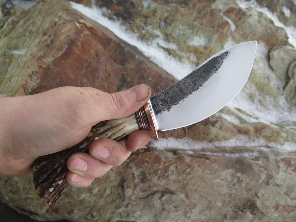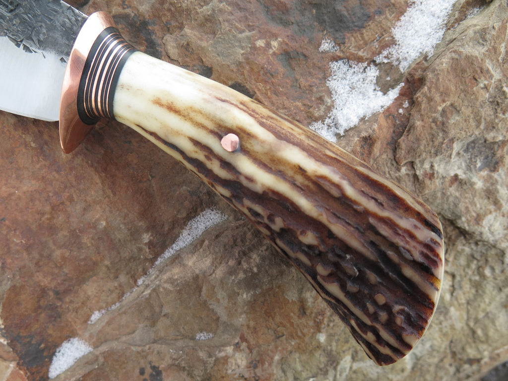 This incredible new Behring Made Nessmuk is hand forged from 3/16" thick high carbon tool steel and it measures 4 1/2" from tip to guard with a razor sharp hollow grind and a hammermark finish. The copper guard is soldered in place above black fiber and copper spacers that are a wonderful accent to to the premium sambar stag handle that is pinned with copper. The overall length measures 9" and it will come in a pouch sheath from Warlander Leather.