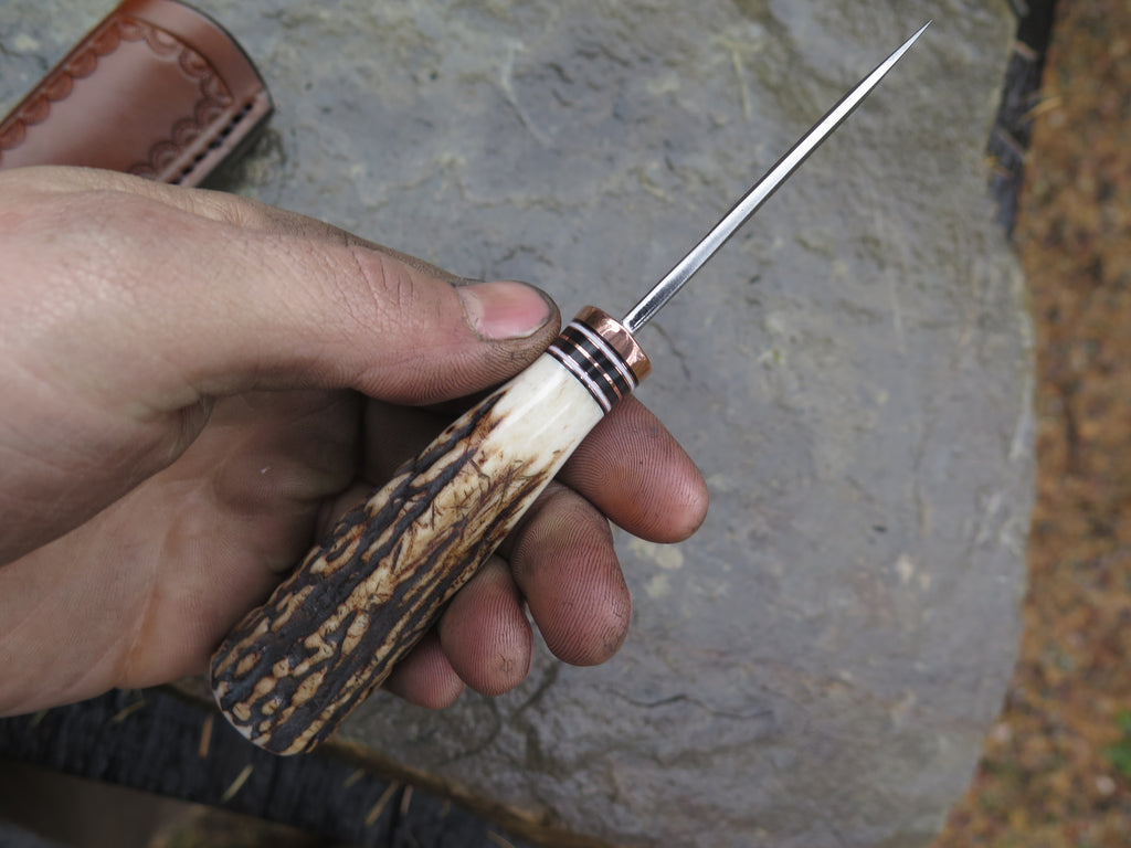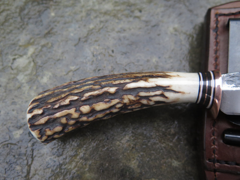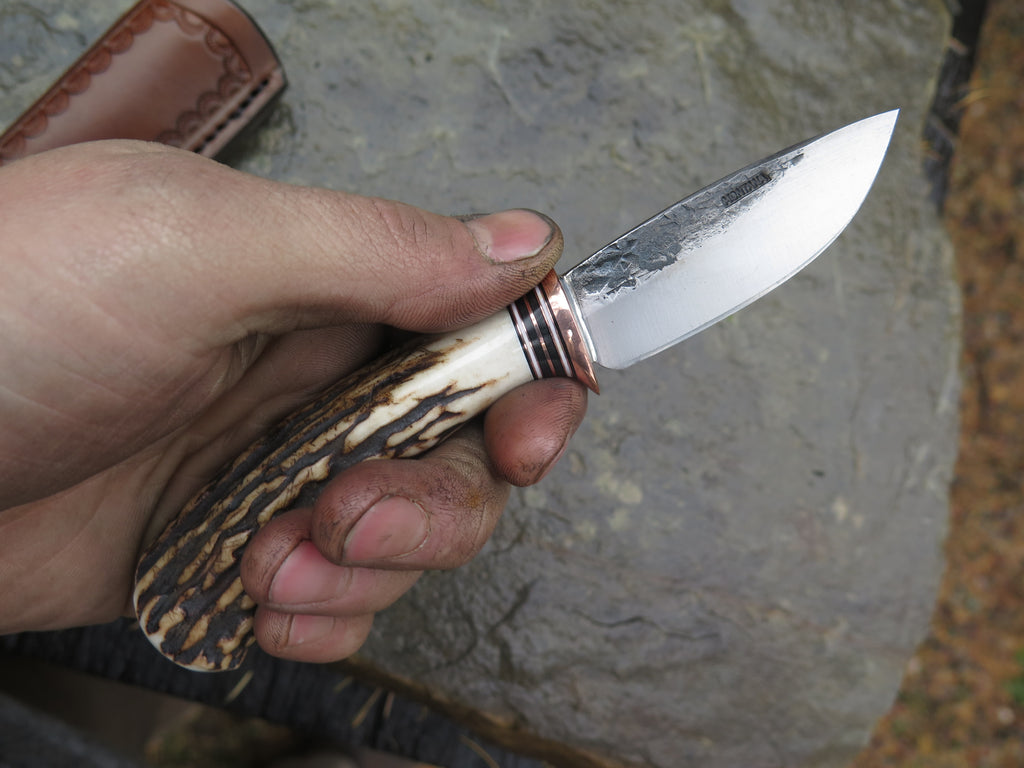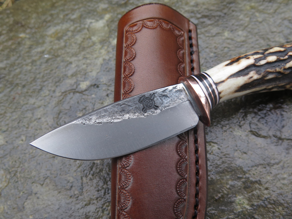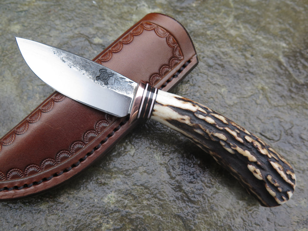 This beautiful new drop point style pocket knife from Behring Made© is hand forged from 1/8" thick high carbon 01 tool steel and it measures 2 3/4" from tip to guard with a razor sharp hollow grind and our hammermark finish. The copper guard is soldered in place above black and white fiber with copper spacers. The premium sambar stag handle has a wonderful texture and brings the overall length to measure 6 1/4". The sheath is outfitted with a spring clip and is intended to ride inside the right hand pocket of your jeans.