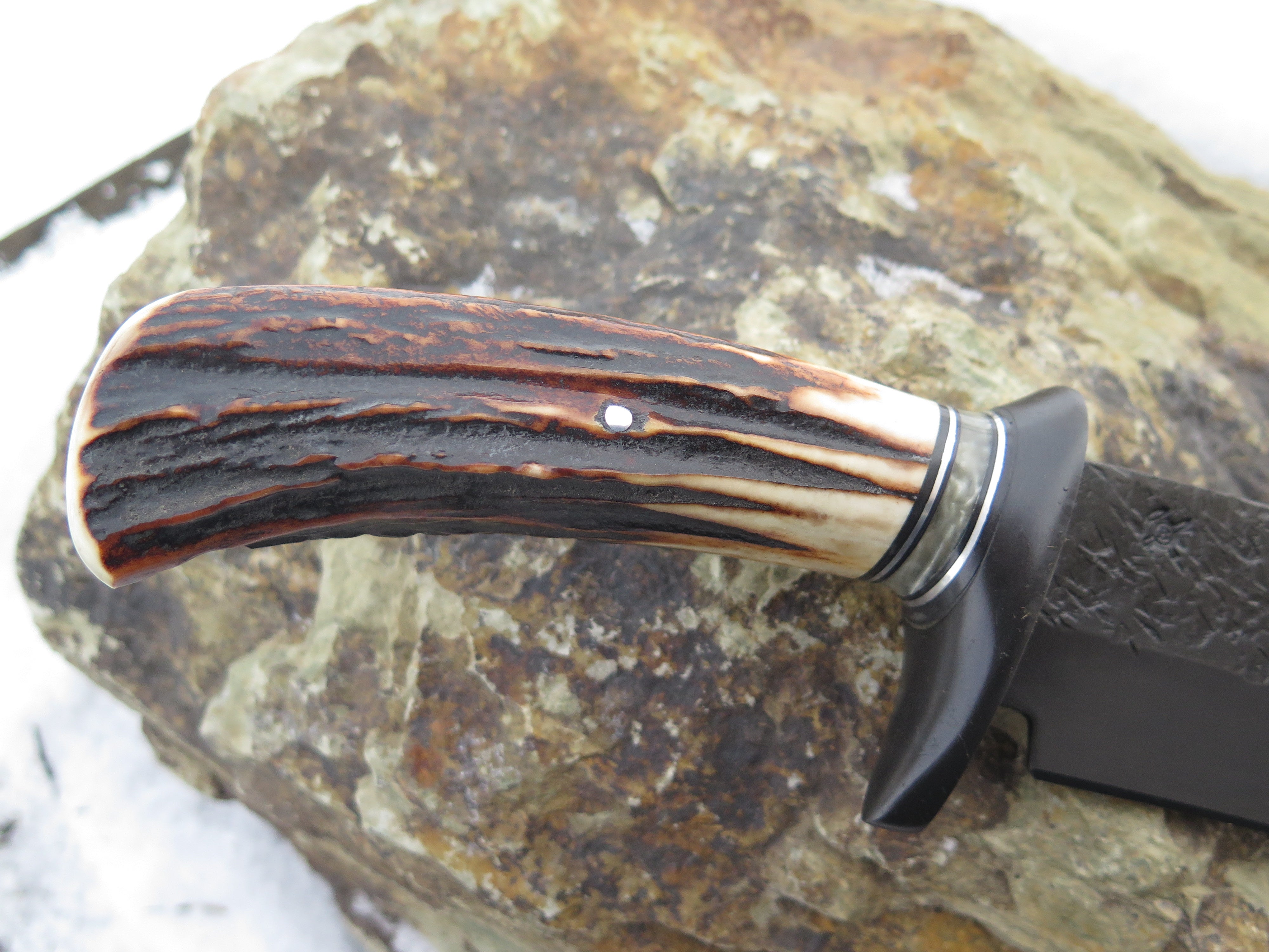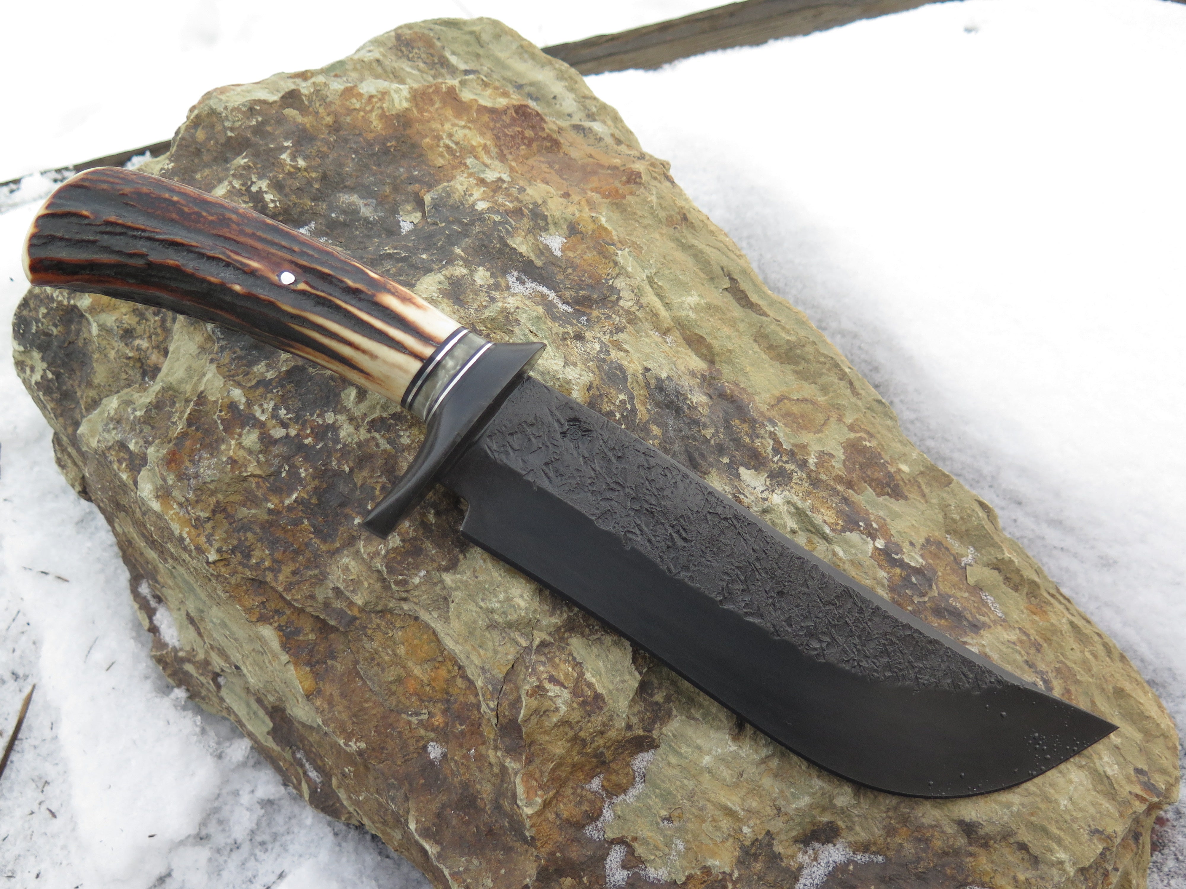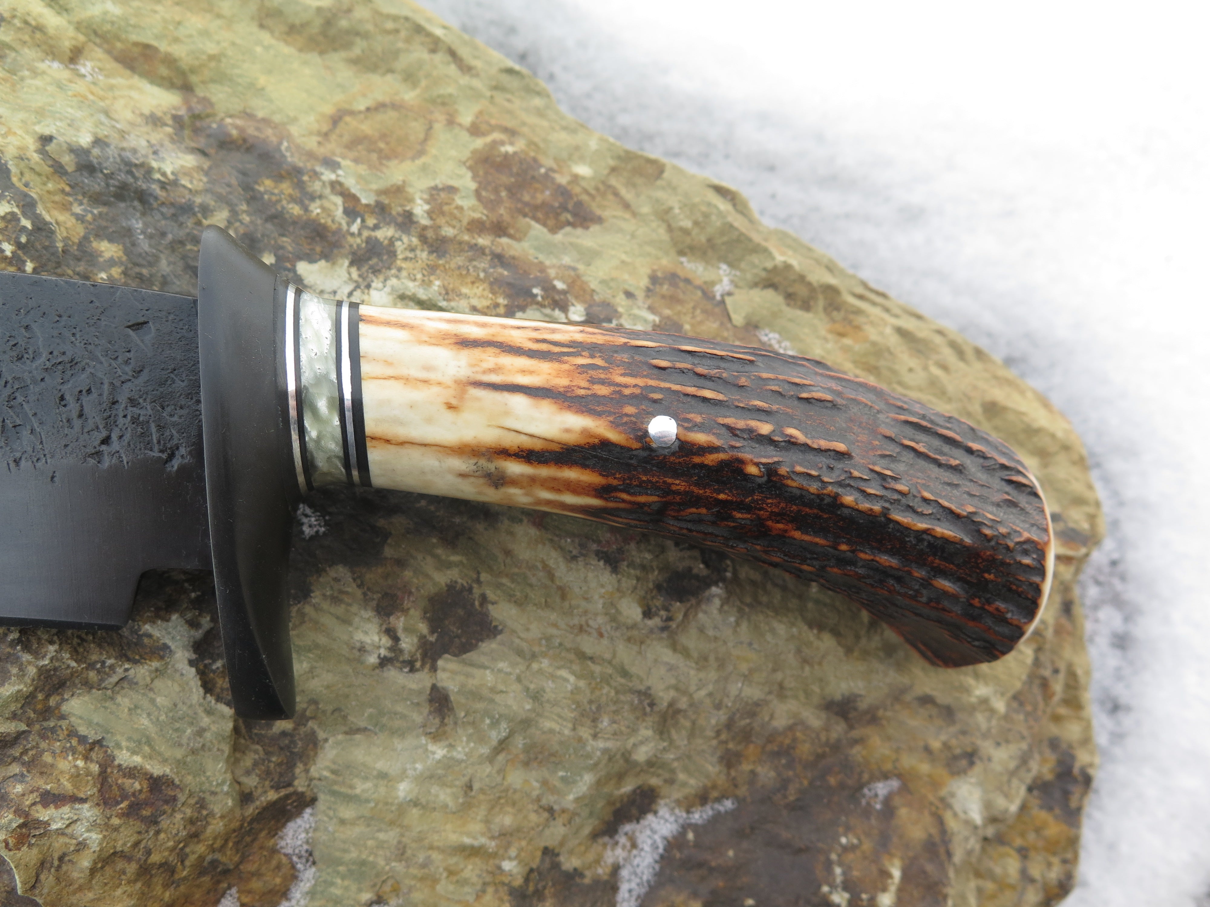 This bad ass new Recurve Camp Knife from Behring Made™ is hand forged from 1/4" thick 5160 spring steel and it measures 8 1/4" from tip to guard with a razor sharp hollow grind with our hammermarks and forced patina blued finish. The blued steel guard is soldered in place above black fiber, aluminum and musk ox boss spacers as well as a premium hand-selected sambar stag handle. We pinned through the tang with aluminum for a rock solid construction and it measures 13 1/2" overall. This one will come in a custom sheath from Warlander Leather as well.