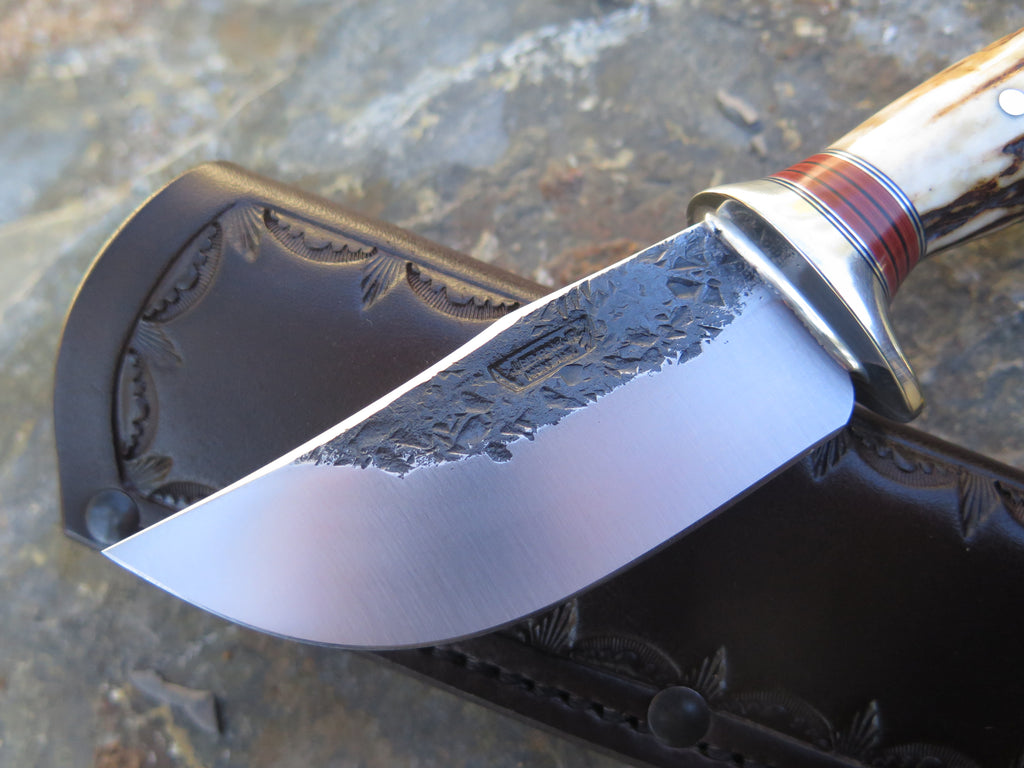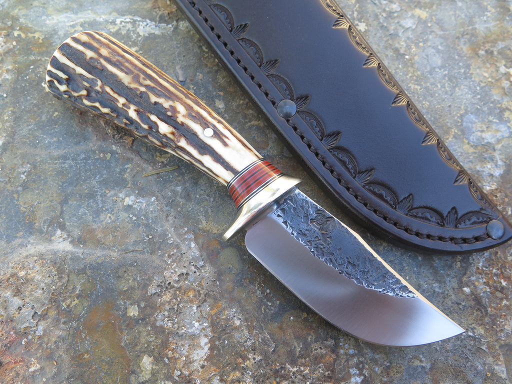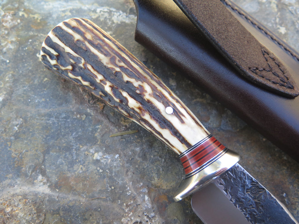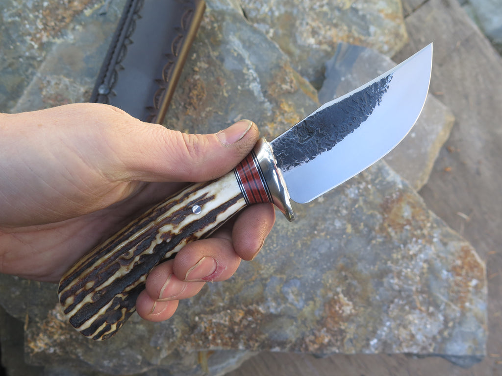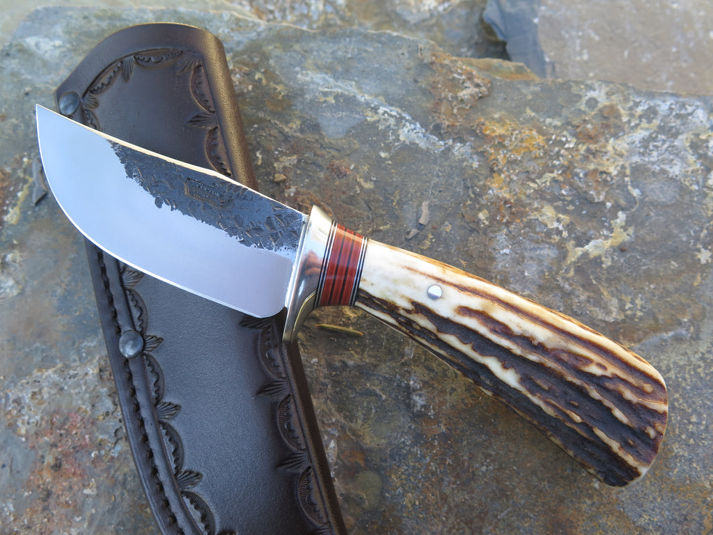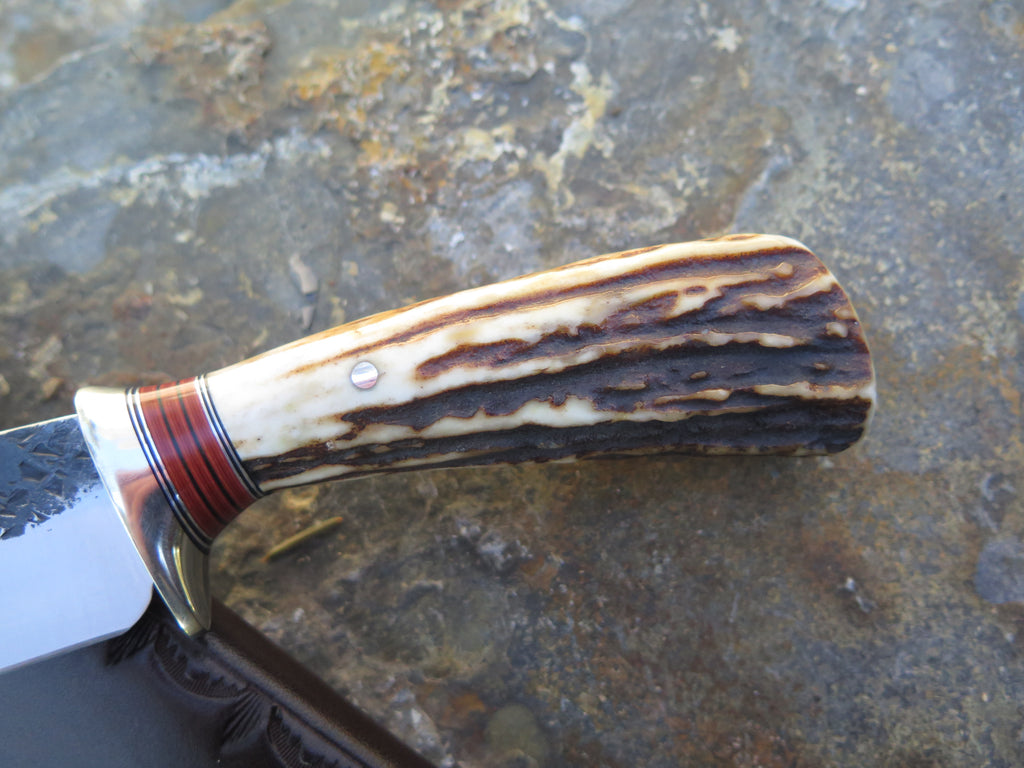 This beautiful new Behring Made© Sharptail is hand forged out of 3/16" thick high carbon 01 tool steel and it measures 3 1/2" from tip to guard with a razor sharp hollow grind and our hammermark finish. The nickel silver guard is soldered in place above black, maroon and aluminum spacers as well as a premium sambar stag handle that's pinned through the tang with aluminum. The overall length measures 7 3/4" and this one comes in a border tooled leather belt pouch sheath.