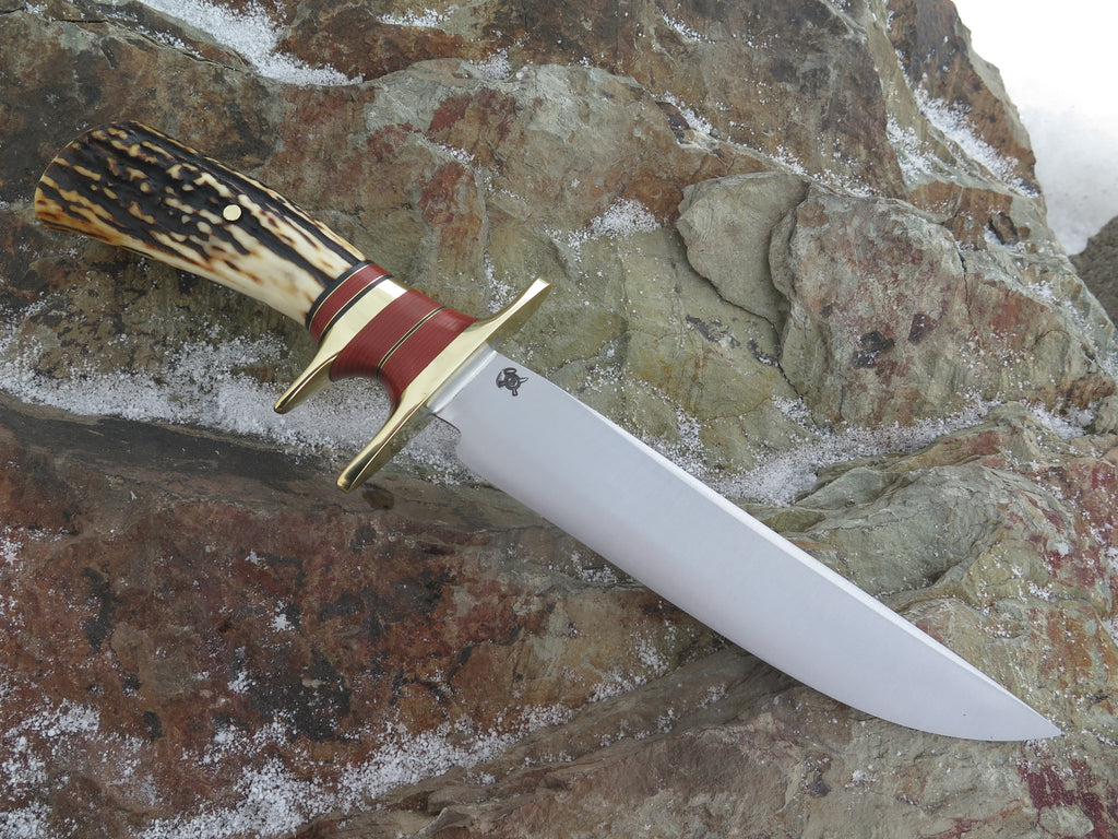 This beautiful new Fighter from Behring Made is hand forged from 3/16" thick high carbon 01 tool steel and it measures 7 1/2" with a razor sharp convex grind. The tall brass guard is soldered in place above maroon and black fiber and brass spacers with a bad ass brass sub-hilt that is unbelievably comfortable in hand. The premium sambar stag handle features a texture that will drive the true stag-lover wild. The overall length measures 12 1/2" and will come in a custom sheath from Warlander Leather.