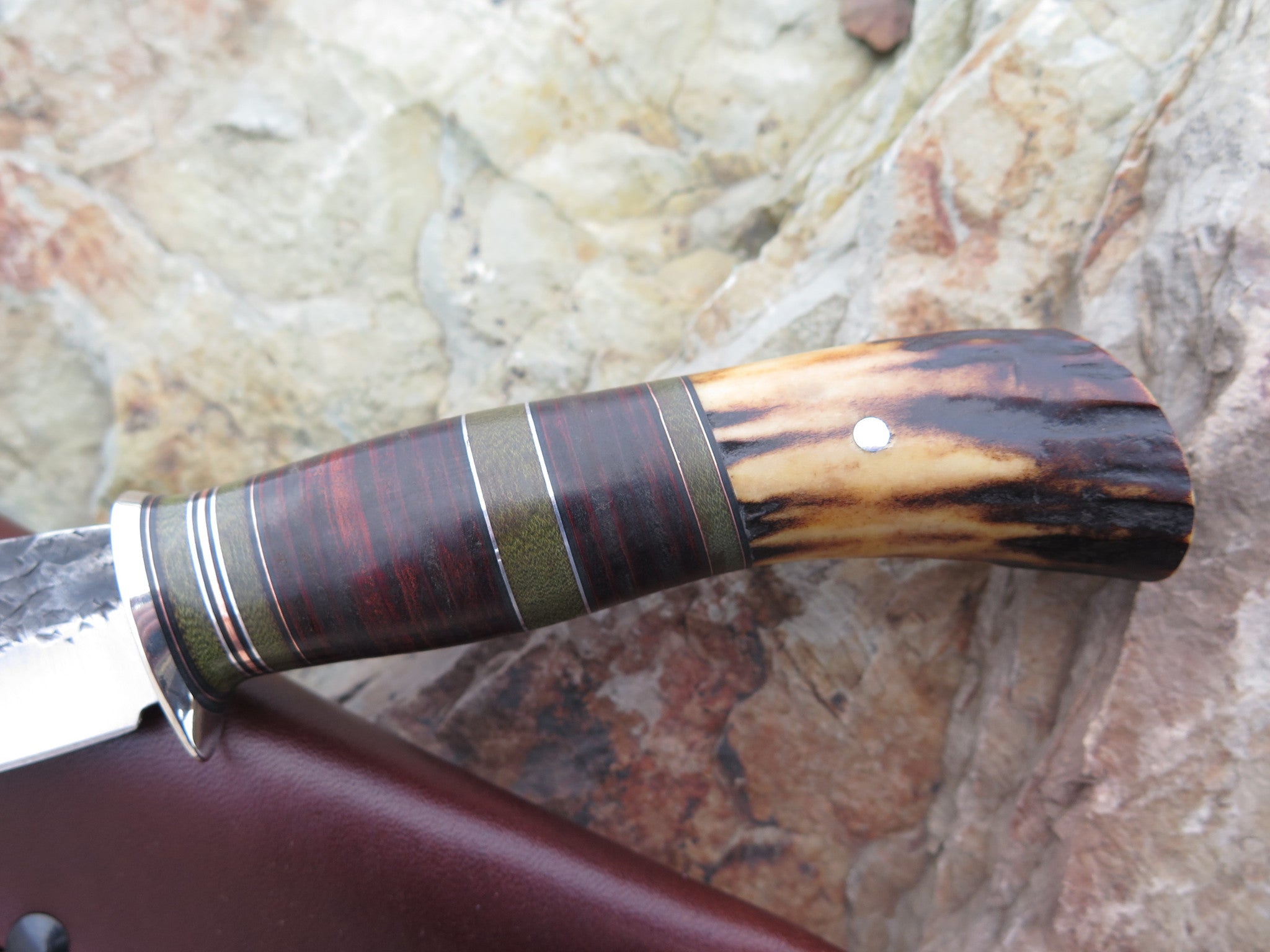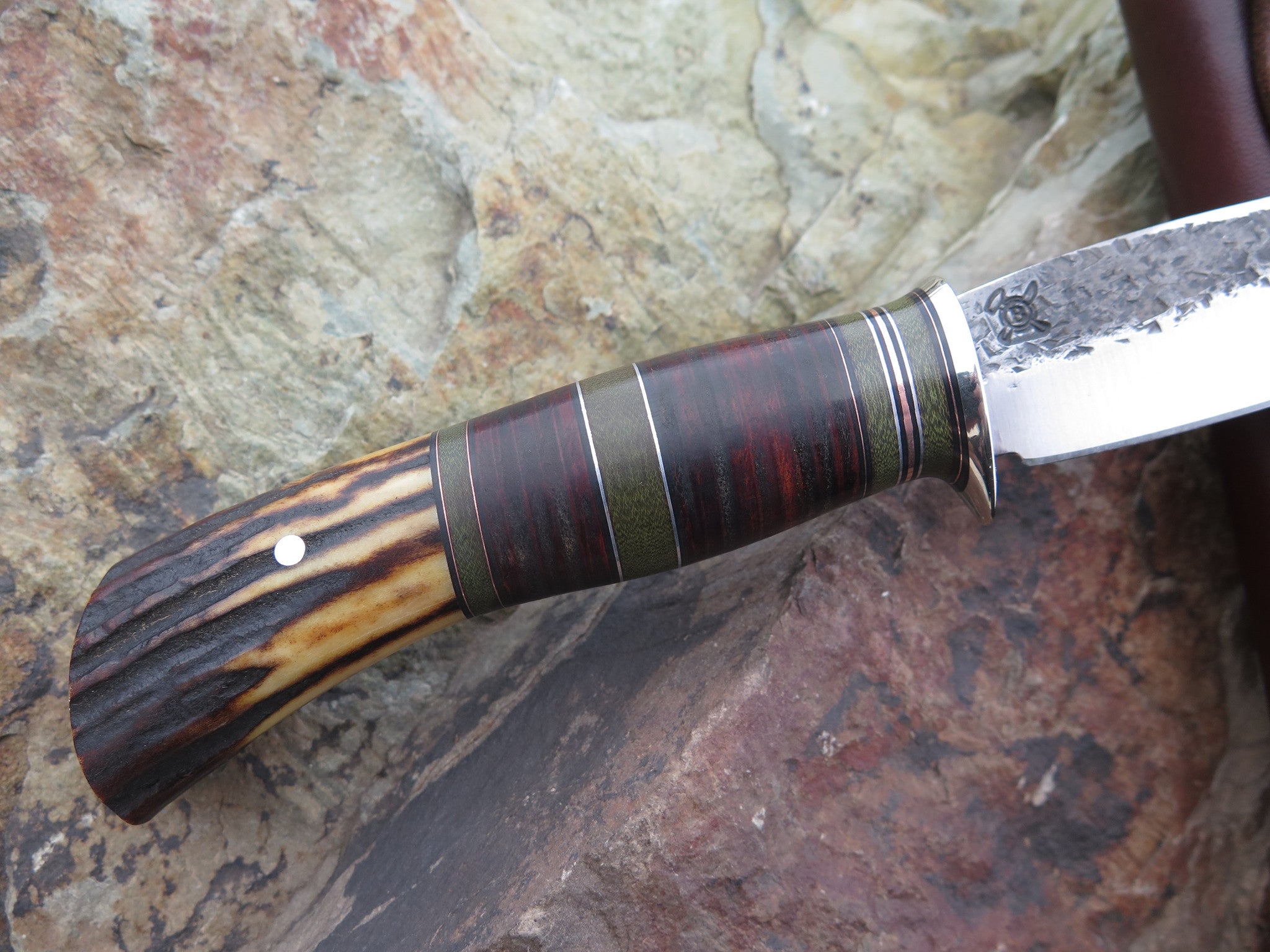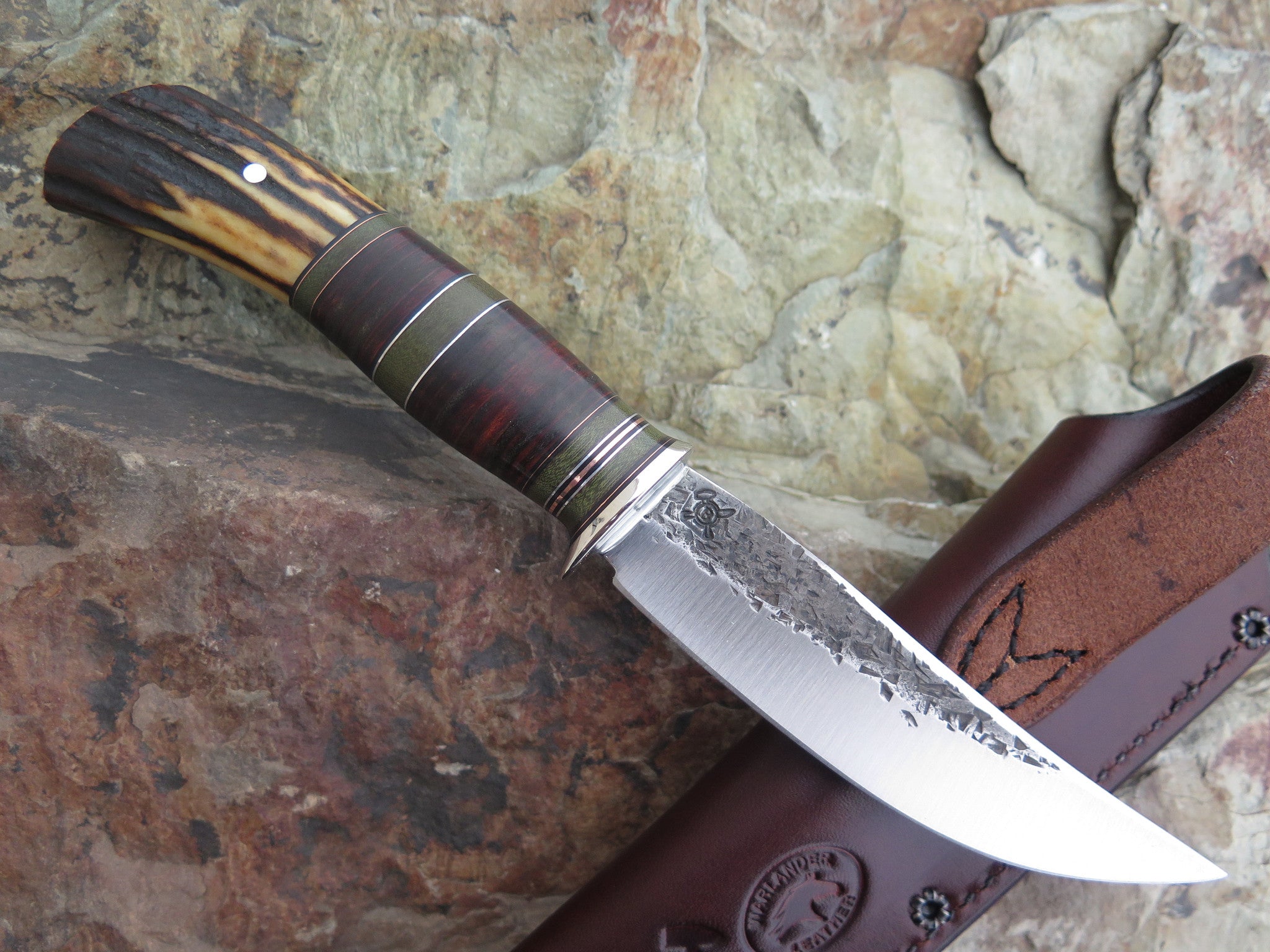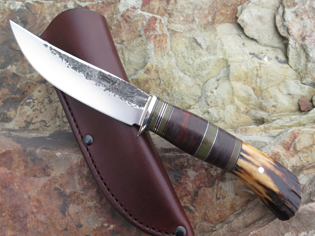 This new Trout and Bird from Behring Made is hand forged from 1/8" thick high carbon 01 tool steel and it measures 4 3/8" from tip to guard with a razor sharp hollow grind and a hammermark finish. The nickel silver guard is soldered in place above black fiber, green micarta, aluminum, copper and horsehide spacers that beautifully compliment the natural tones of the premium sambar stag butt. The overall length measures 9" and it comes in a custom pouch sheath from Warlander Leather.