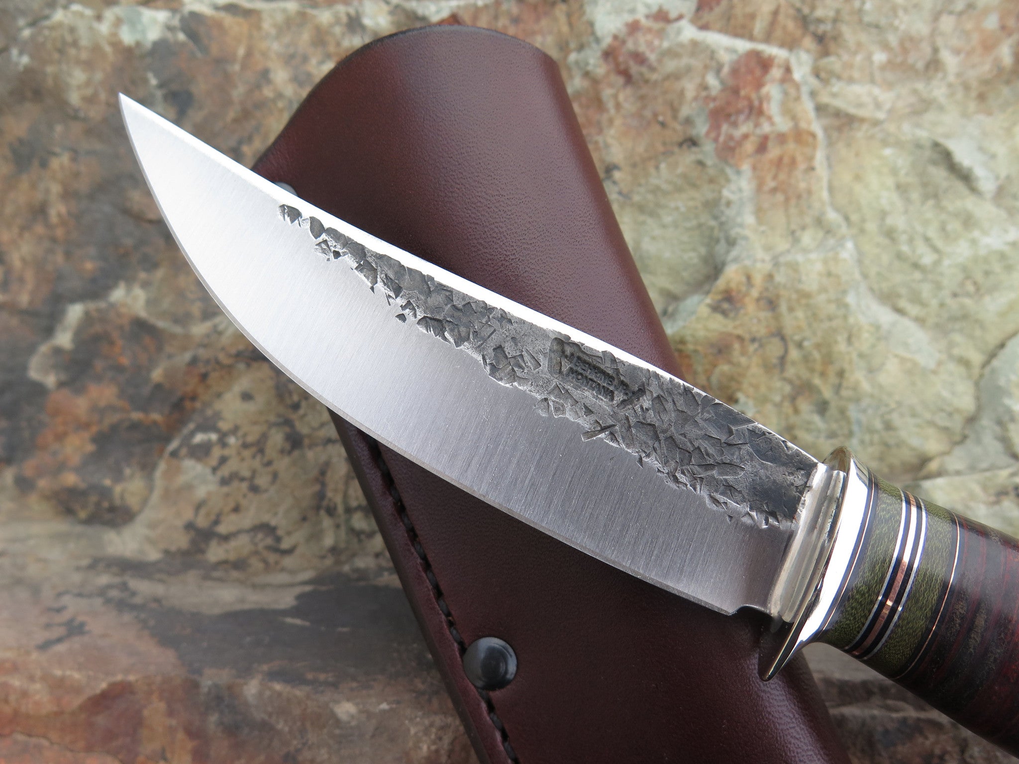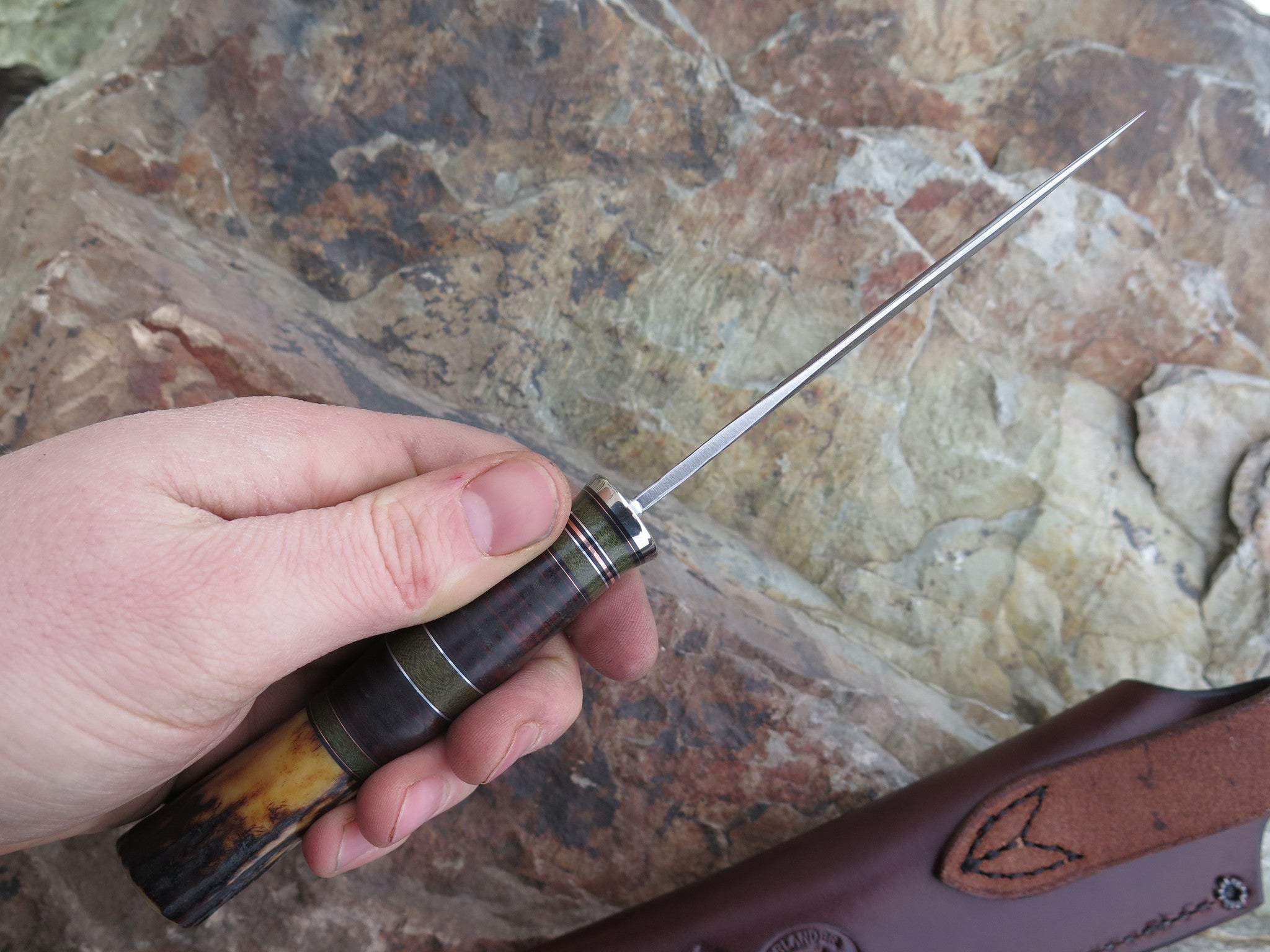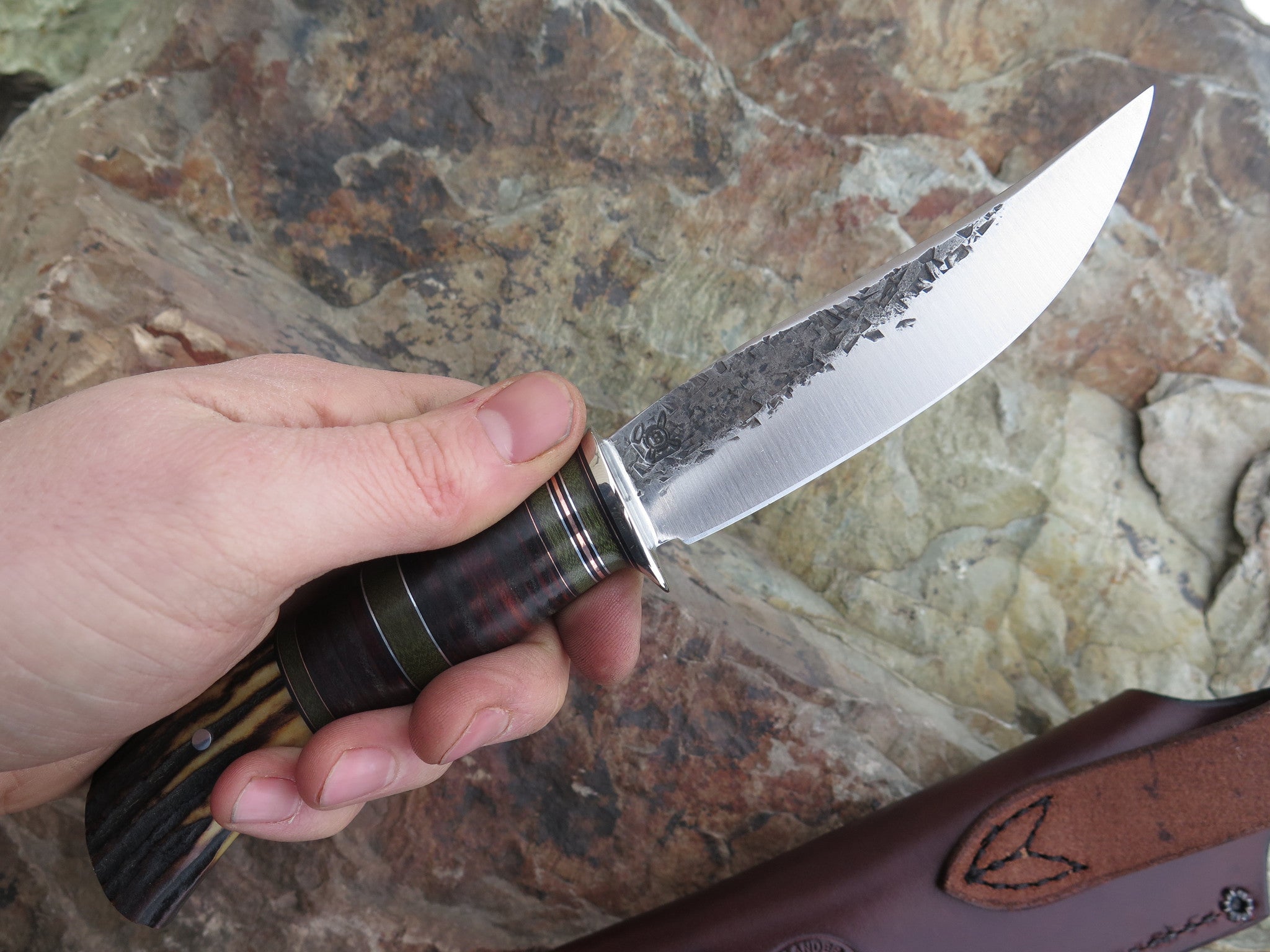 This new Trout and Bird from Behring Made is hand forged from 1/8" thick high carbon 01 tool steel and it measures 4 3/8" from tip to guard with a razor sharp hollow grind and a hammermark finish. The nickel silver guard is soldered in place above black fiber, green micarta, aluminum, copper and horsehide spacers that beautifully compliment the natural tones of the premium sambar stag butt. The overall length measures 9" and it comes in a custom pouch sheath from Warlander Leather.