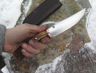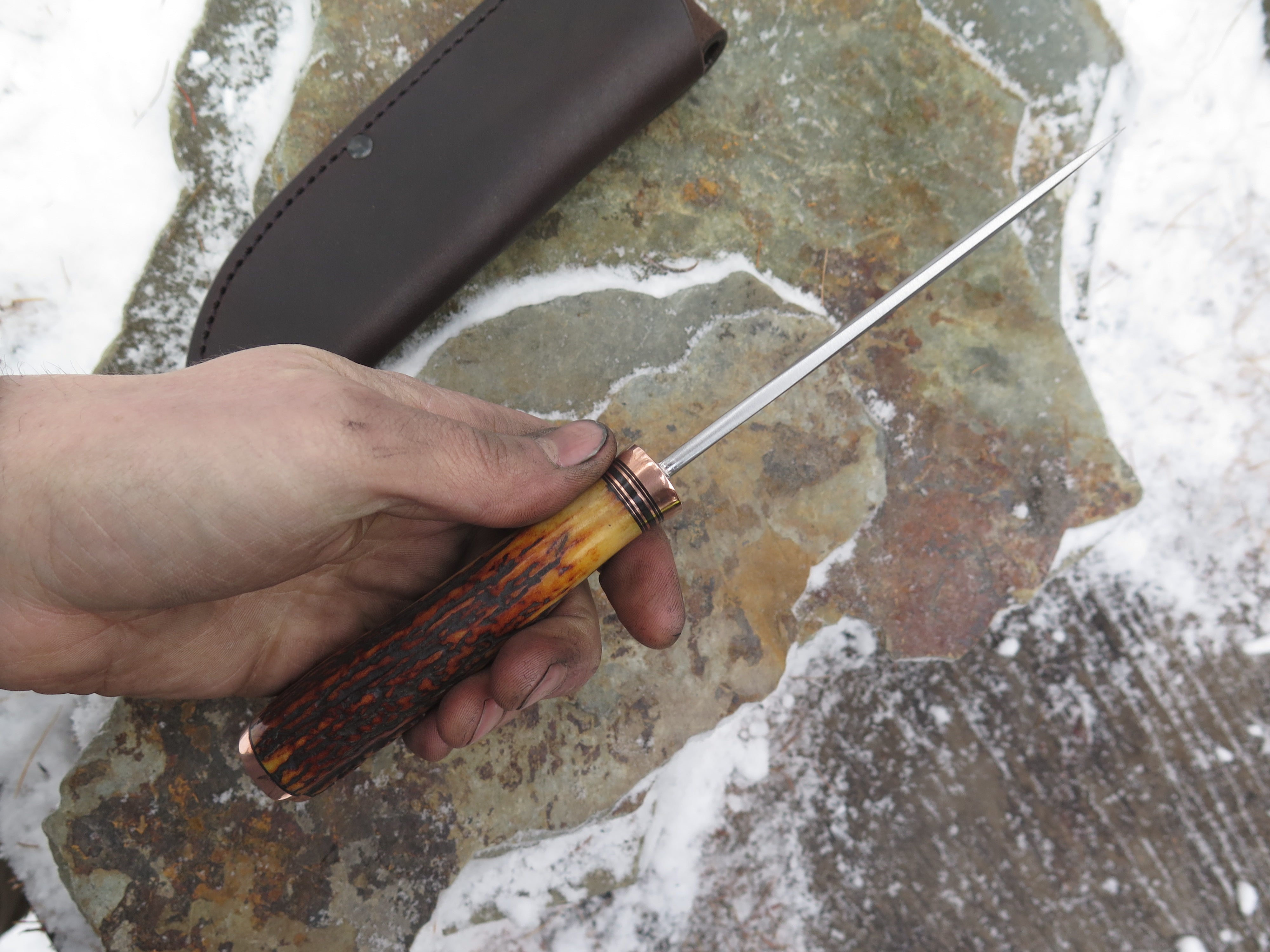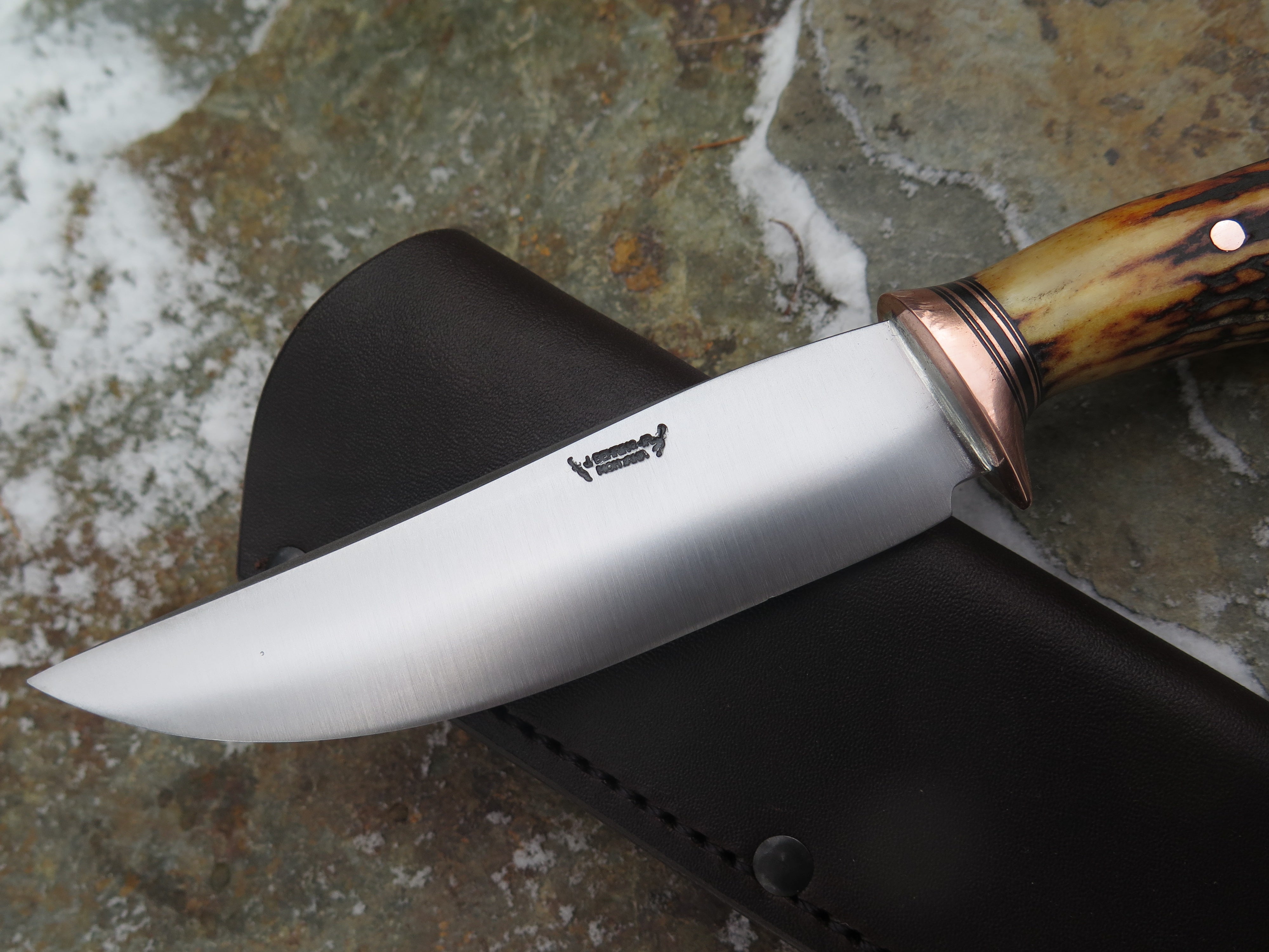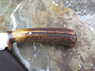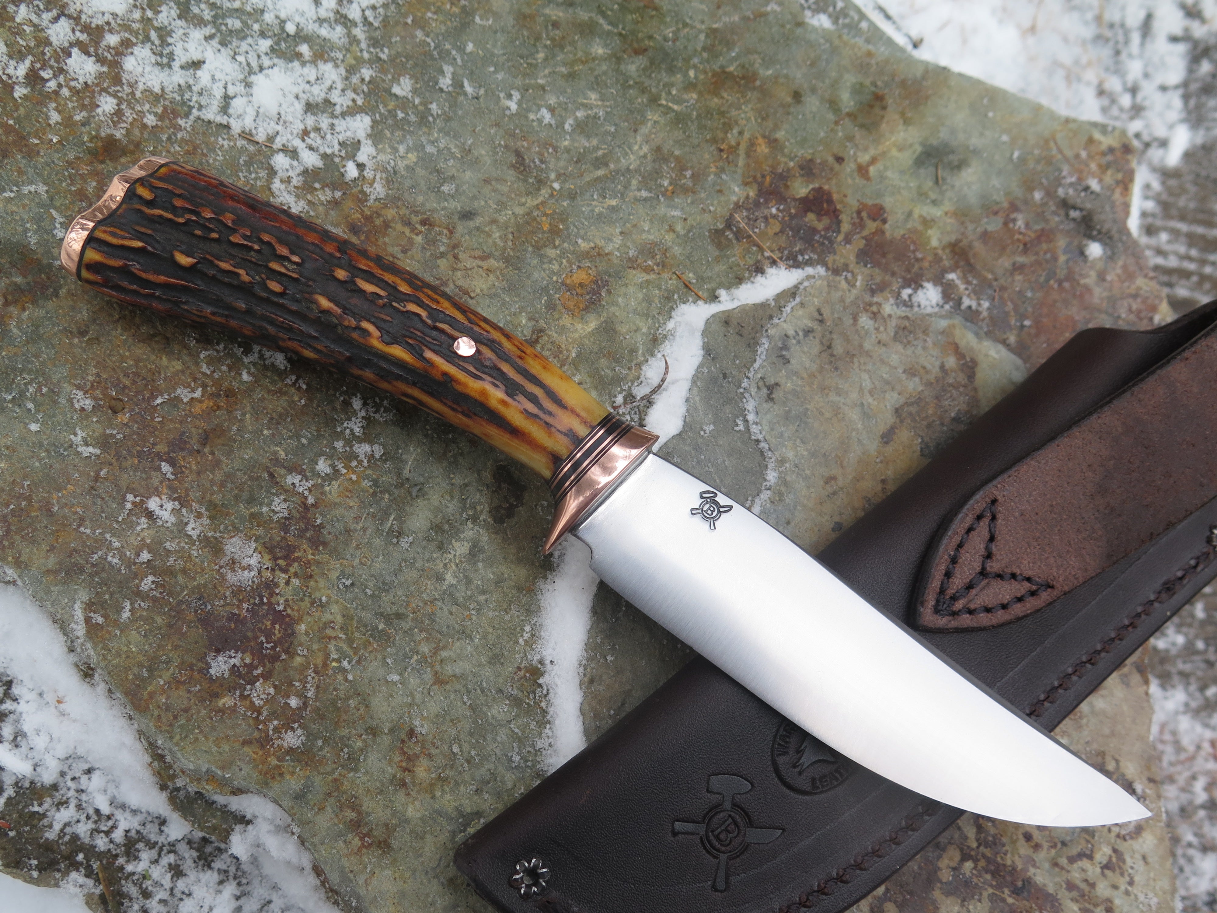 This classic Trout & Bird from Behring Made© is hand forged from 3/16" thick high carbon 01 tool steel and it measures 5" from tip to guard with a razor sharp convex grind. The copper guard is soldered in place above black fiber and copper spacers as well as a gorgeous premium sambar stag handle that's pinned and capped with copper. Overall length measures 9 1/2" and it comes in a classic leather belt pouch sheath.