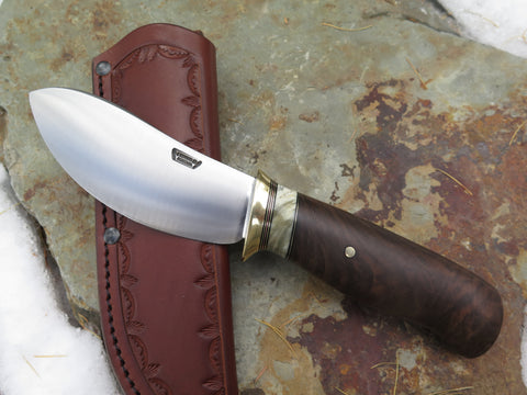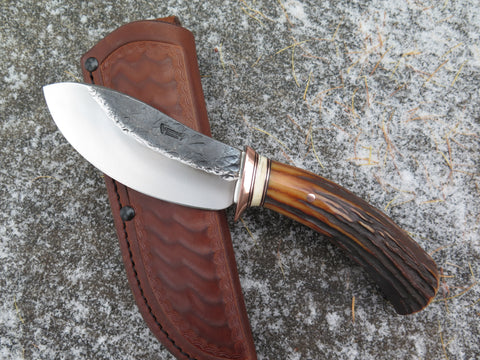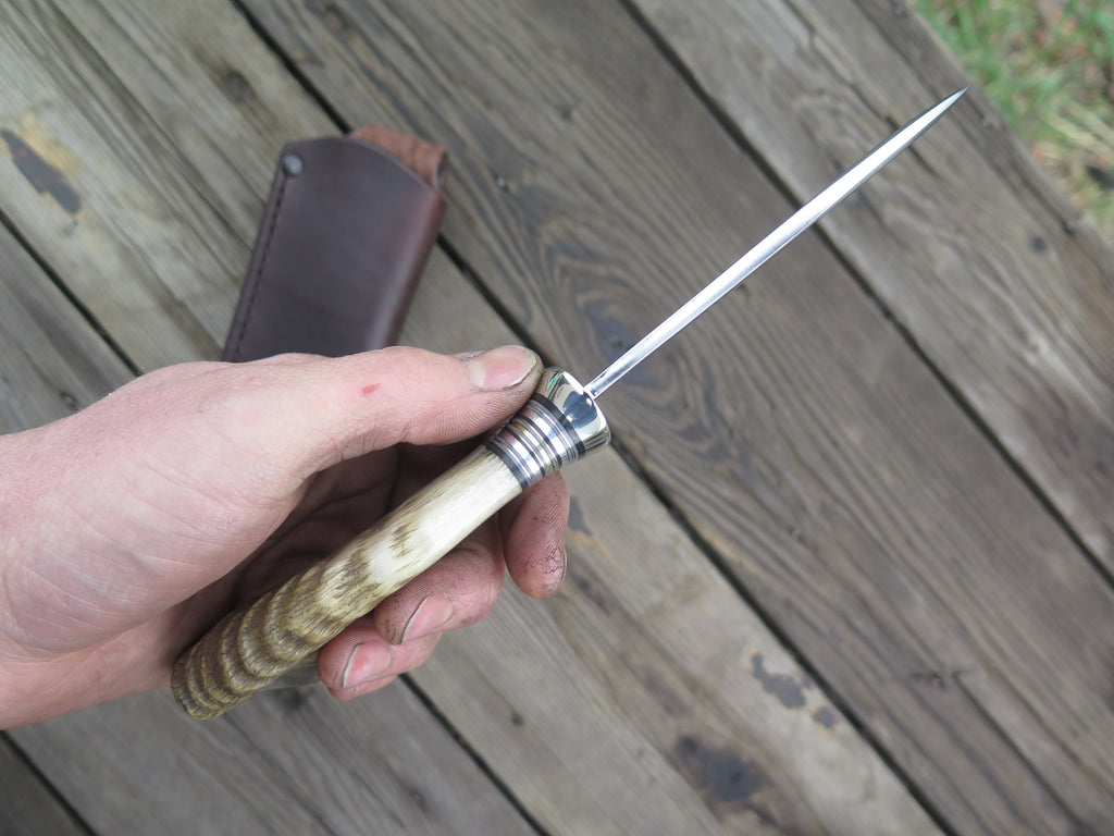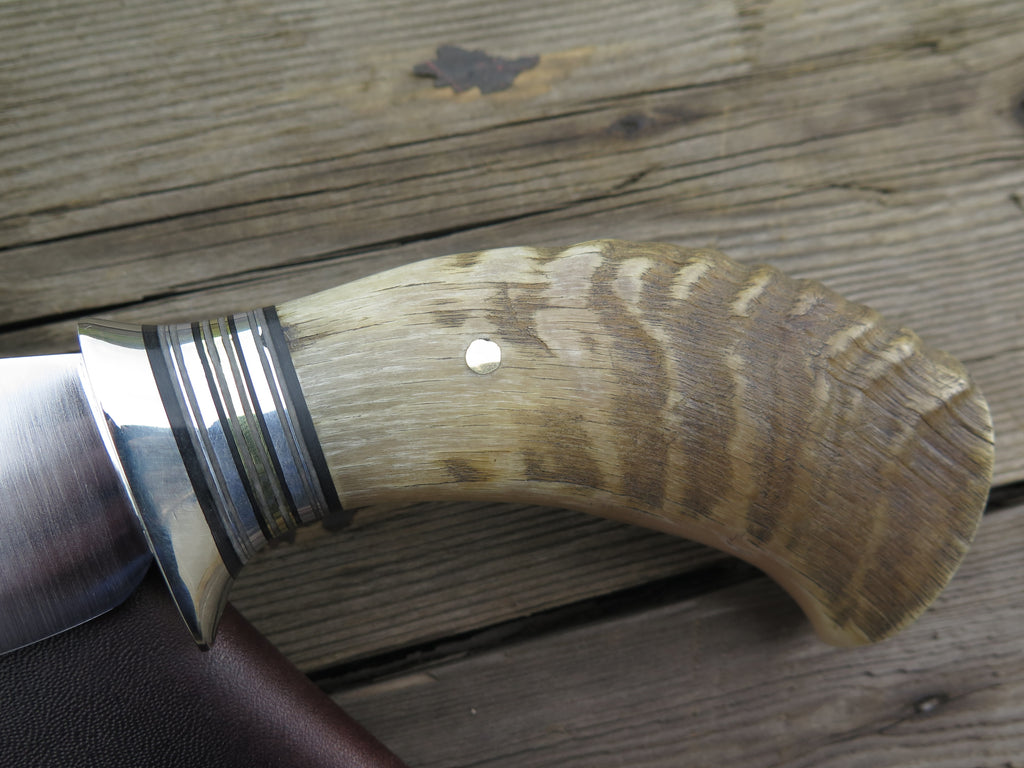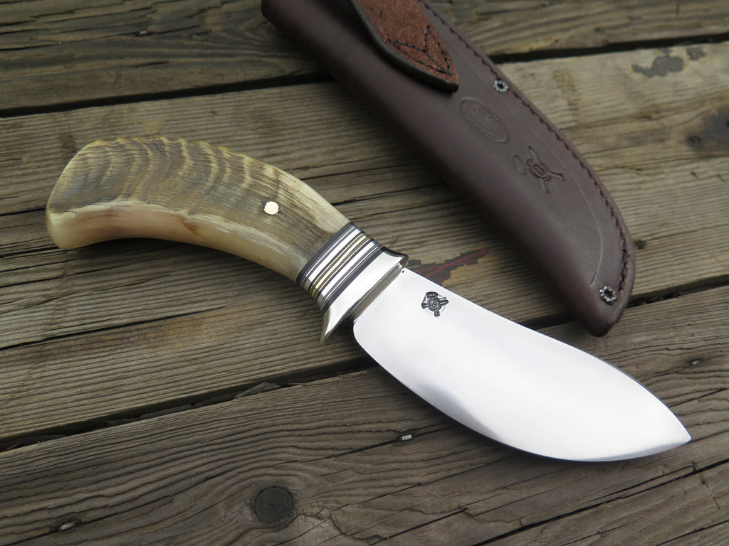 This remarkable Nessmuk from Behring Made© is hand forged from 3/16" thick high carbon 01 tool steel and it measures 4 1/4" from tip to guard with a razor sharp convex grind. The nickel silver guard is soldered in place above black, gray, brass and aluminum spacers in addition to the top shelf sheep horn handle with texture for days. The overall length measures 8 3/4" and it comes in a classic belt pouch sheath. *Material figure subject to vary