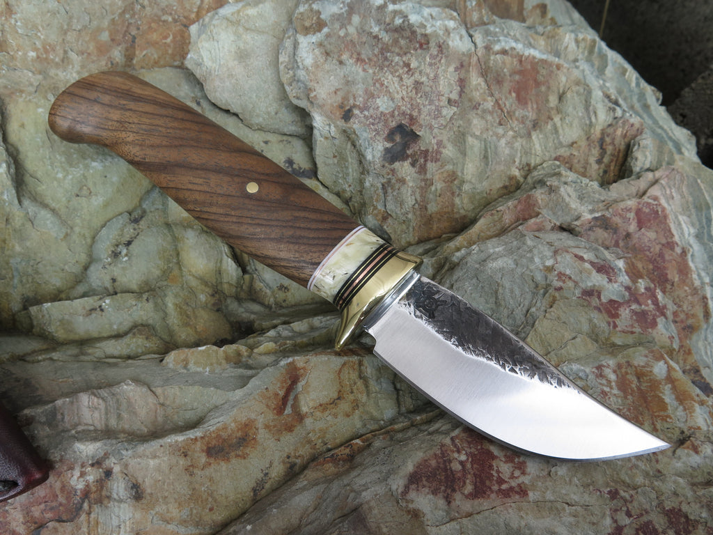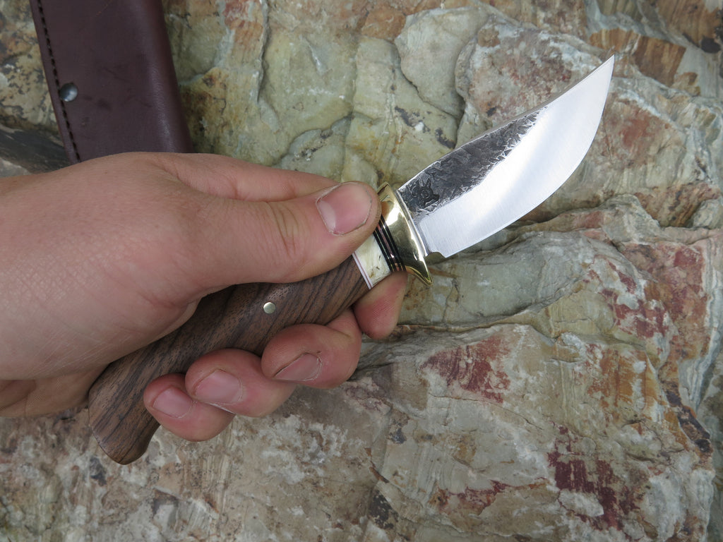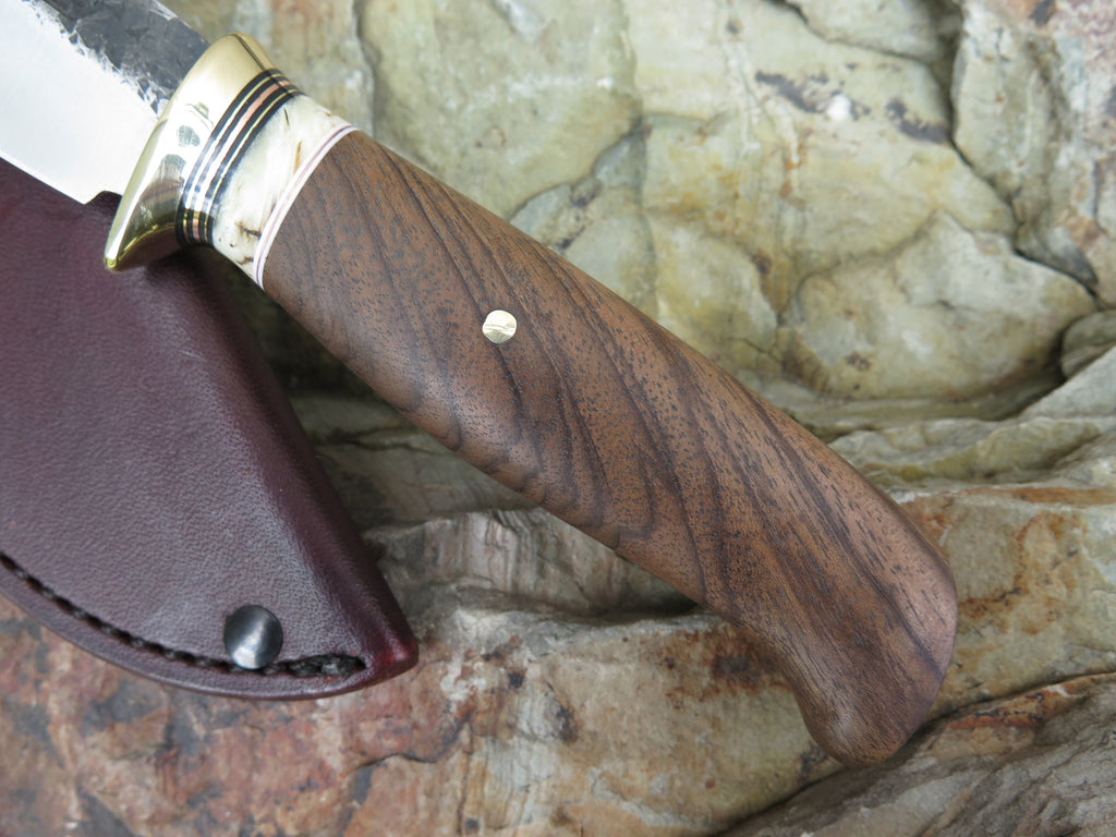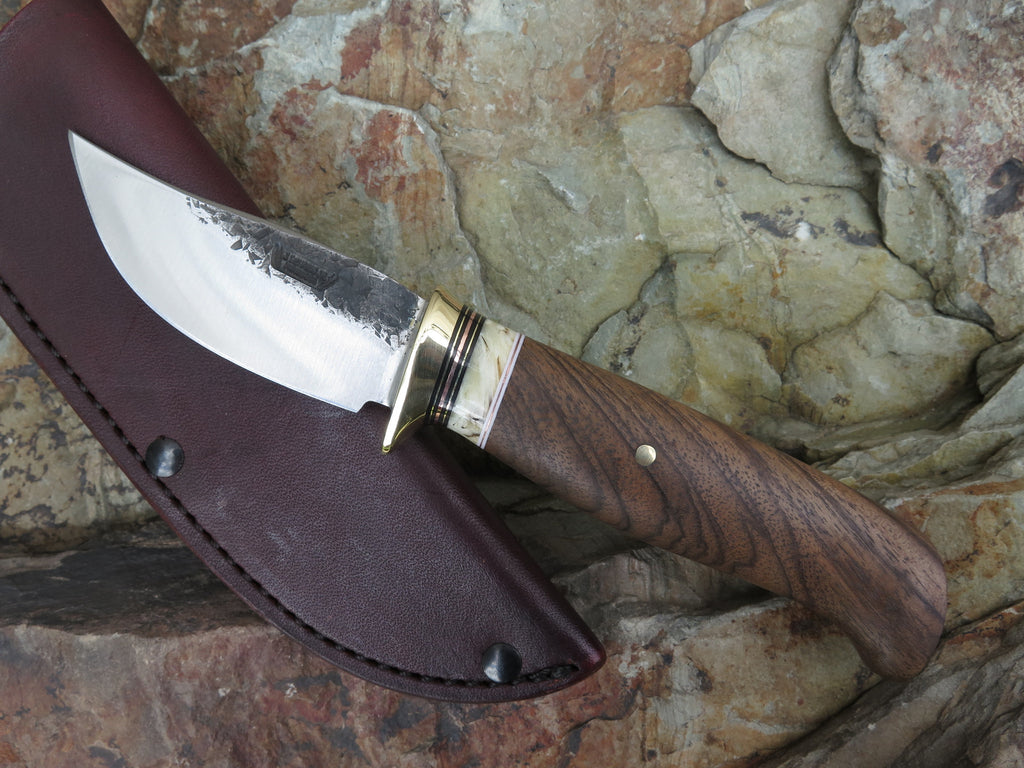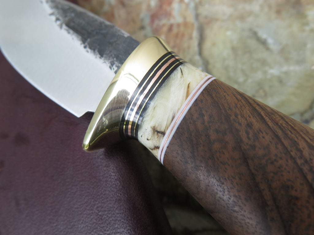 This attractive Sharptail from Behring Made is hand forged from high carbon 01 tool steel and measures 3 1/2" from tip to guard with a razor sharp hollow grind with a hammermark finish. The brass guard is soldered in place above black, white, copper, brass and musk ox boss spacers. The premium walnut handle is pinned with brass and brings the overall length to 7 7/8" overall, and it comes in our Behring Made pouch sheath.