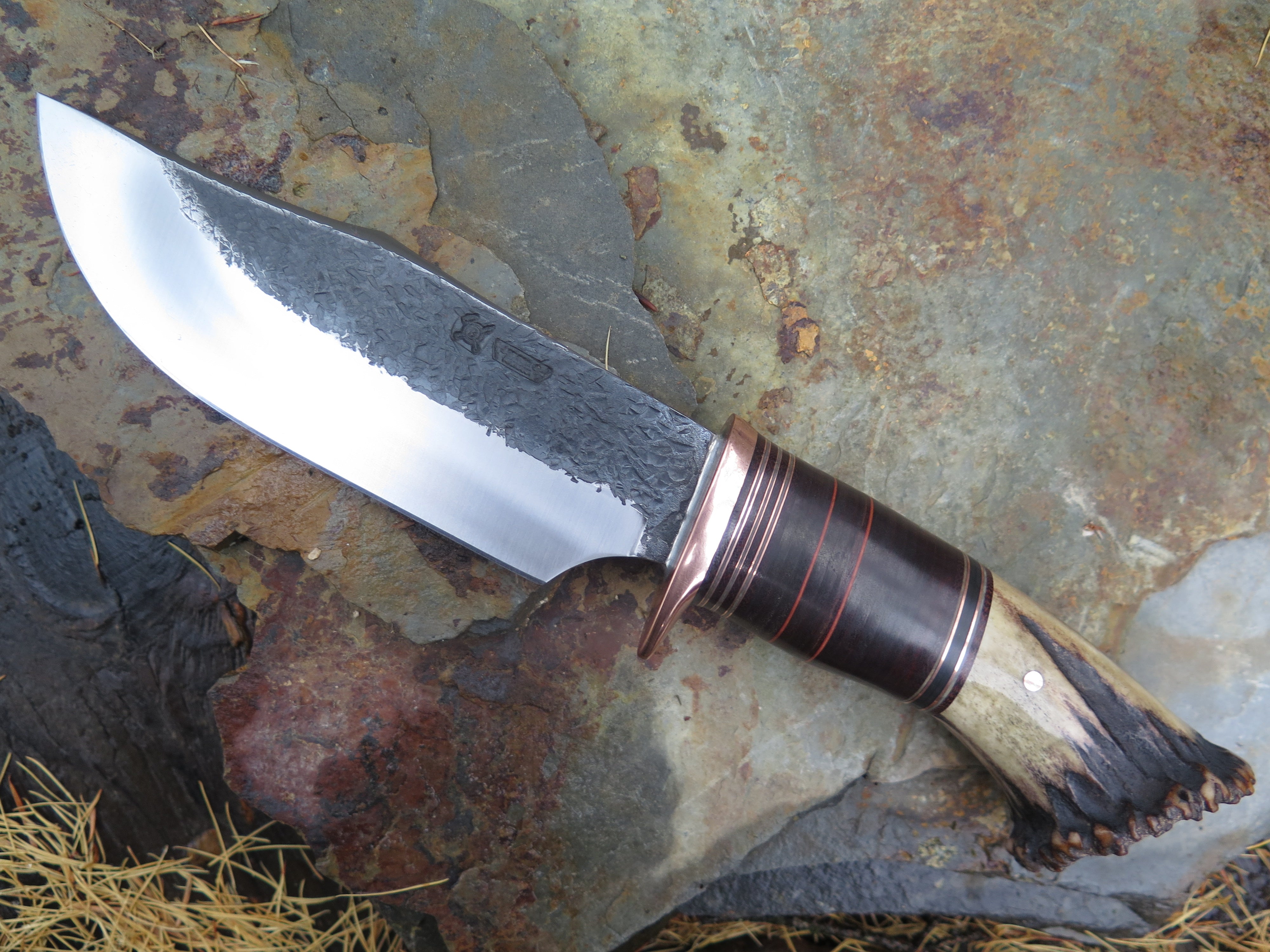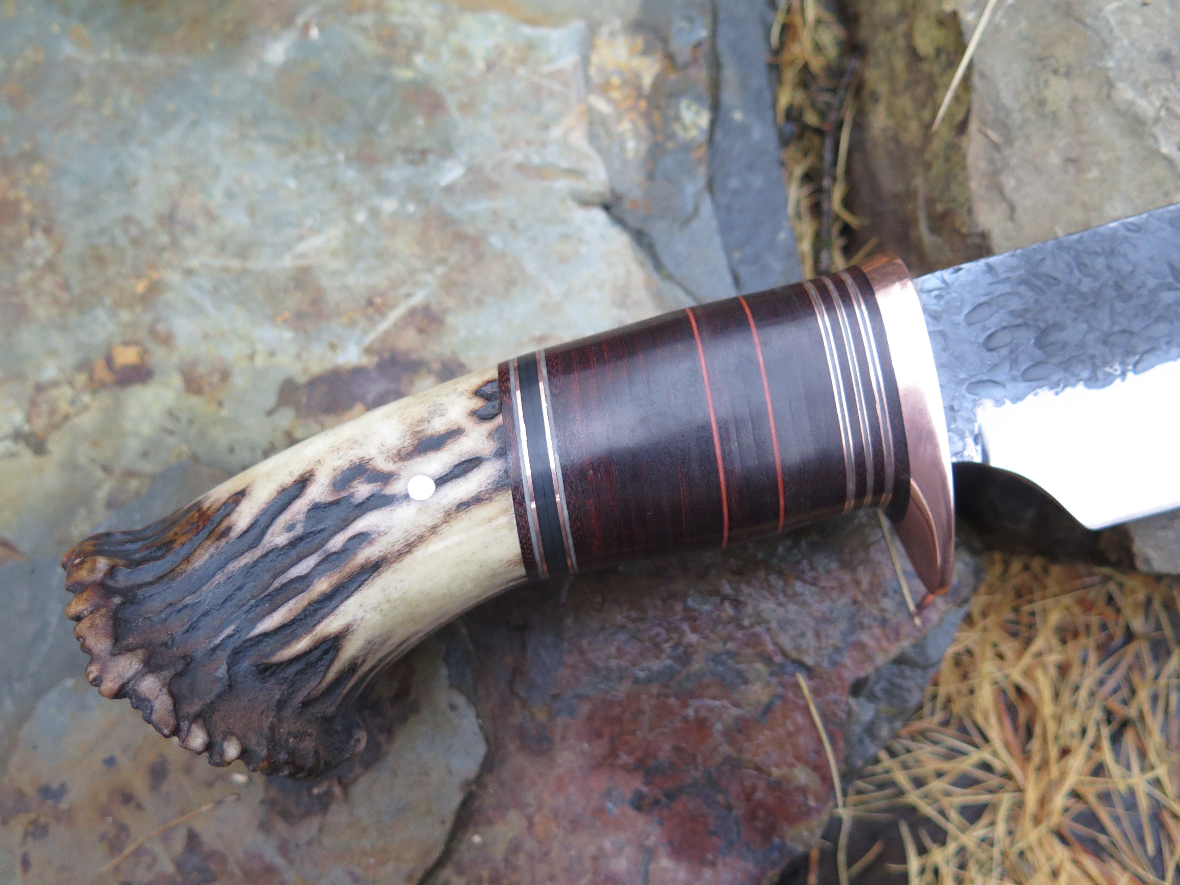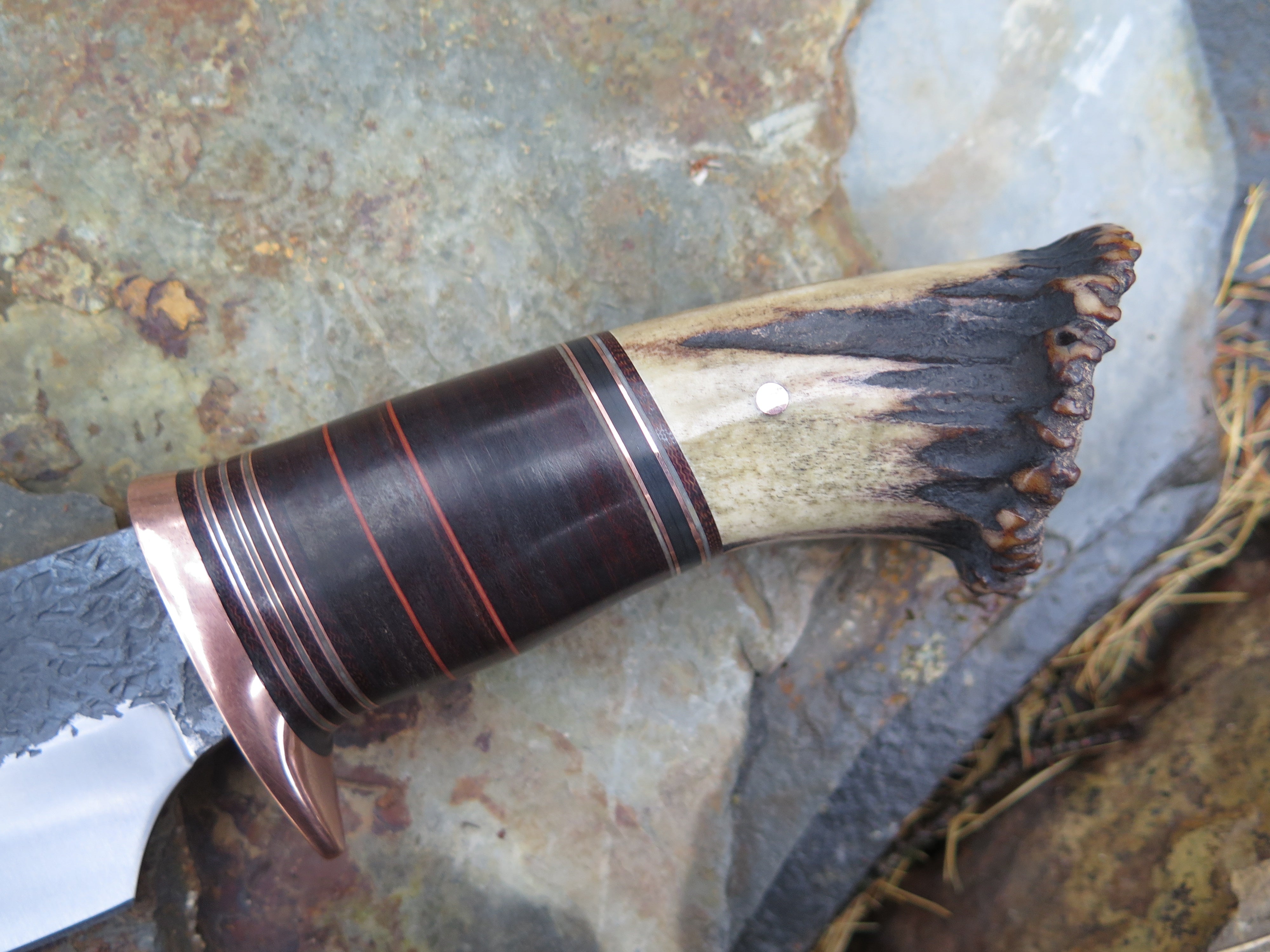 This incredible new Bushmaster from Behring Made© would make even Bill Scagel blush! The blade is hand forged from 1/4" thick high carbon 01 tool steel and it measures 6 1/2" from tip to guard with a razor sharp hollow grind and our hammermark finish. The copper guard is soldered in place above black, maroon and gray fiber, copper, brown micarta and horsehide leather spacers which top a premium sambar crown stag butt that's pinned through the tang with copper. The overall length measures 12" and this one will come in a custom Warlander Leather sheath.