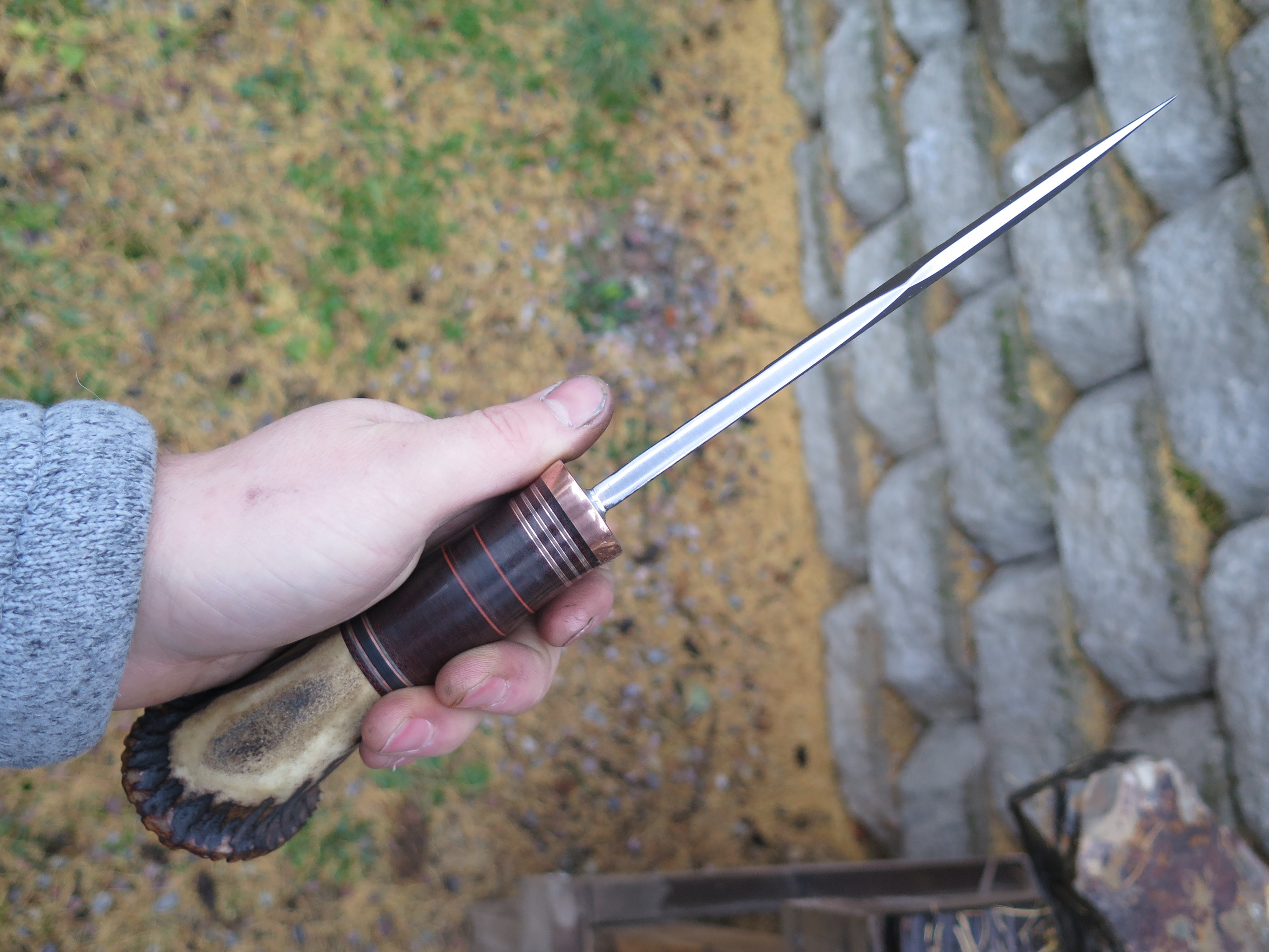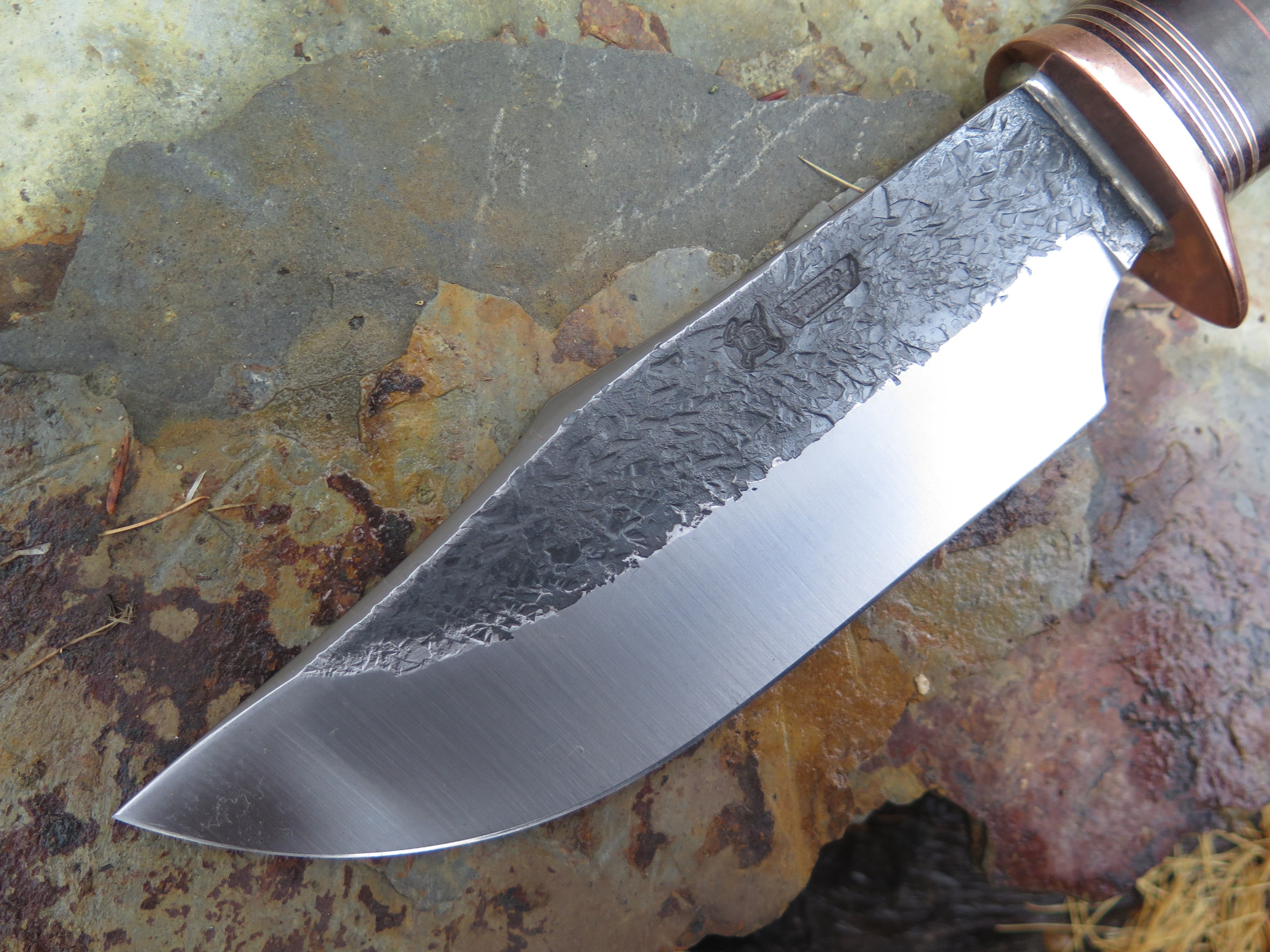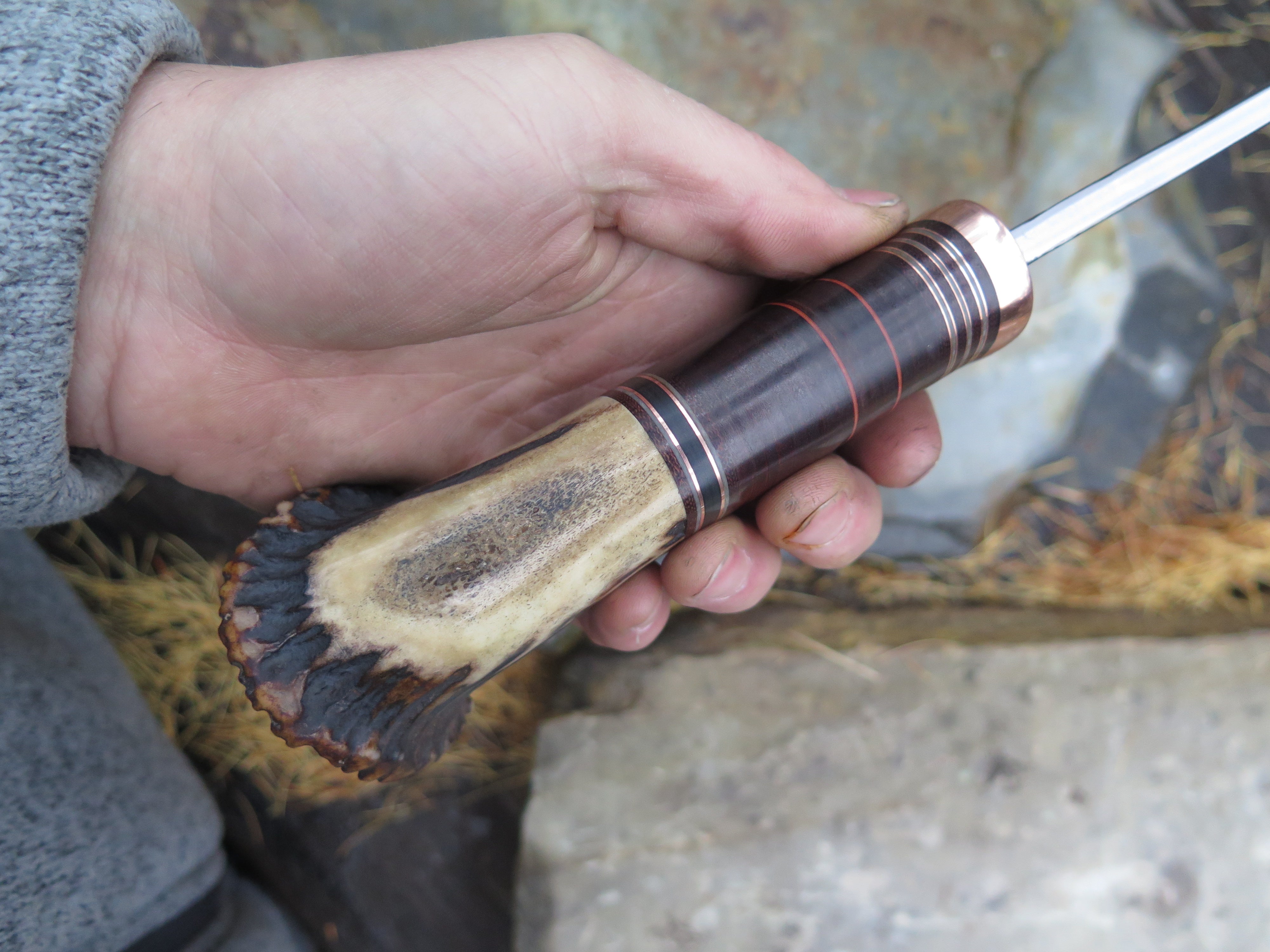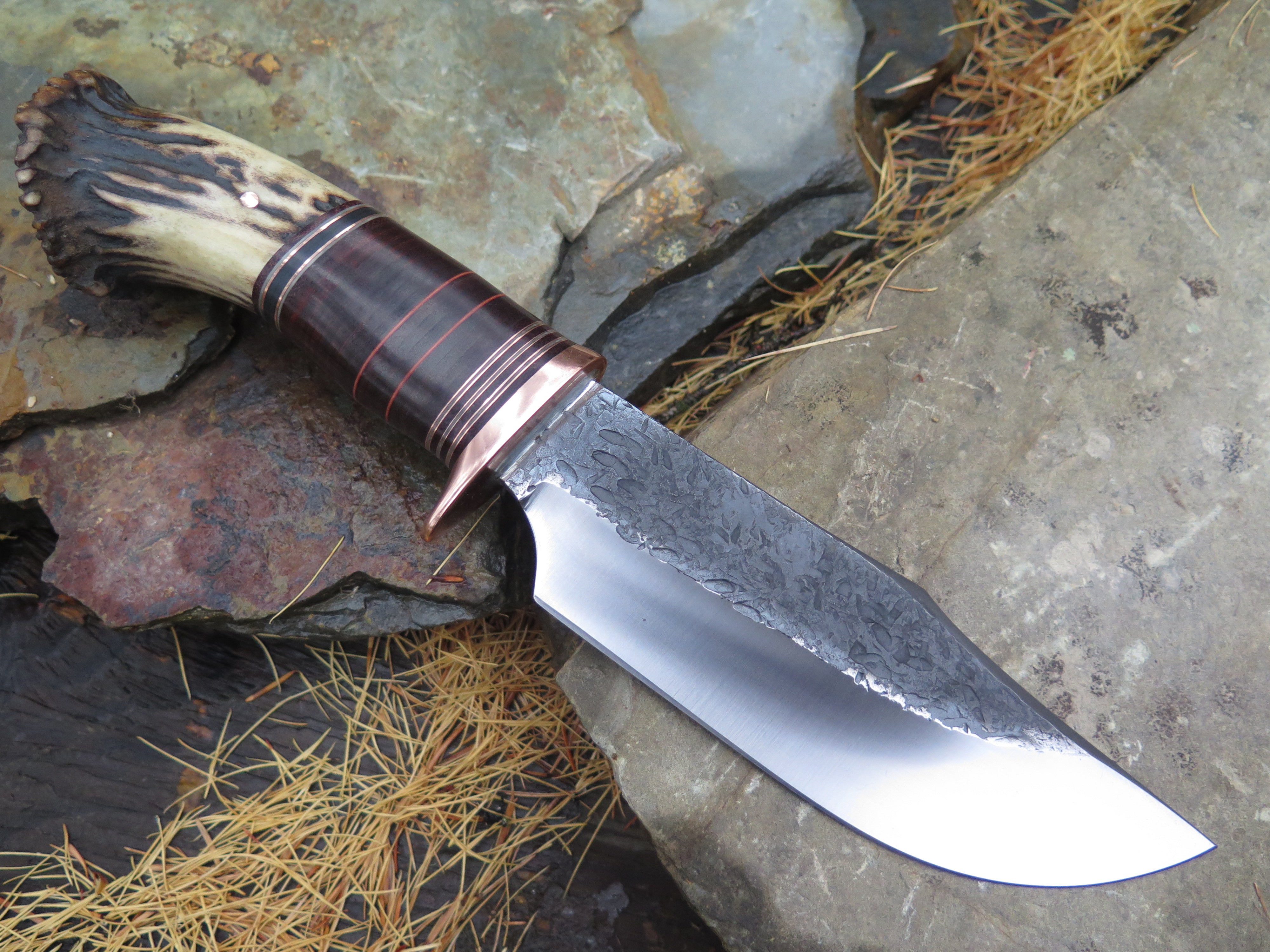 This incredible new Bushmaster from Behring Made© would make even Bill Scagel blush! The blade is hand forged from 1/4" thick high carbon 01 tool steel and it measures 6 1/2" from tip to guard with a razor sharp hollow grind and our hammermark finish. The copper guard is soldered in place above black, maroon and gray fiber, copper, brown micarta and horsehide leather spacers which top a premium sambar crown stag butt that's pinned through the tang with copper. The overall length measures 12" and this one will come in a custom Warlander Leather sheath.