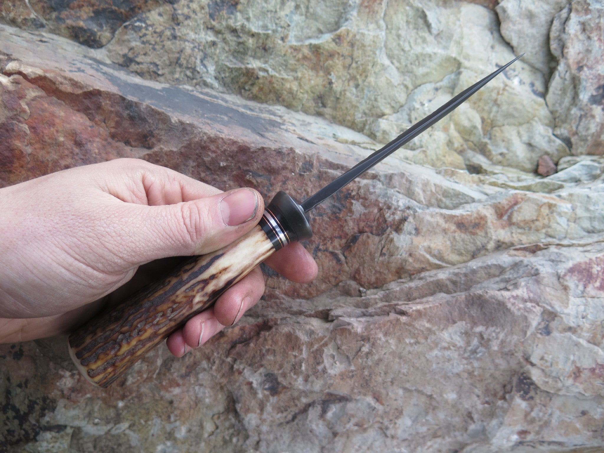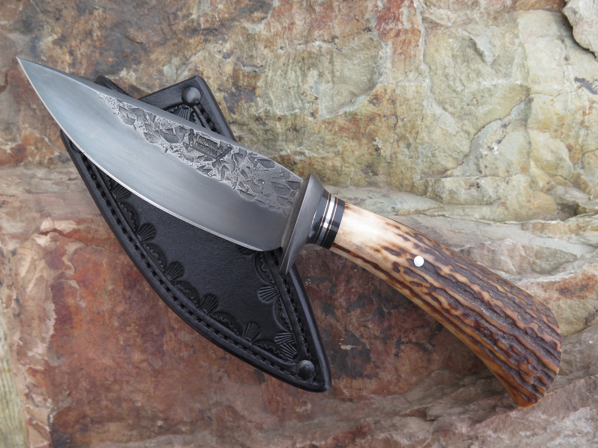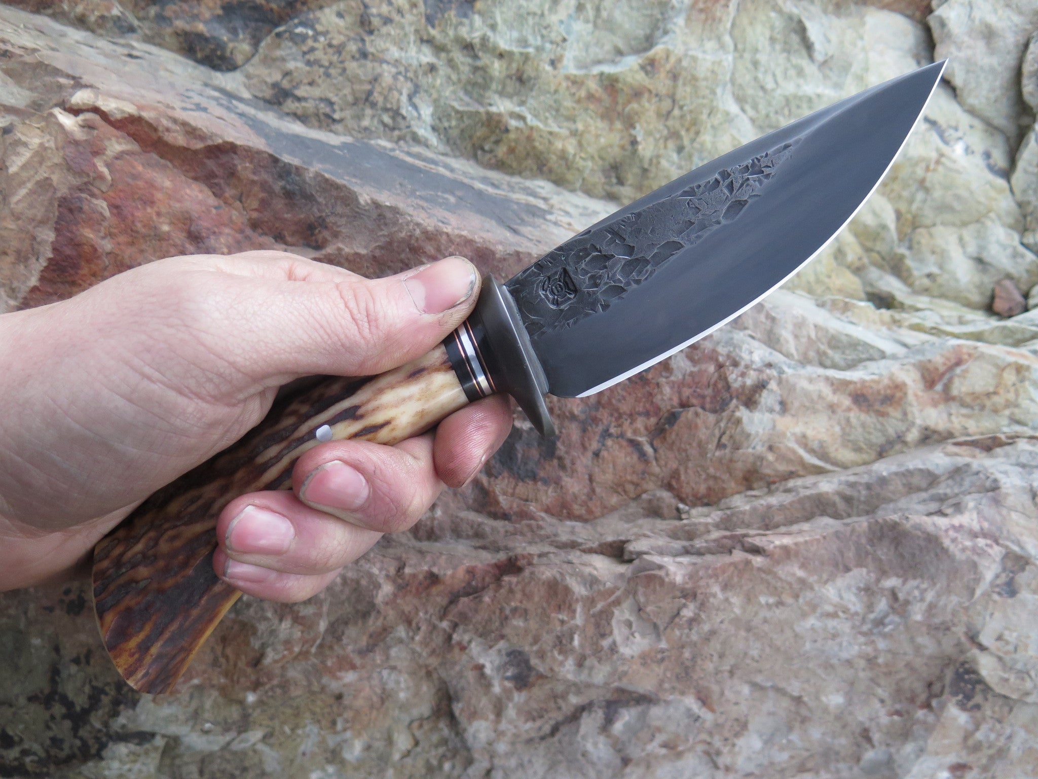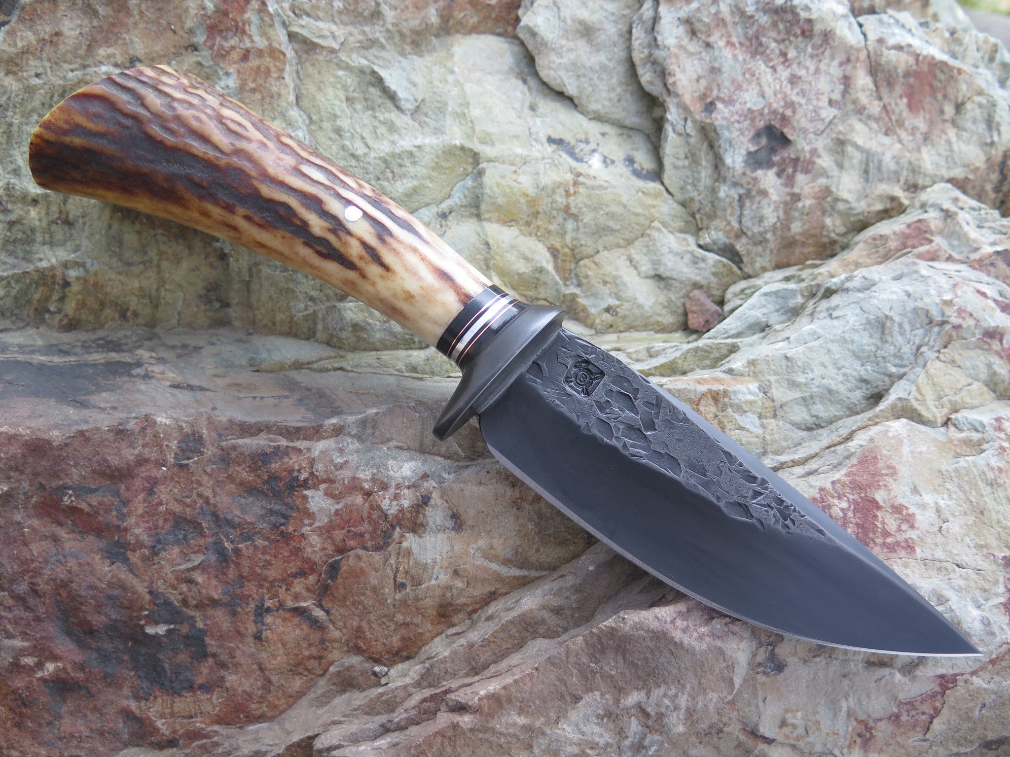 This bad ass new Drop Point from Behring Made is hand forged from 3/16" thick high carbon 01 tool steel and it measures 4 3/4" from tip to guard with a razor sharp hollow grind, hammermarks and our forced patina gun blued finish. The blued steel guard is soldered in place above black fiber, aluminum and copper spacers that are a perfect accent to the sambar stag handle that is pinned with aluminum. The overall length measures 9 1/2" and it will come in a custom sheath from Warlander Leather.