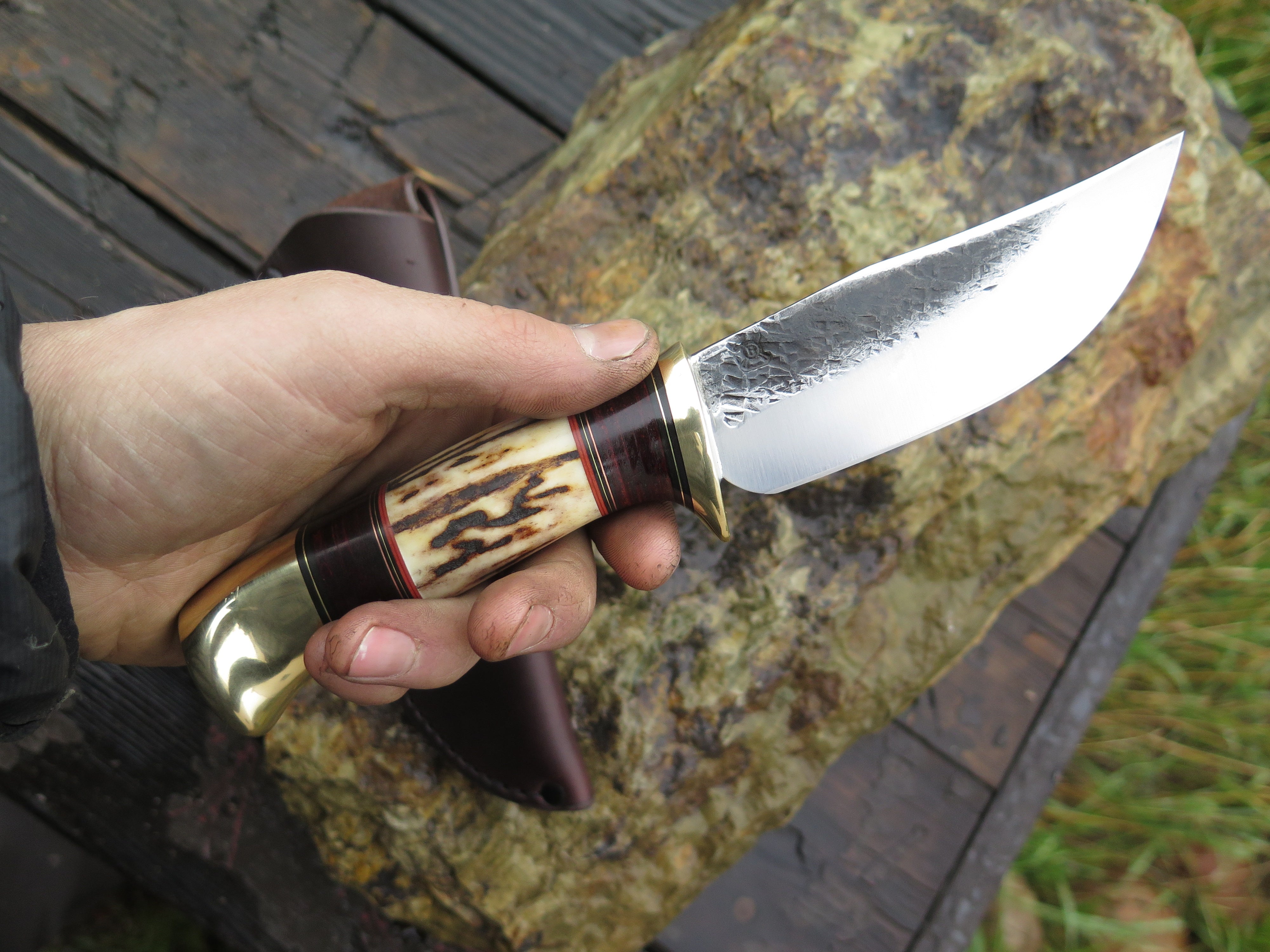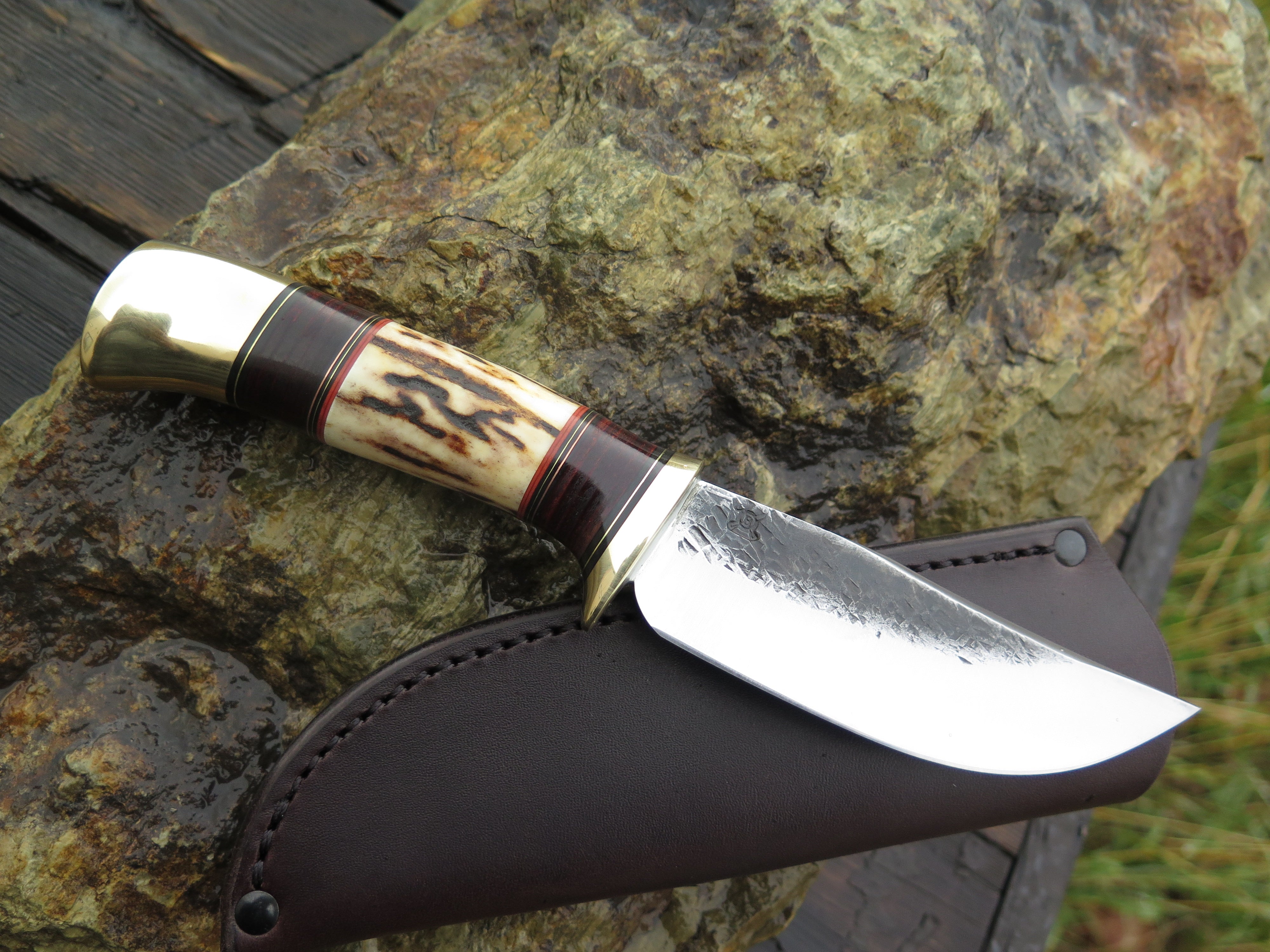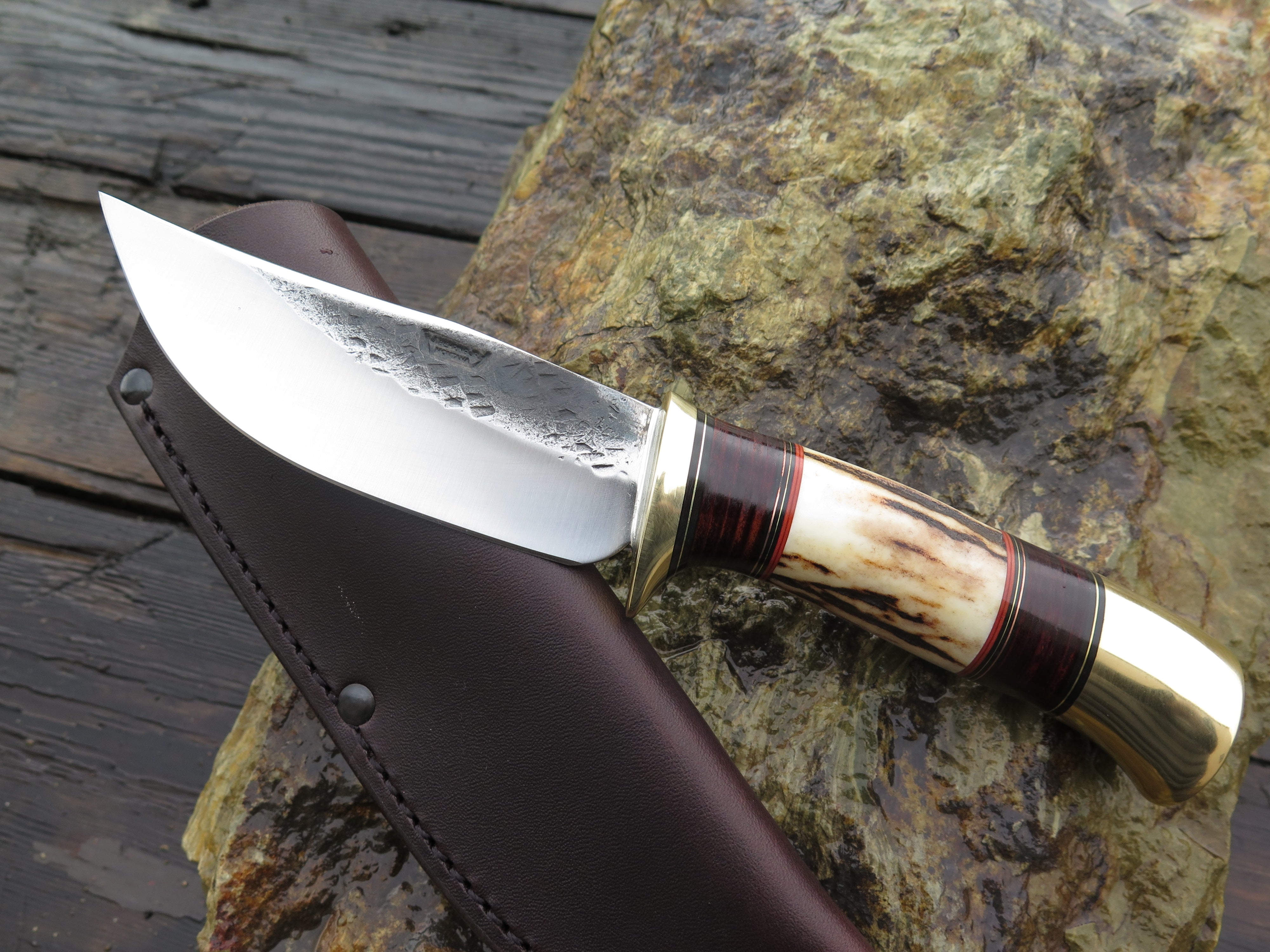 This bad ass new Hunter from Behring Made© is hand forged from 3/16" thick high carbon 01 tool steel and it measures 4 1/2" from tip to guard with a razor sharp hollow grind and our hammermark finish. The brass guard is soldered in place above black and maroon fiber, copper, brass and horsehide leather spacers with a beautiful piece of sambar stag and a brass butt that's pinned through the tang with brass as well. The overall length measures 9 1/8" and it comes in a classic pouch sheath from Warlander Leather.