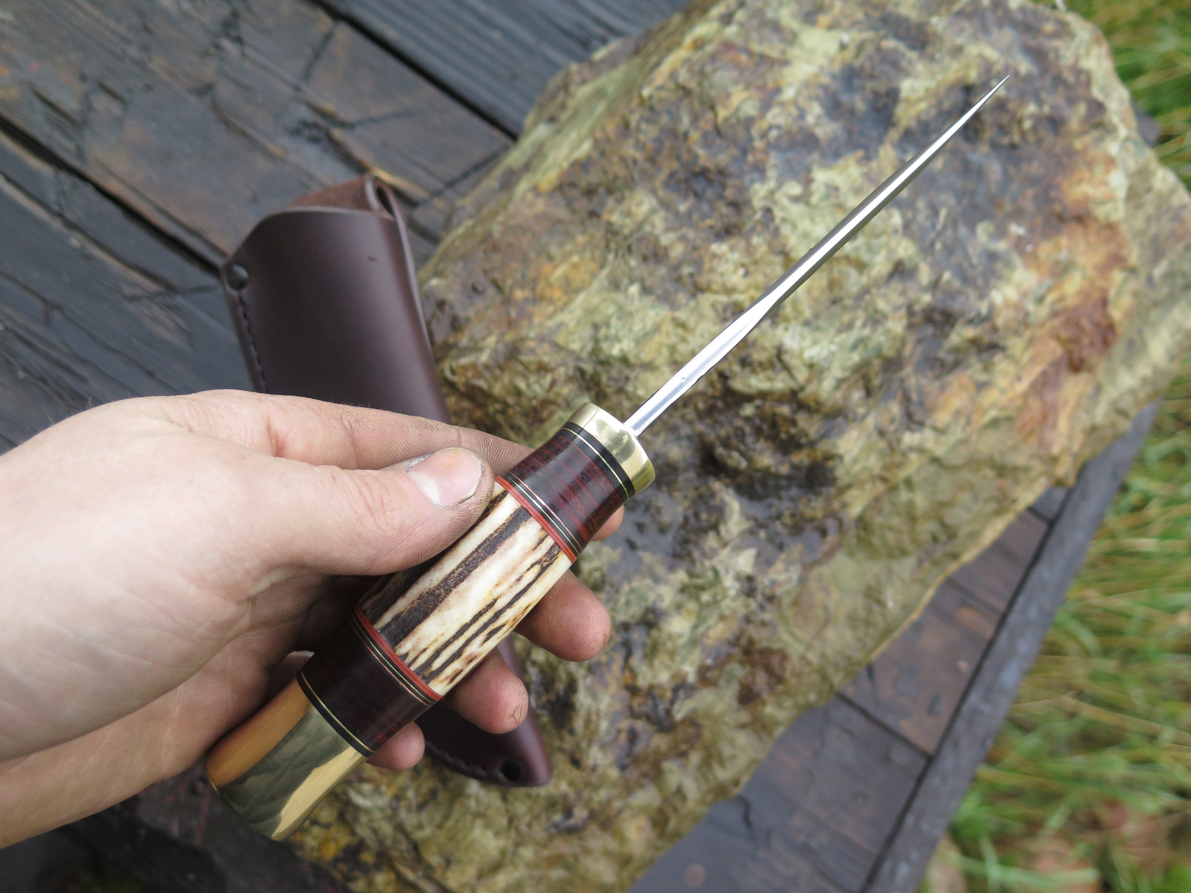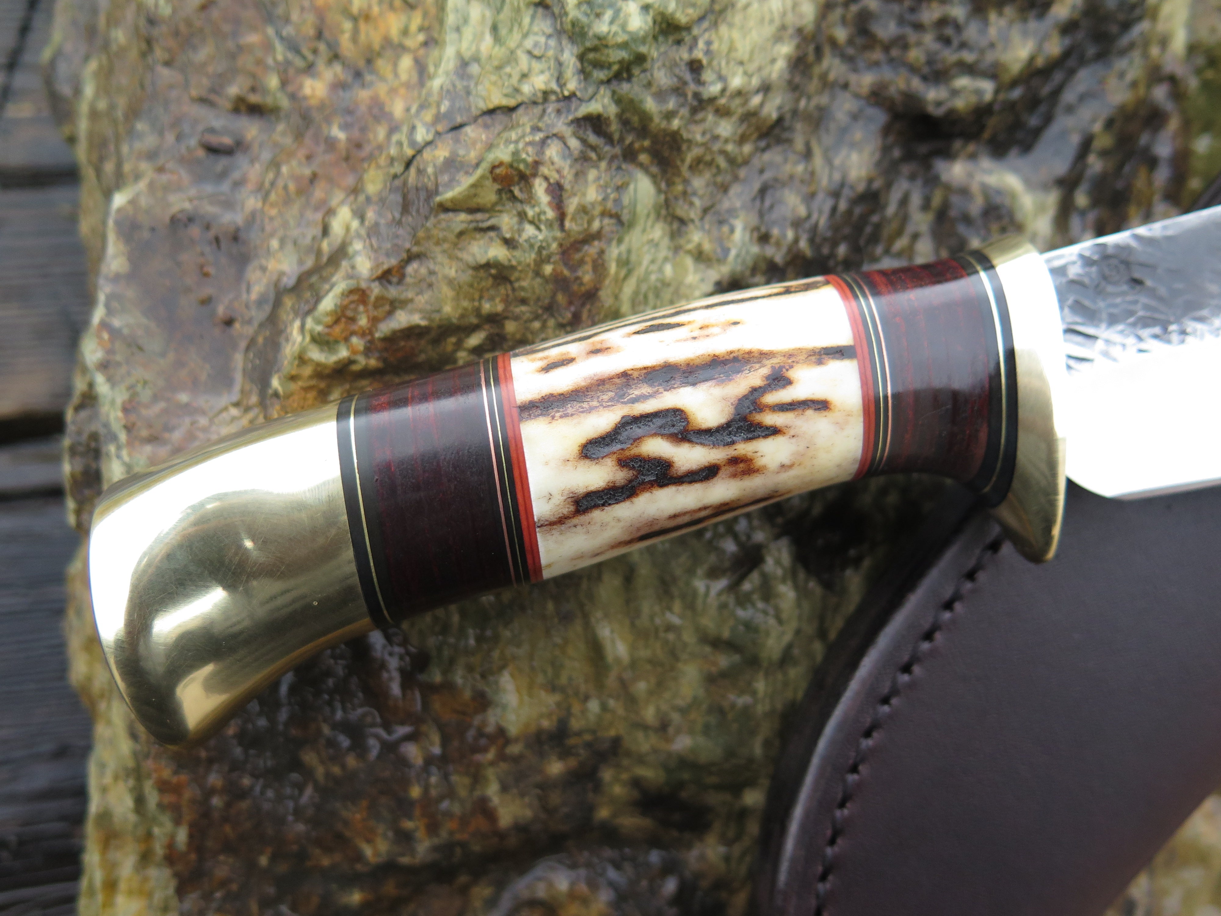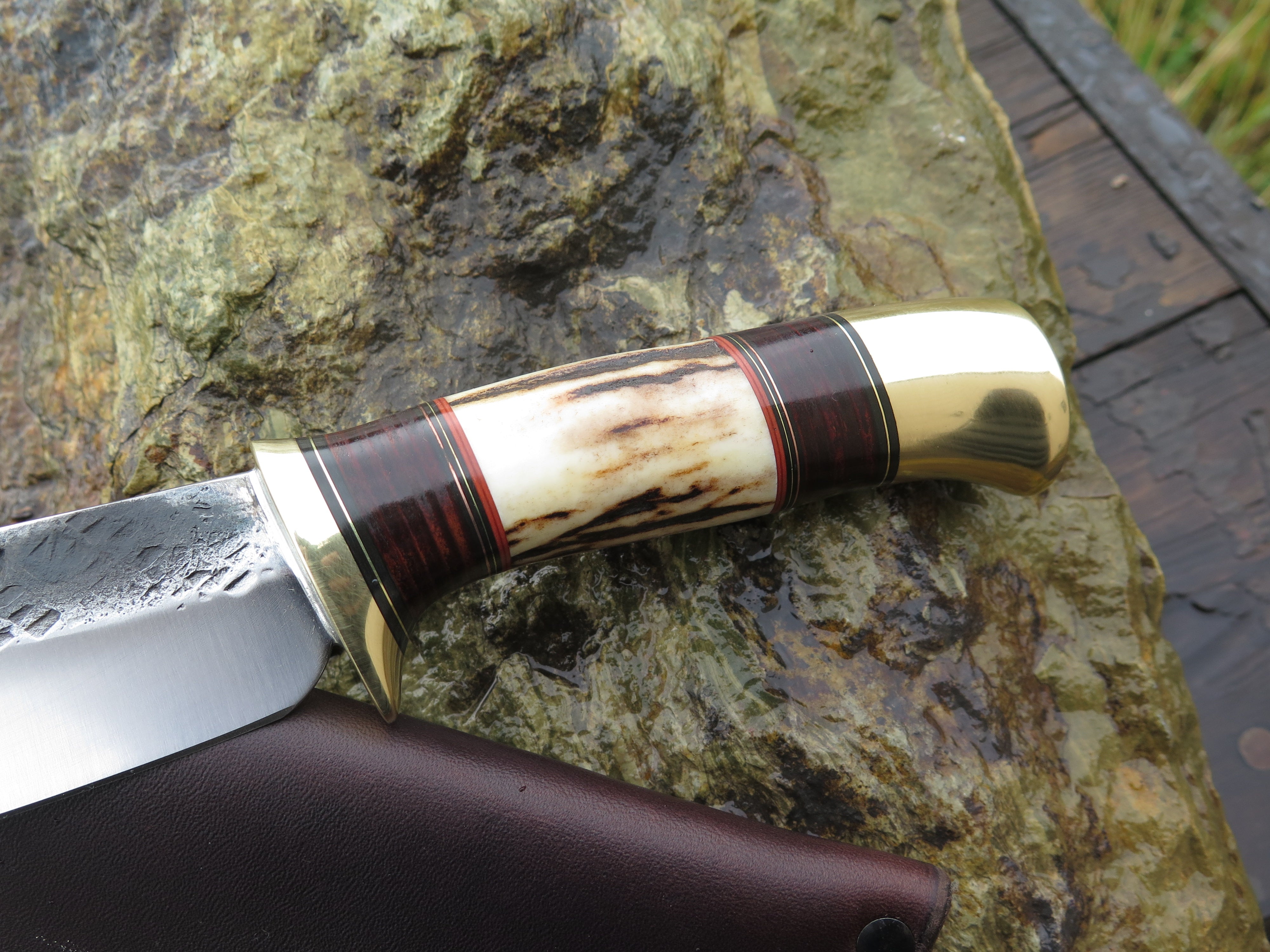 This bad ass new Hunter from Behring Made© is hand forged from 3/16" thick high carbon 01 tool steel and it measures 4 1/2" from tip to guard with a razor sharp hollow grind and our hammermark finish. The brass guard is soldered in place above black and maroon fiber, copper, brass and horsehide leather spacers with a beautiful piece of sambar stag and a brass butt that's pinned through the tang with brass as well. The overall length measures 9 1/8" and it comes in a classic pouch sheath from Warlander Leather.