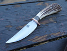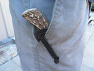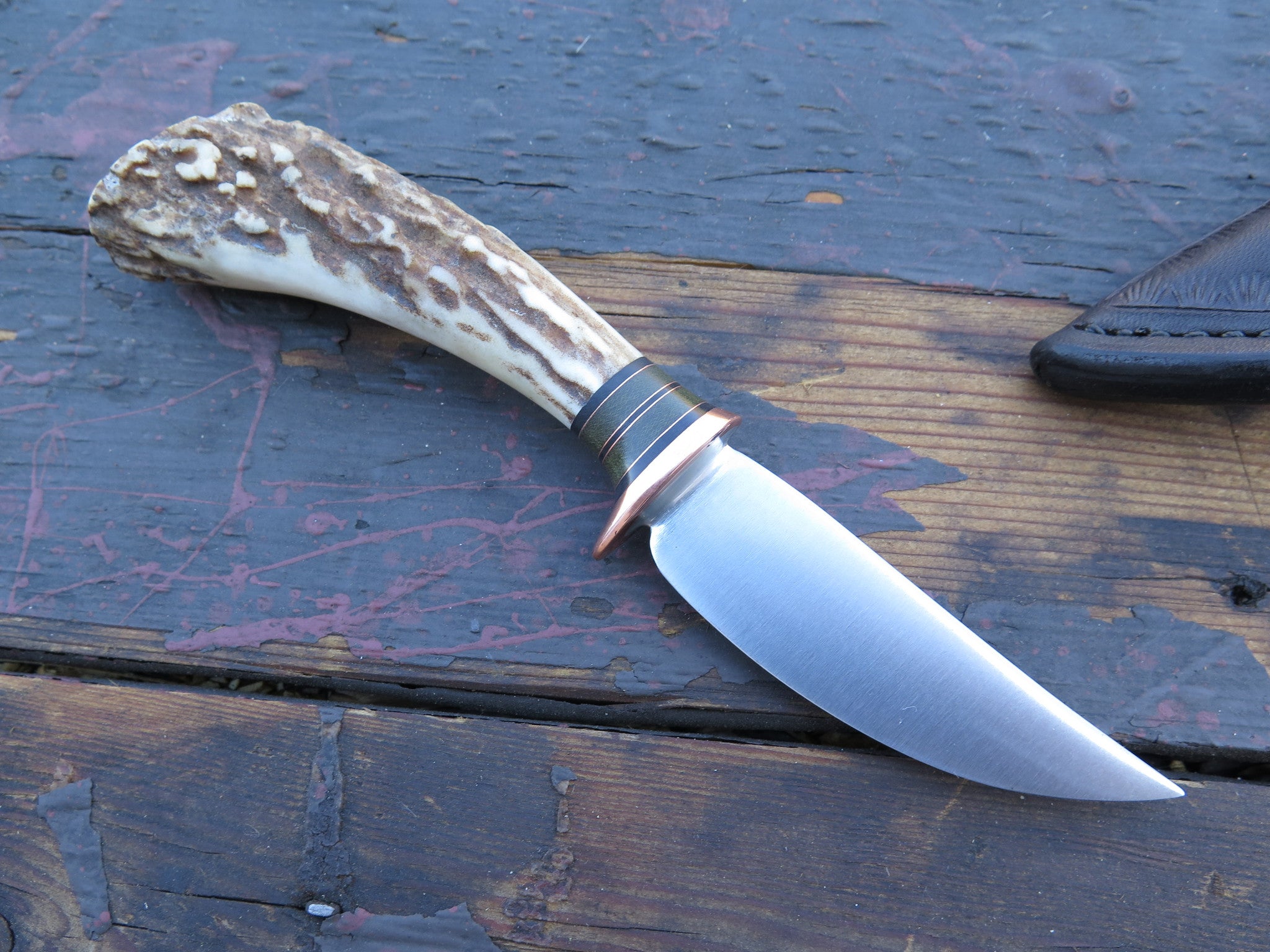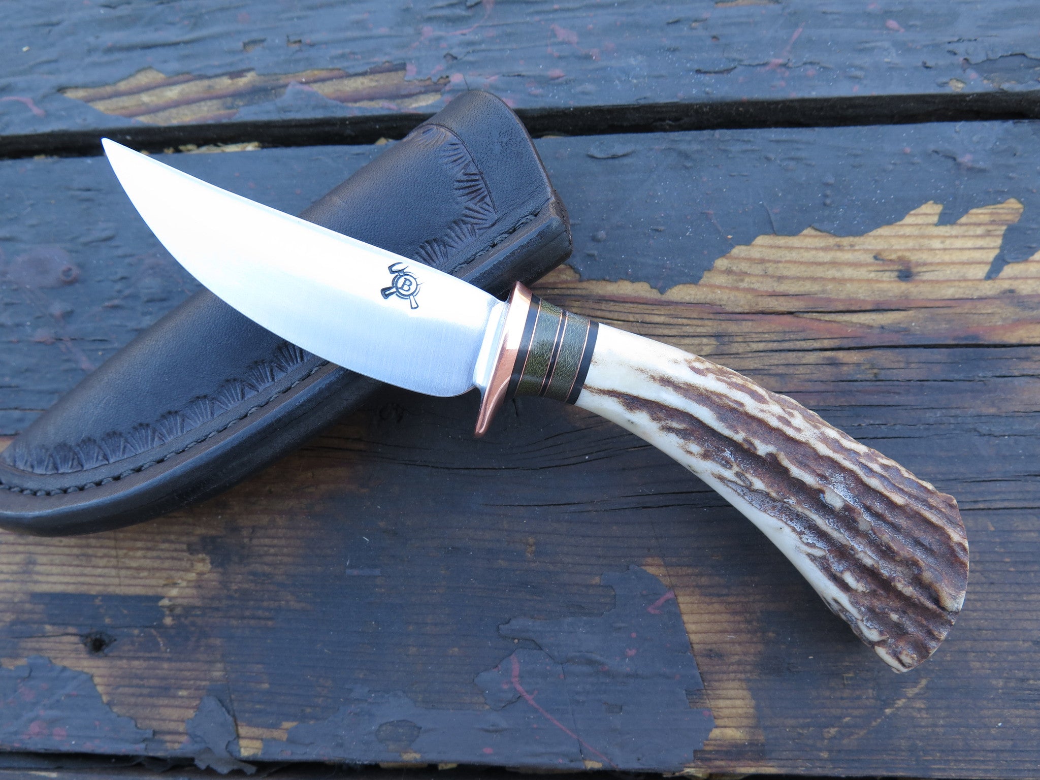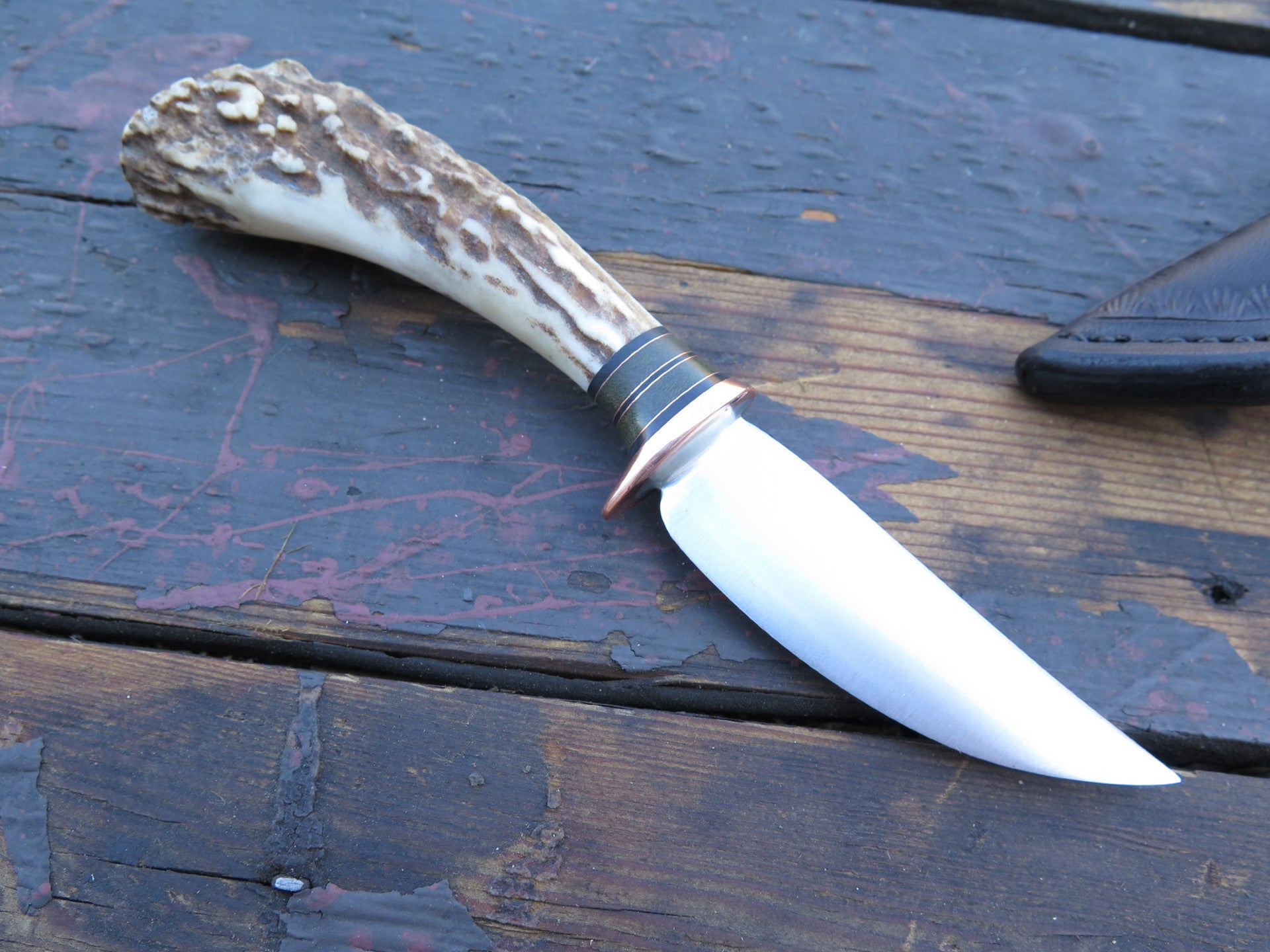 This Behring Made pocket knife is hand forged from 1/8" thick high carbon 01 tool steel and measures 2 3/4" from tip to guard with a razor sharp convex grind. The copper guard is soldered in place above black, copper and green spacers as well as a hand selected sambar stag handle. The overall length measures 6 1/4" and it comes in a convenient pocket carry sheath from Glacier Leather.