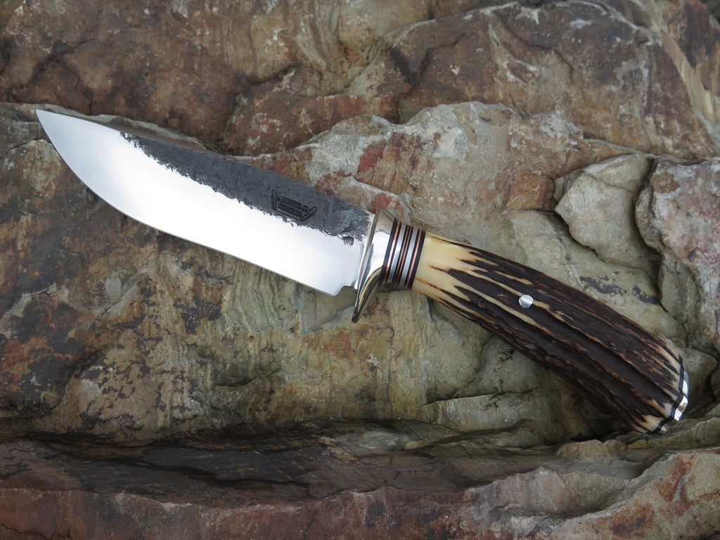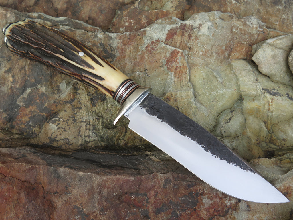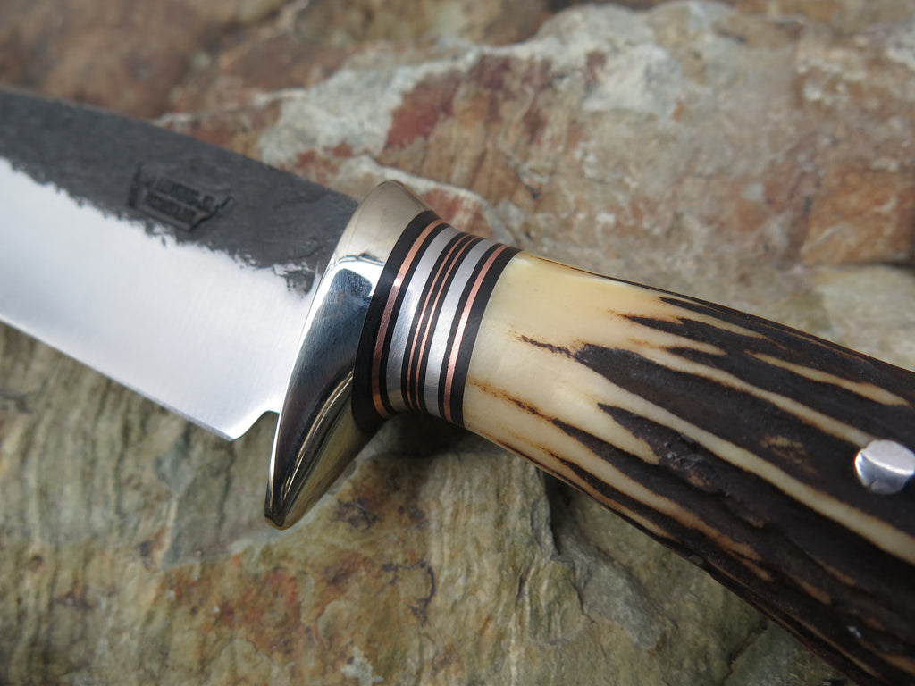 This stand out Behring Made recurve drop point is easily a shop favorite from the latest batch of custom handmades. The high carbon steel blade measures 5 1/2" from tip to guard with a razor sharp hollow grind and hammermark finish. The nickel silver guard is soldered in place above black, copper and aluminum spacers. The sambar stag handle features a nickel silver butt cap giving this guy an overall length of 10 1/4". The lines on this thing are just plain gorgeous, and we're doing it justice with a custom sheath from Rowe's Leather and it will be ready to ship mid-March.