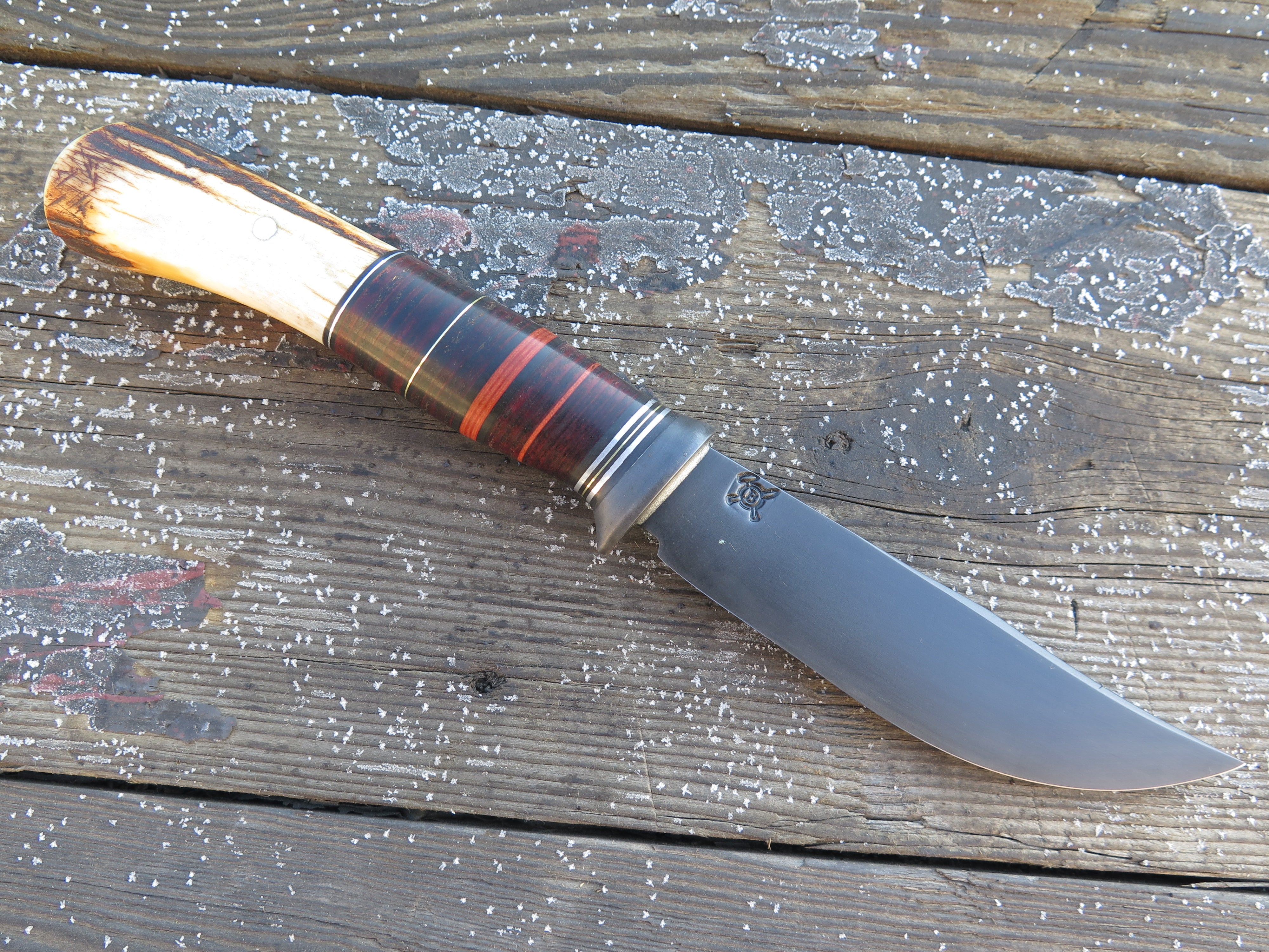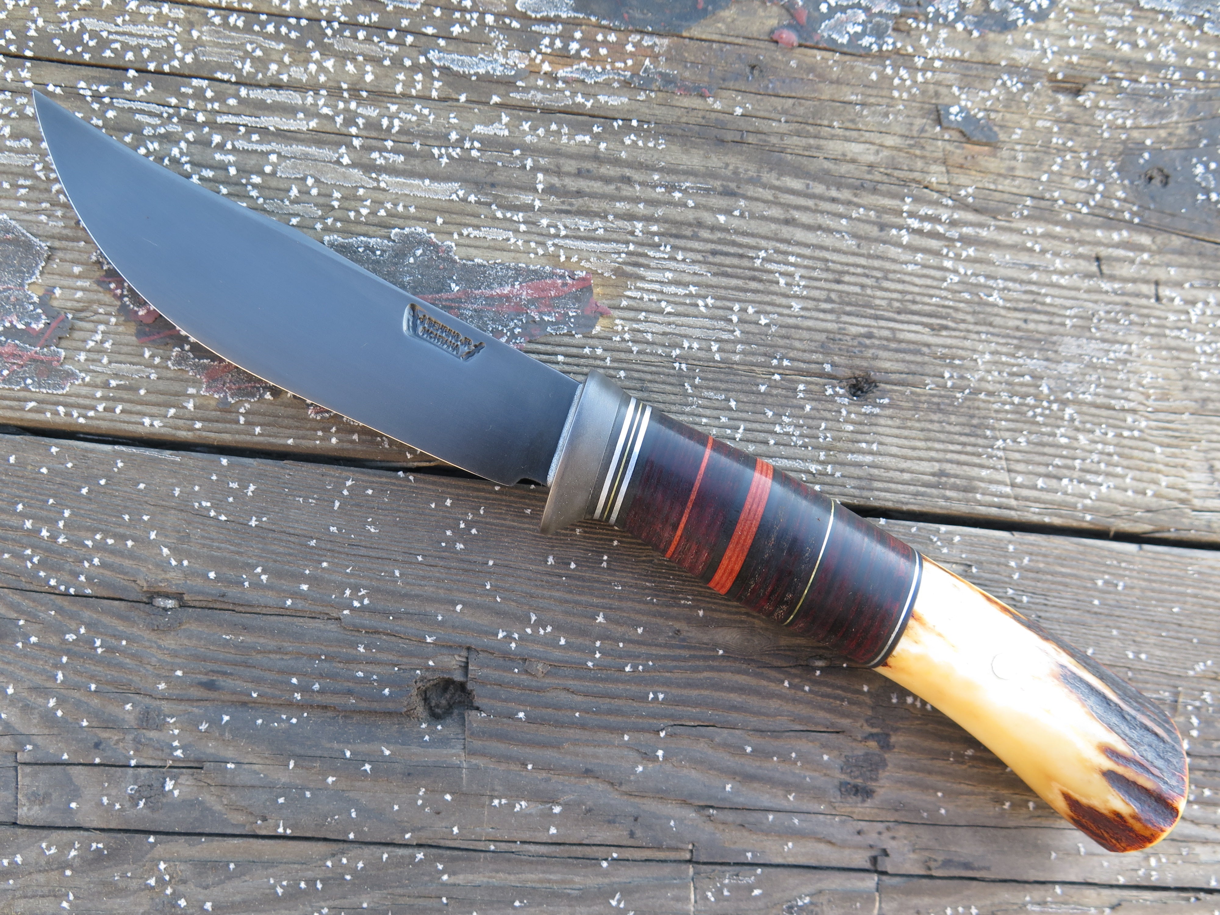 This unique Behring Made© Trout & Bird is hand forged from 1/8" thick high carbon 01 tool steel and it measures 4" from tip to guard with a razor sharp convex grind and our forced patina blued finish- plus it features a fatter belly than you'd usually see from our shop for an old school personality. The blued steel guard is soldered in place above black and maroon fiber, brass, aluminum and horsehide spacers as well as a premium sambar stag butt that's pinned through the tang with aluminum. The overall length measures 8 1/2" and it comes in a custom sheath from Warlander Leather.