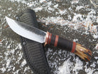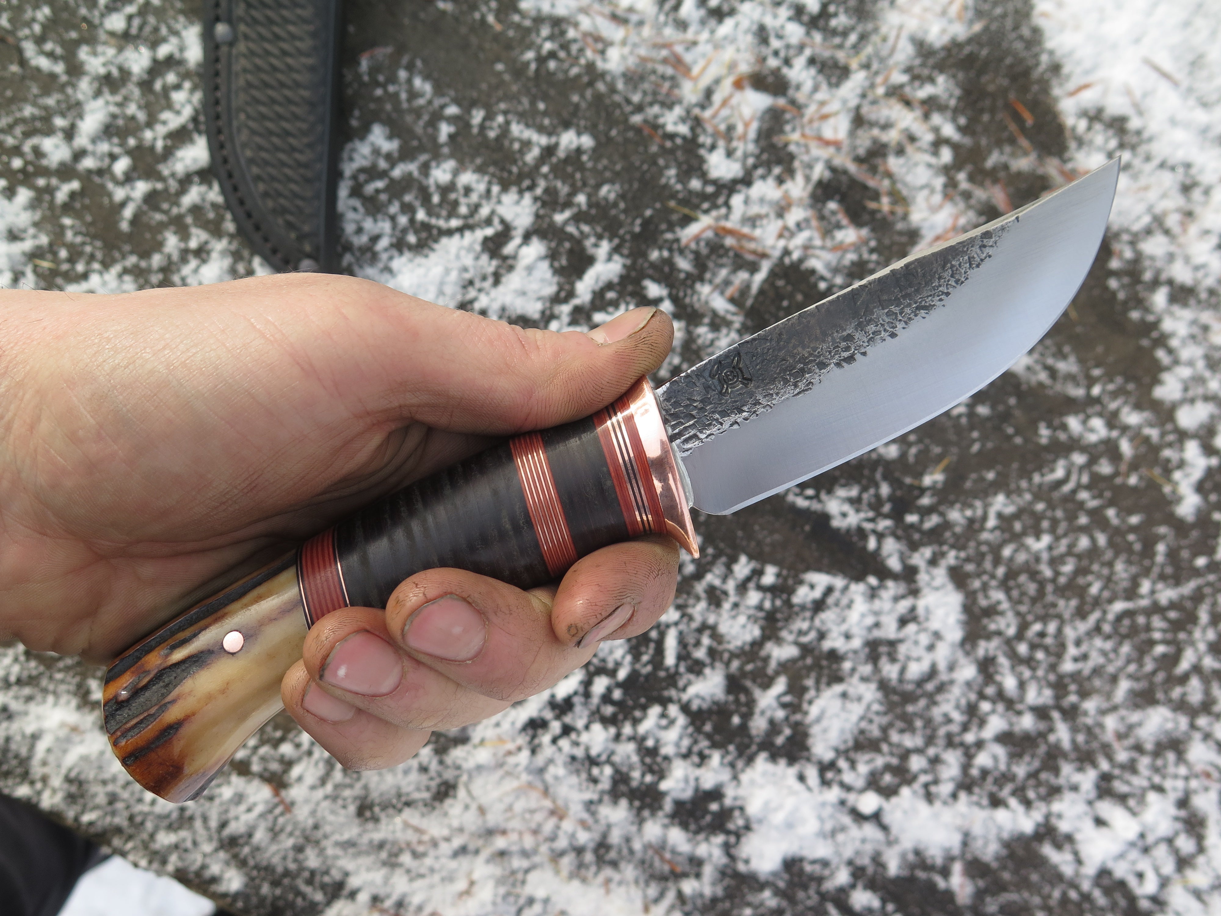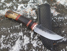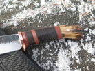 This classic Hunter from Behring Made© is hand forged from 1/8" thick high carbon 01 tool steel and it measures 4 1/4" from tip to guard with a razor sharp hollow grind and our hammermark finish. The copper guard is soldered in place above black and maroon fiber with copper and horsehide spacers as well as a premium sambar stag butt that's pinned through the tang with copper. The overall length measures 8 7/8" and it comes in a simple leather belt pouch sheath, guaranteed for life!