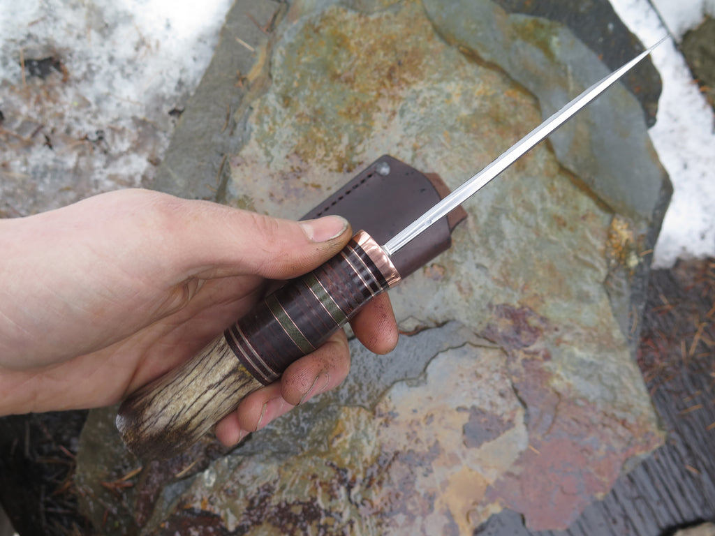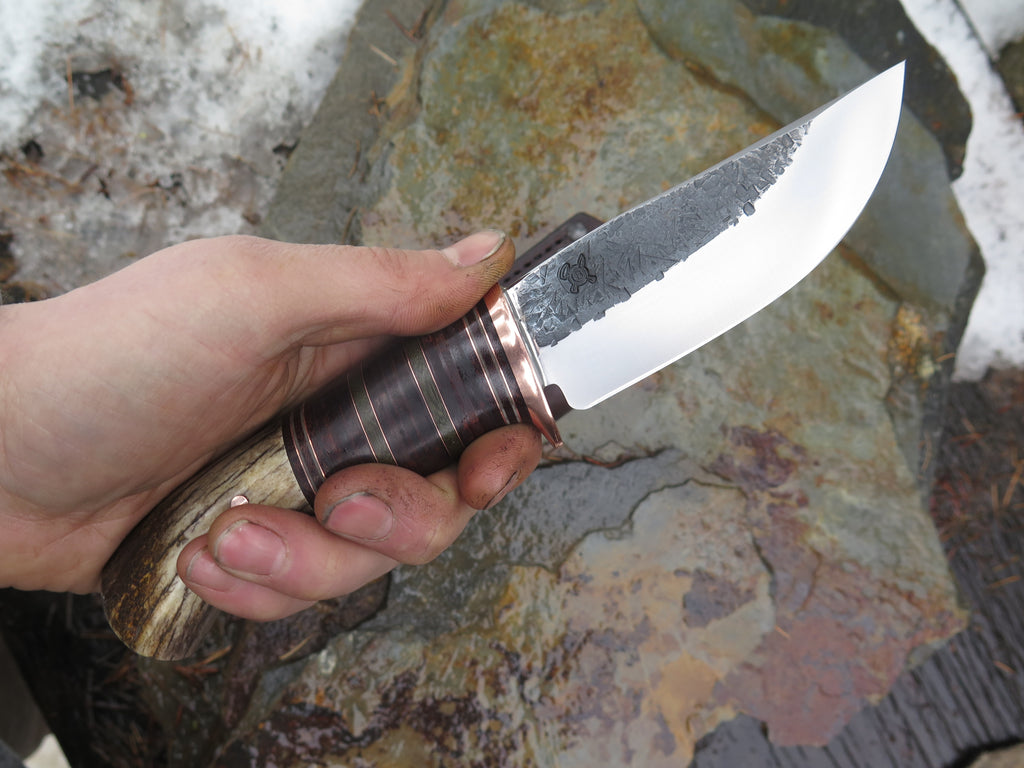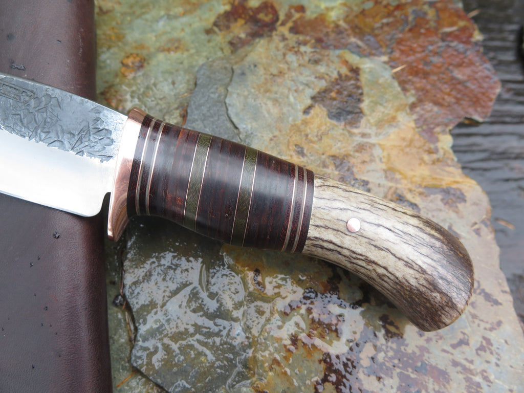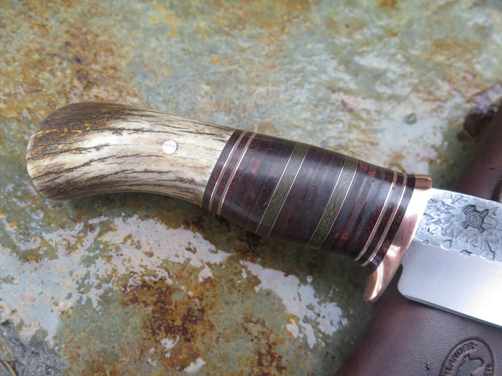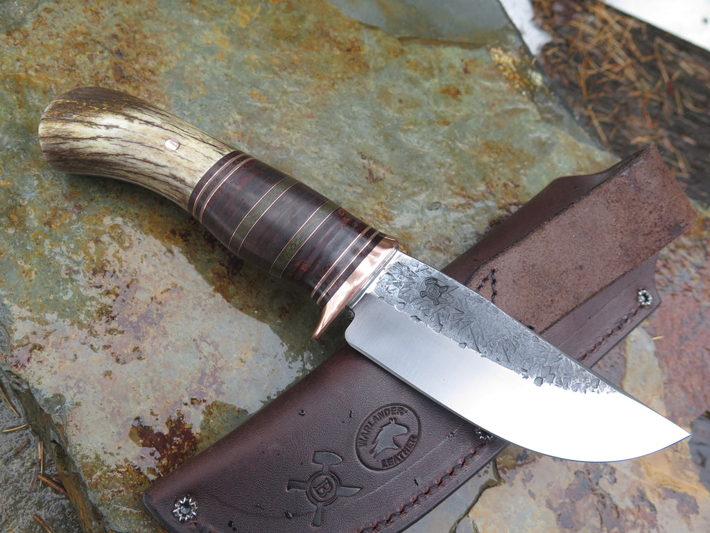 This beautiful new Hunter from Behring Made© is hand forged from 3/16" thick high carbon 01 tool steel and it measures 4 1/2" from tip to guard with a razor sharp hollow grind and our hammermark finish. The copper guard is soldered in place above black and gray fiber, copper, green micarta and horsehide leather spacers with a mule deer butt that's pinned through the tang with copper. The overall length measures 9" and it comes in a classic leather belt pouch sheath.