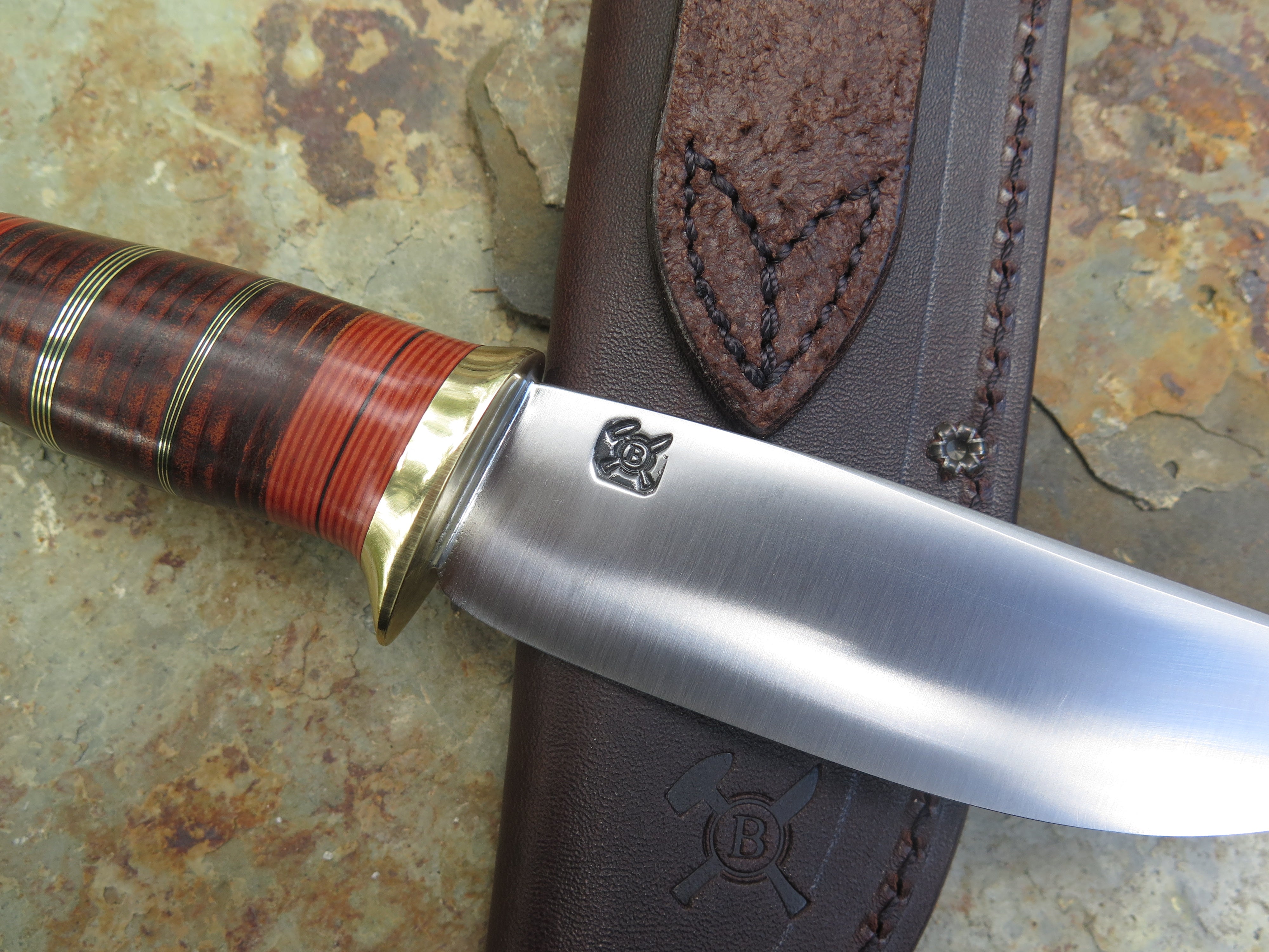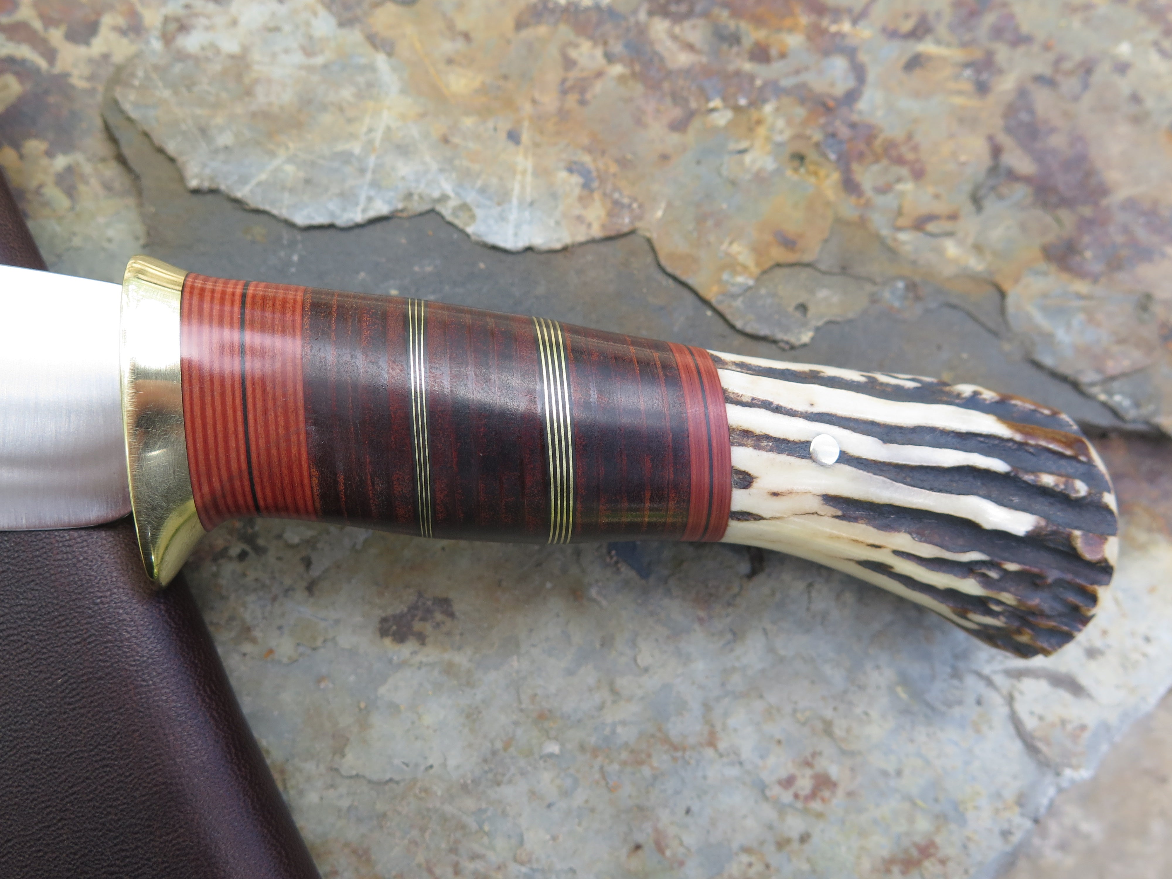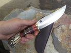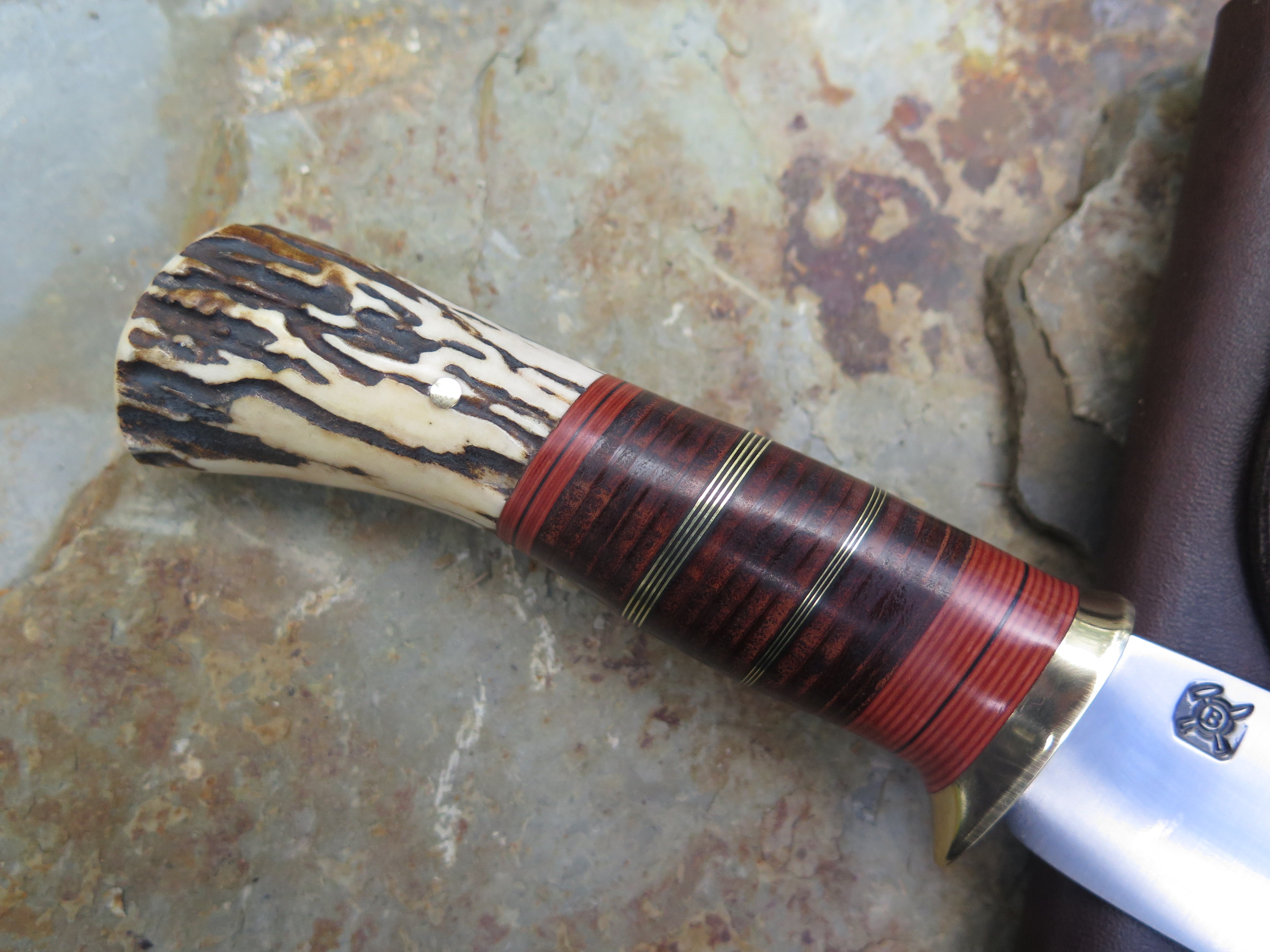 This new Behring Made© is a classic Hunter that we hand forged from 3/16" thick high carbon 01 tool steel and it measures just shy of 5" from tip to guard with a razor sharp convex grind. The brass guard is soldered in place above black and maroon fiber, brass and horsehide leather spacers. The premium sambar stag butt is pinned through the tang with brass and brings the overall length out to 9 5/8", plus it comes field ready in a simple leather belt pouch sheath.