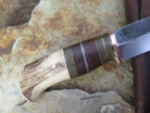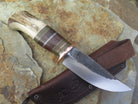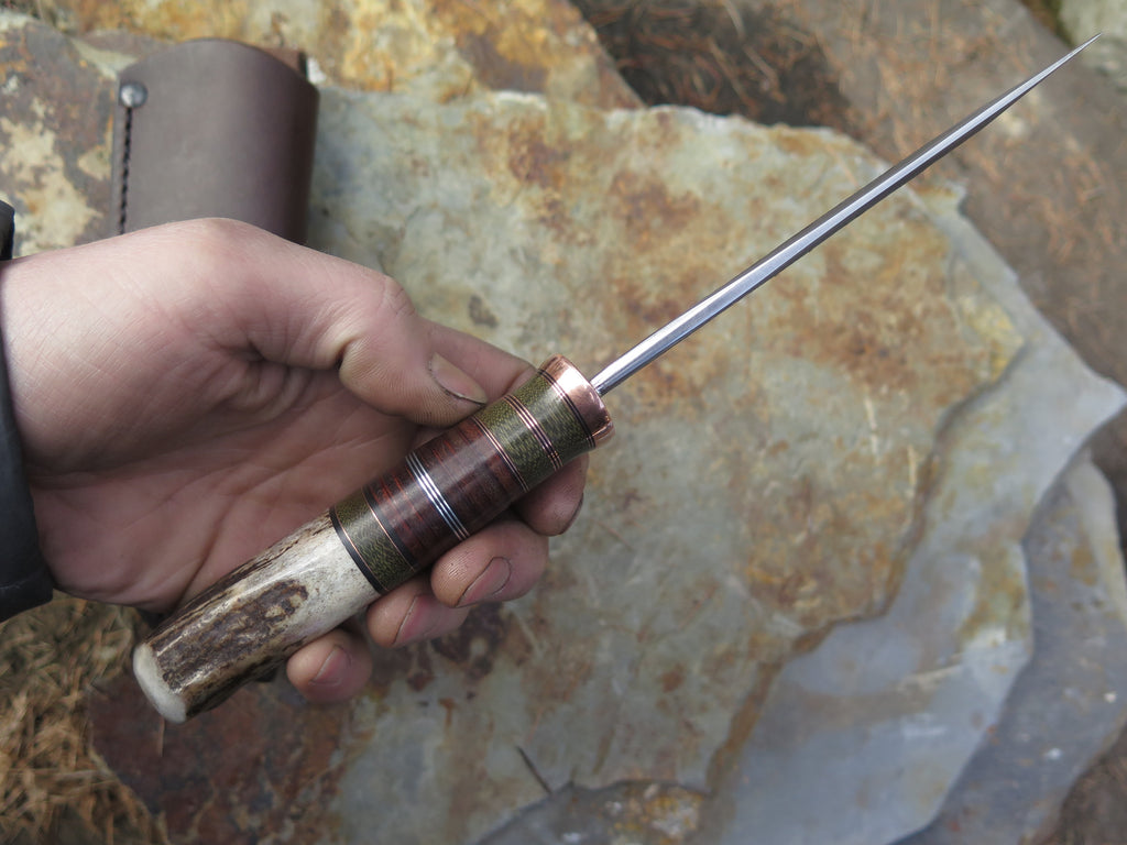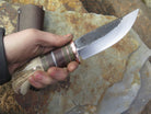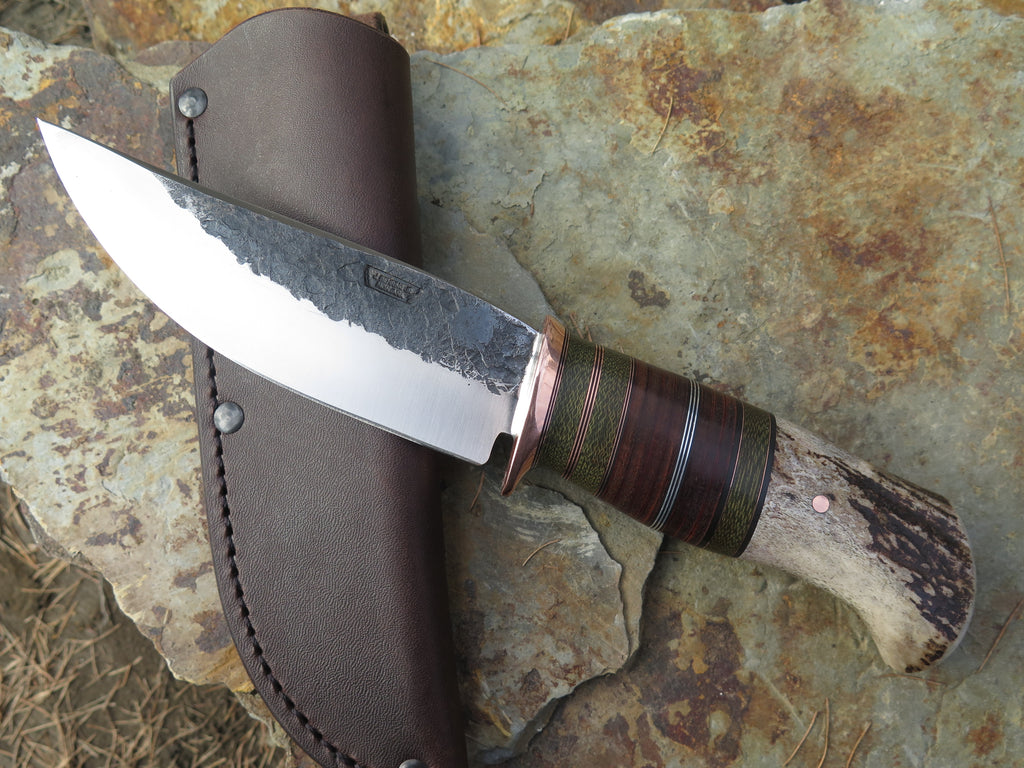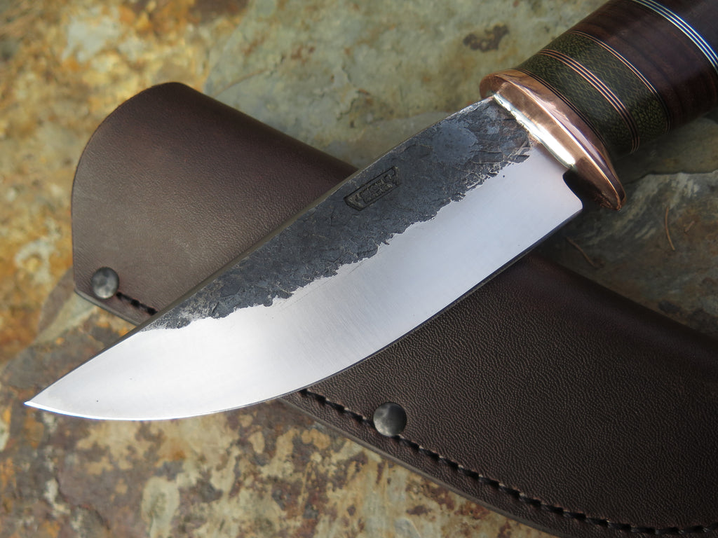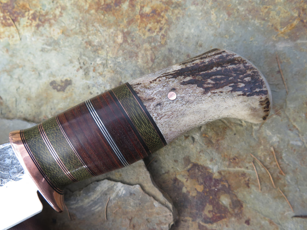 This beautiful new Hunter from Behring Made© is hand forged from 3/16" thick high carbon 01 tool steel and it measures 5" from tip to guard with a razor sharp hollow grind and our hammermark finish. The copper guard is soldered in place above black fiber, copper, aluminum and horsehide leather spacers as well as a premium shiras moose butt that's pinned through the tang with copper. The overall length measures 9 5/8" and it comes in a classic leather belt pouch sheath.