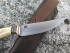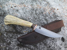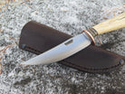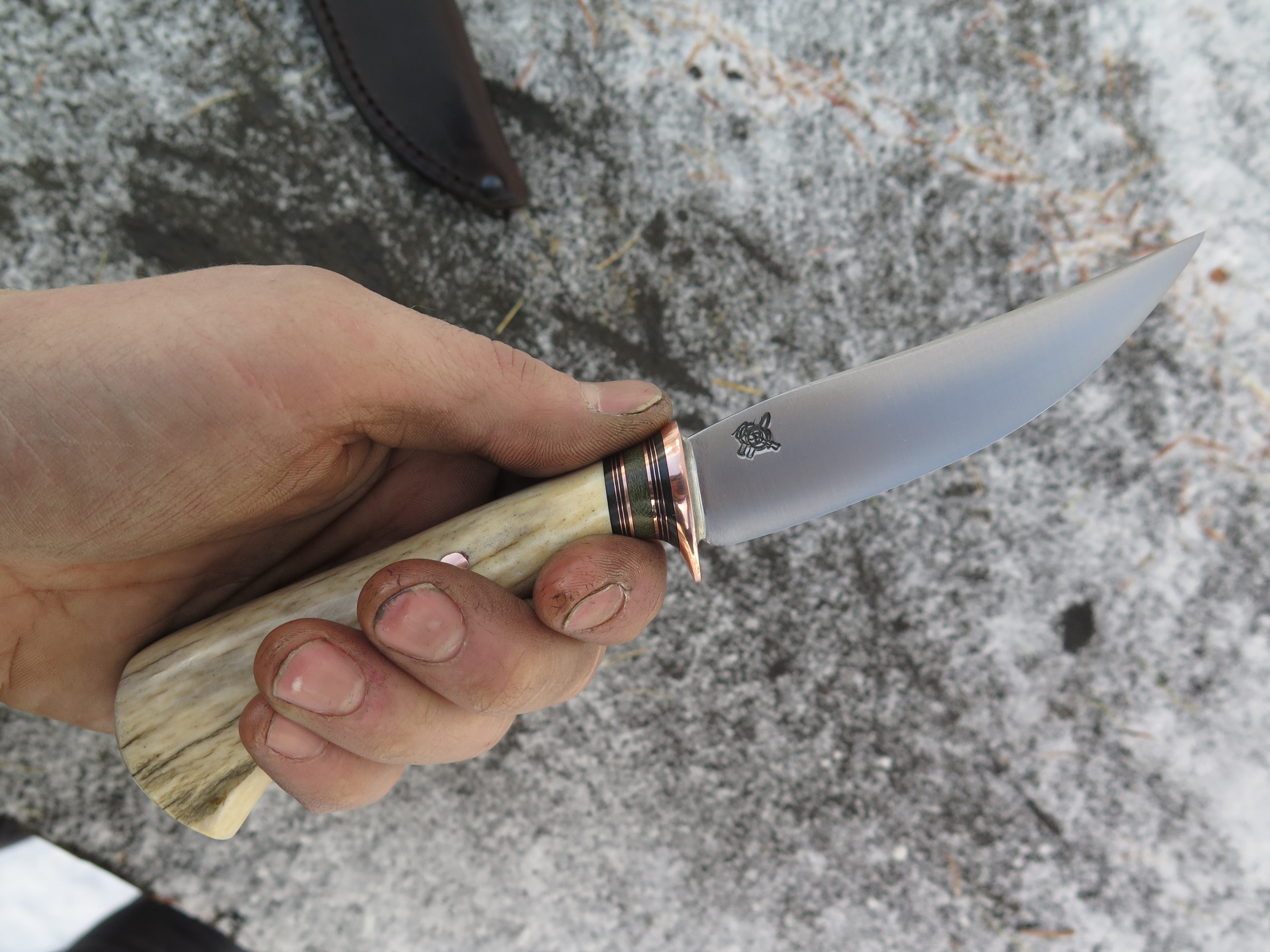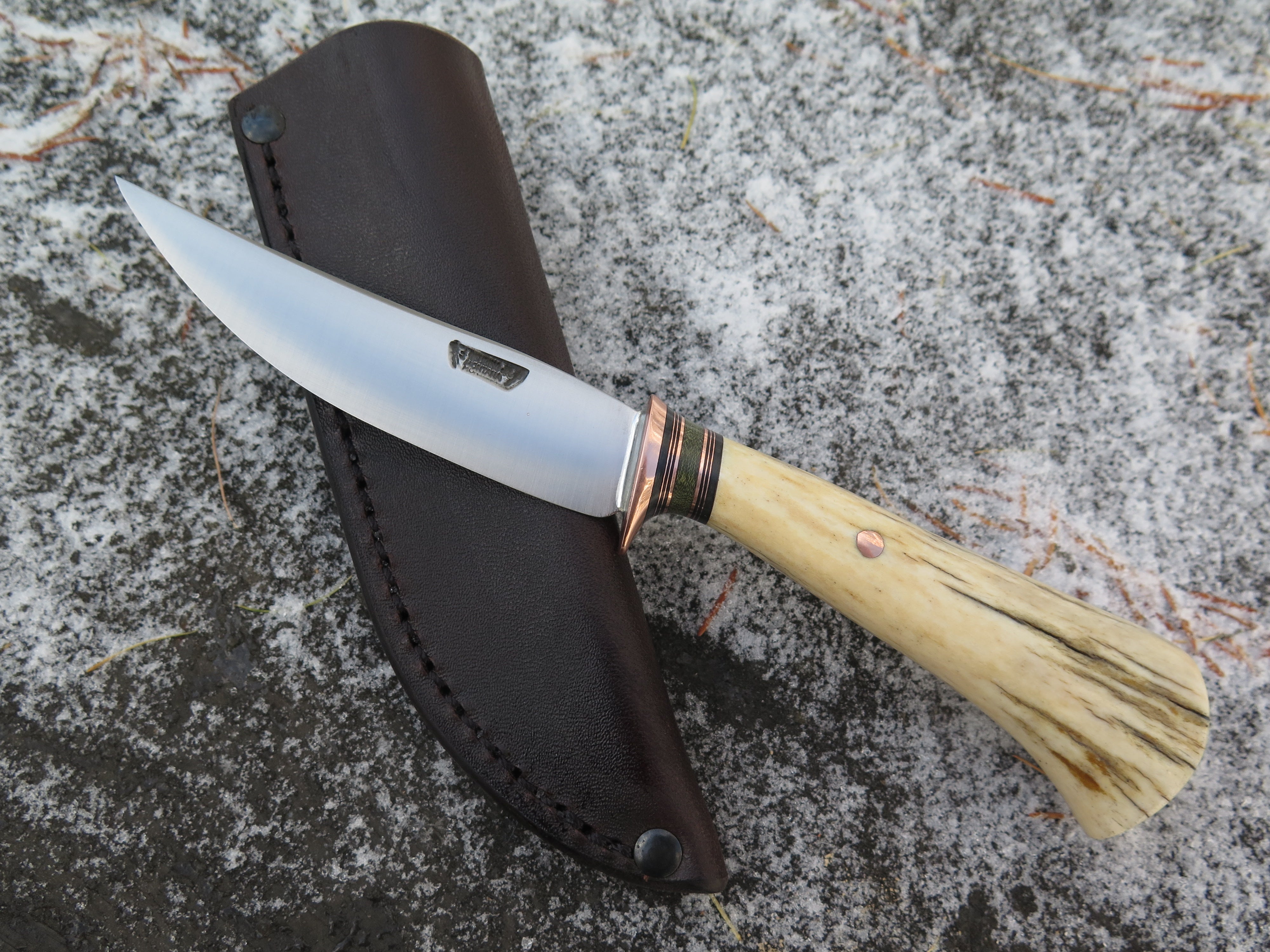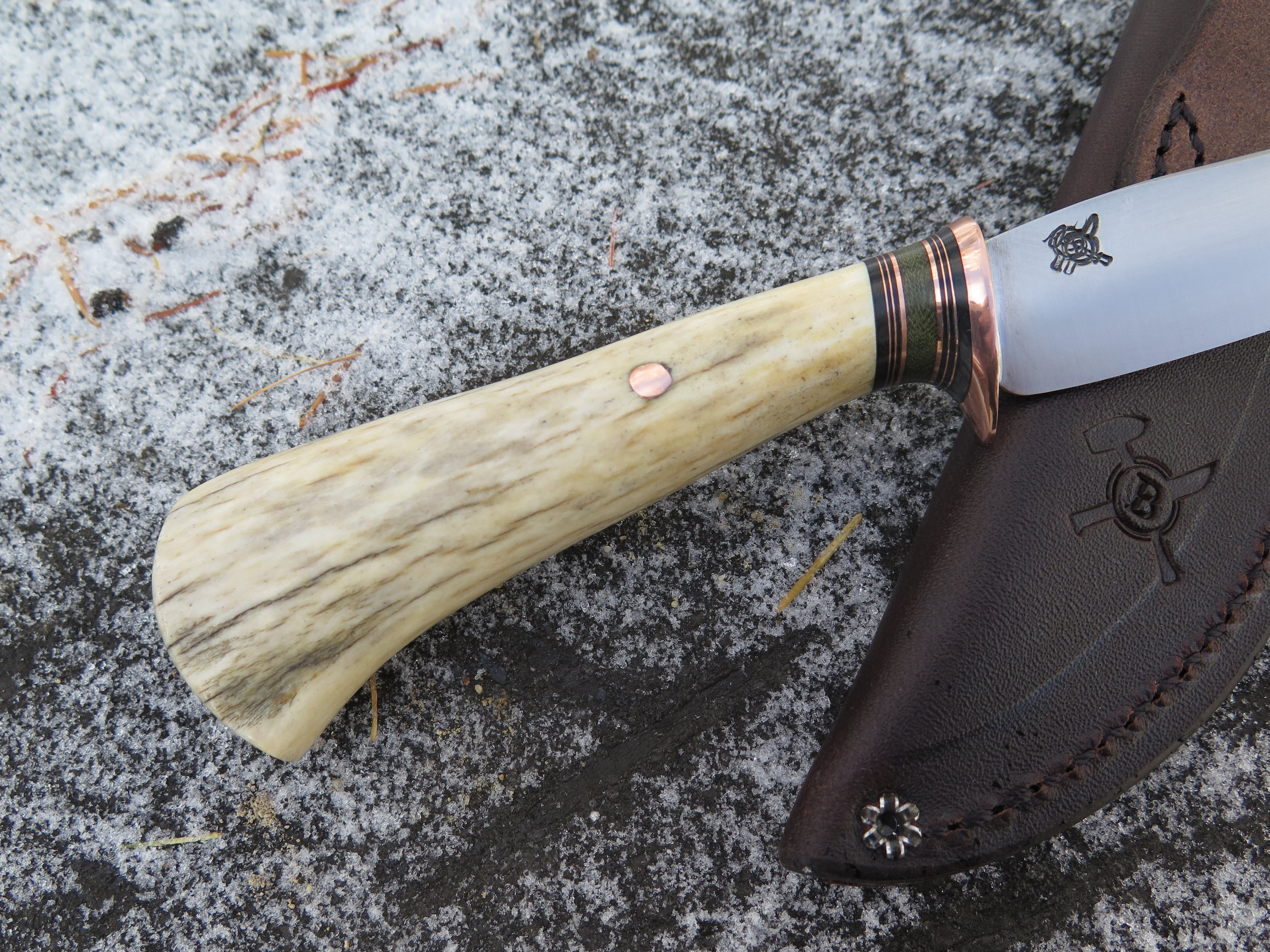 This new Pintail from Behring Made© is hand forged from 1/8" thick high carbon 01 tool steel and it measures 4" from tip to guard with a razor sharp convex grind. The copper guard is soldered in place above black fiber, green micarta and copper with a beautiful shiras moose antler handle that is pinned through the tang with copper. Overall length measures 8 1/2" and it comes in a classic belt pouch sheath, guaranteed for life!