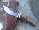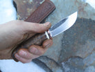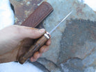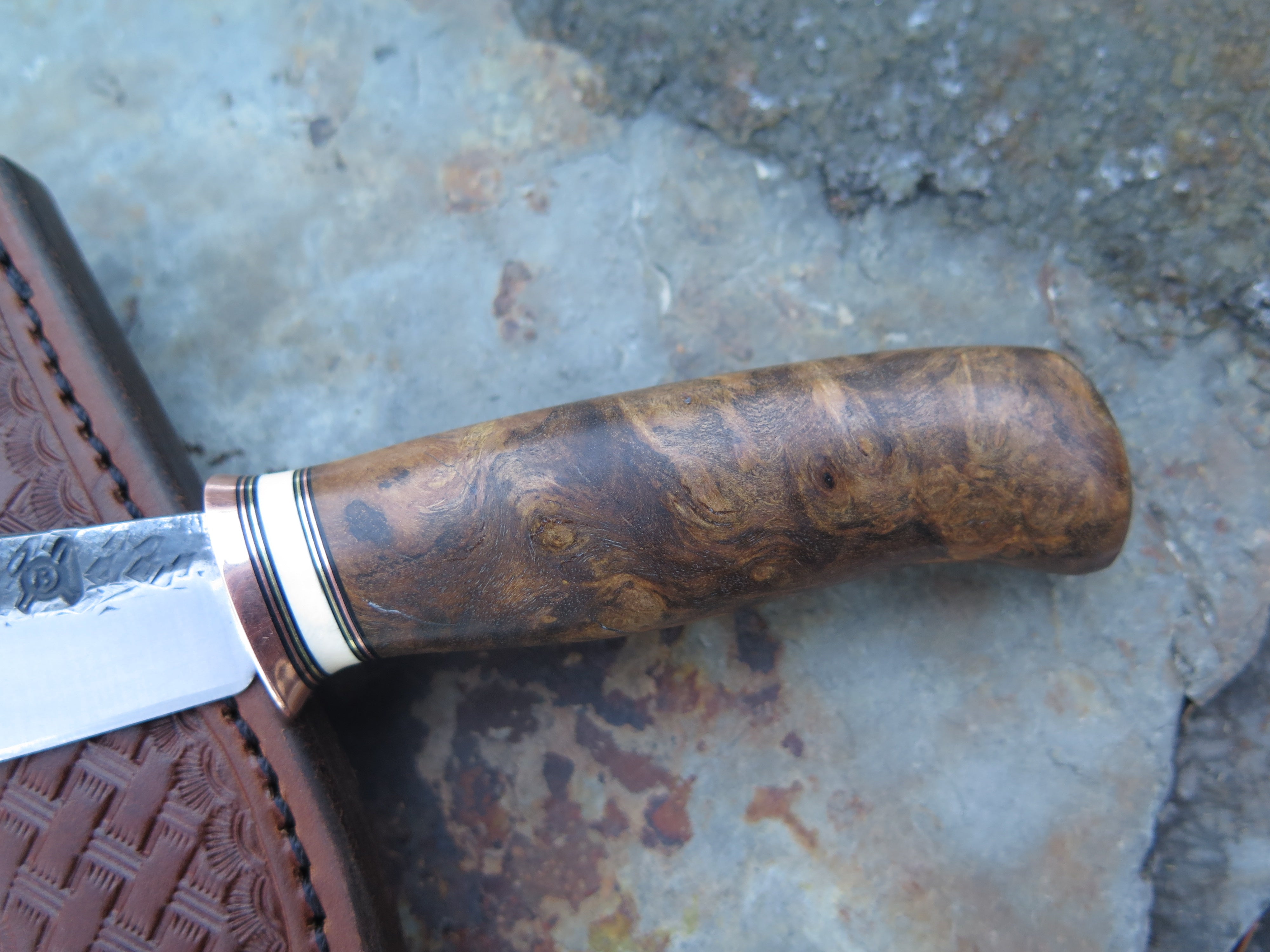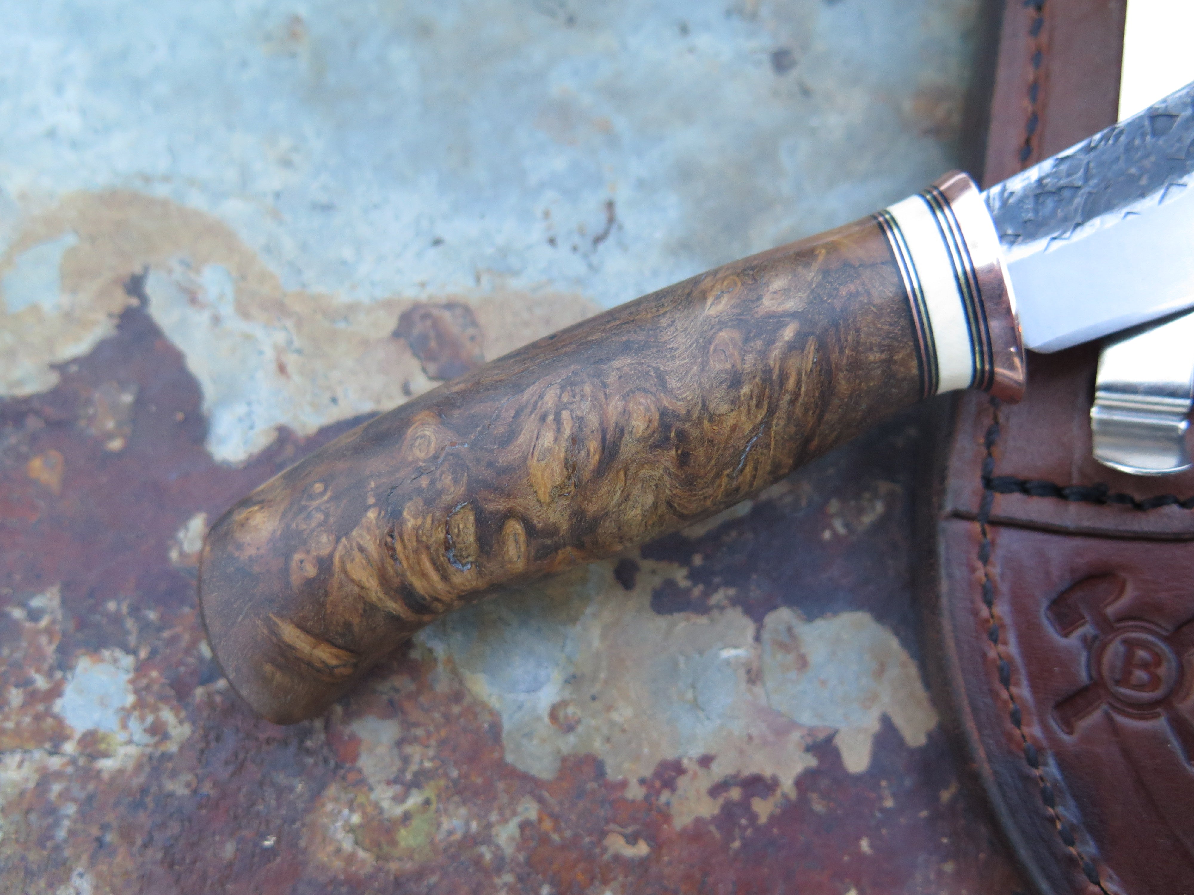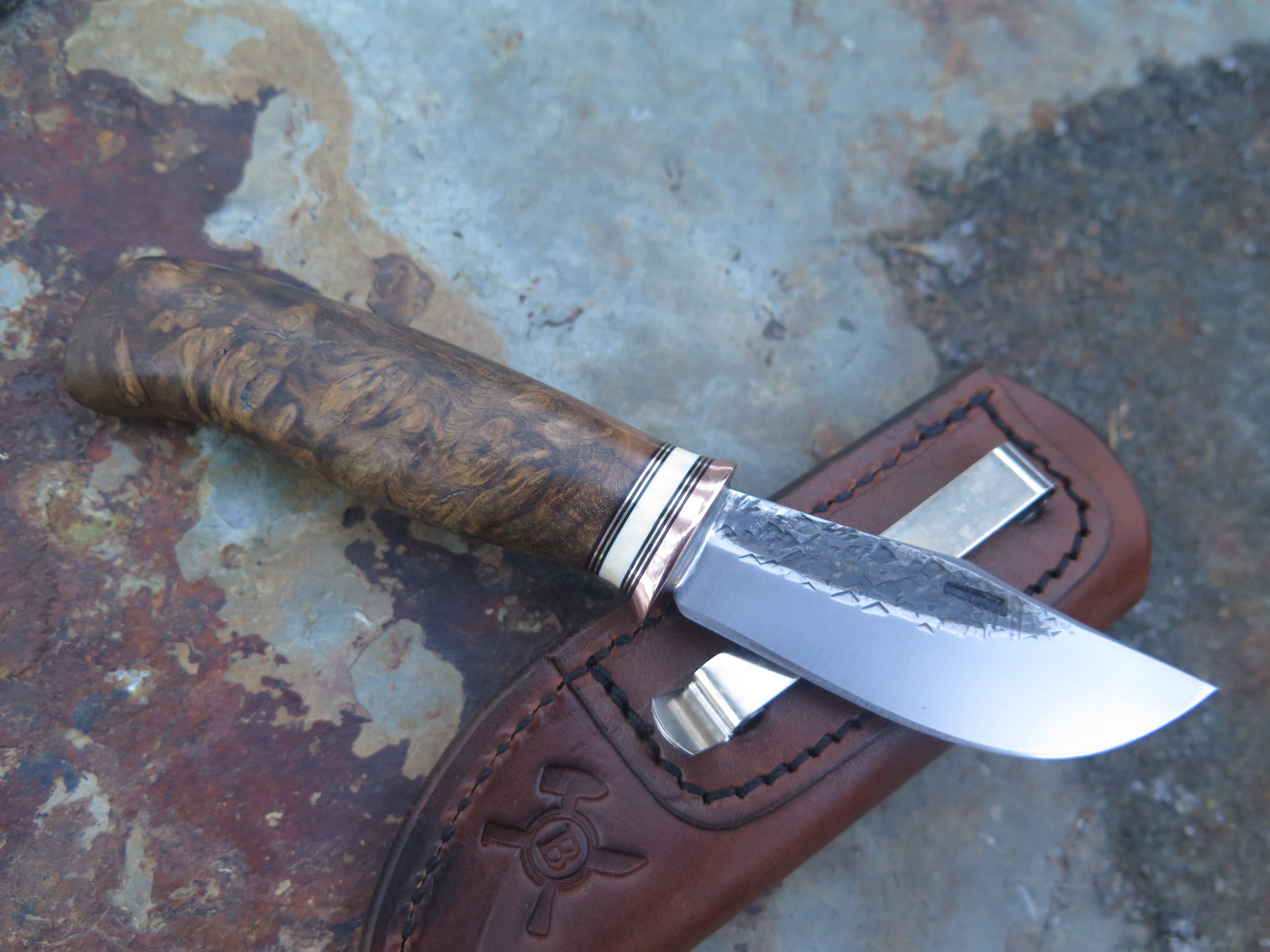 This beautiful new Pocket Knife from Behring Made© is hand forged from 1/8” thick high carbon 01 tool steel and it measures 3“ from tip to guard with a razor sharp hollow grind and our hammermark finish. The copper guard is soldered in place above black fiber, copper, brass and ancient mammoth ivory spacers as well as a first-edition Sindora burl wood handle- she's a beauty!. The overall length measures just over 6 1/2“ and it comes in a spring clip pocket clip leather sheath from Warlander.