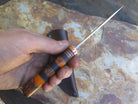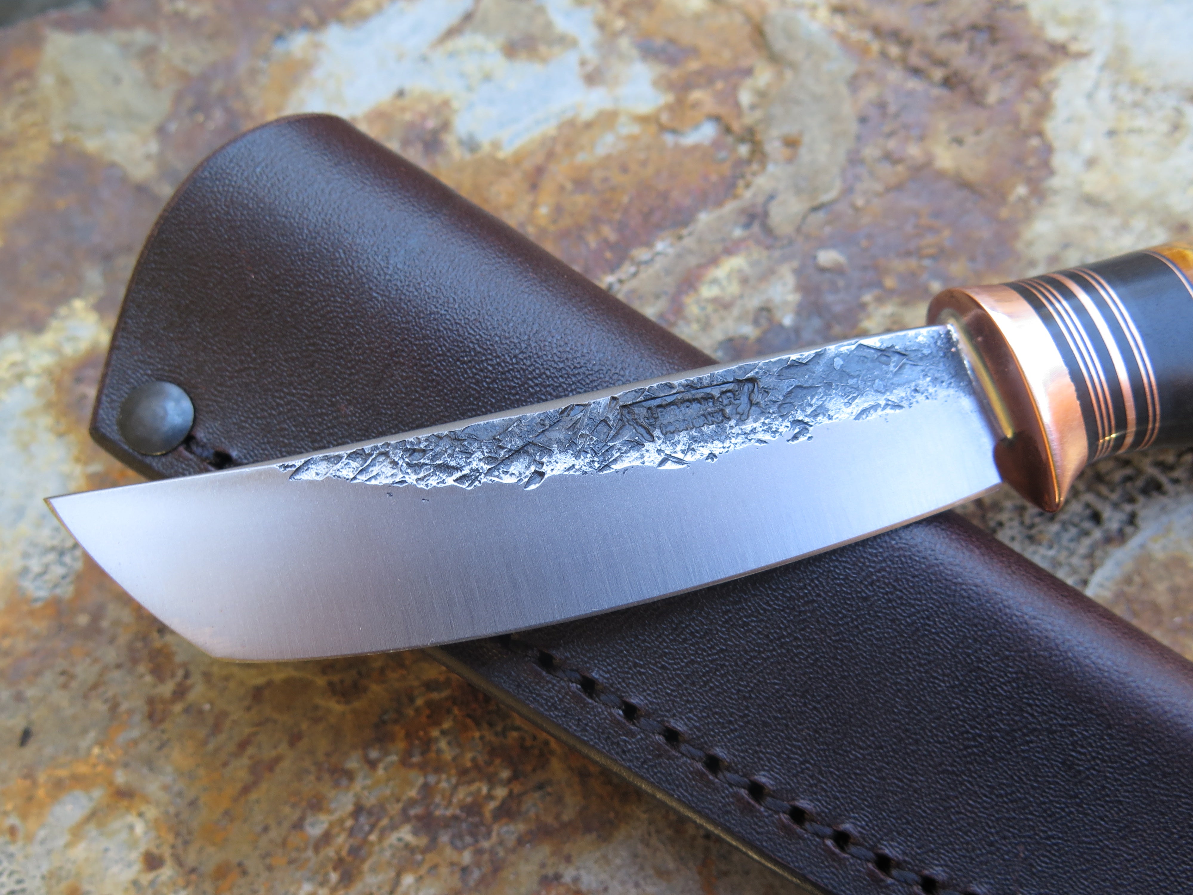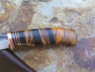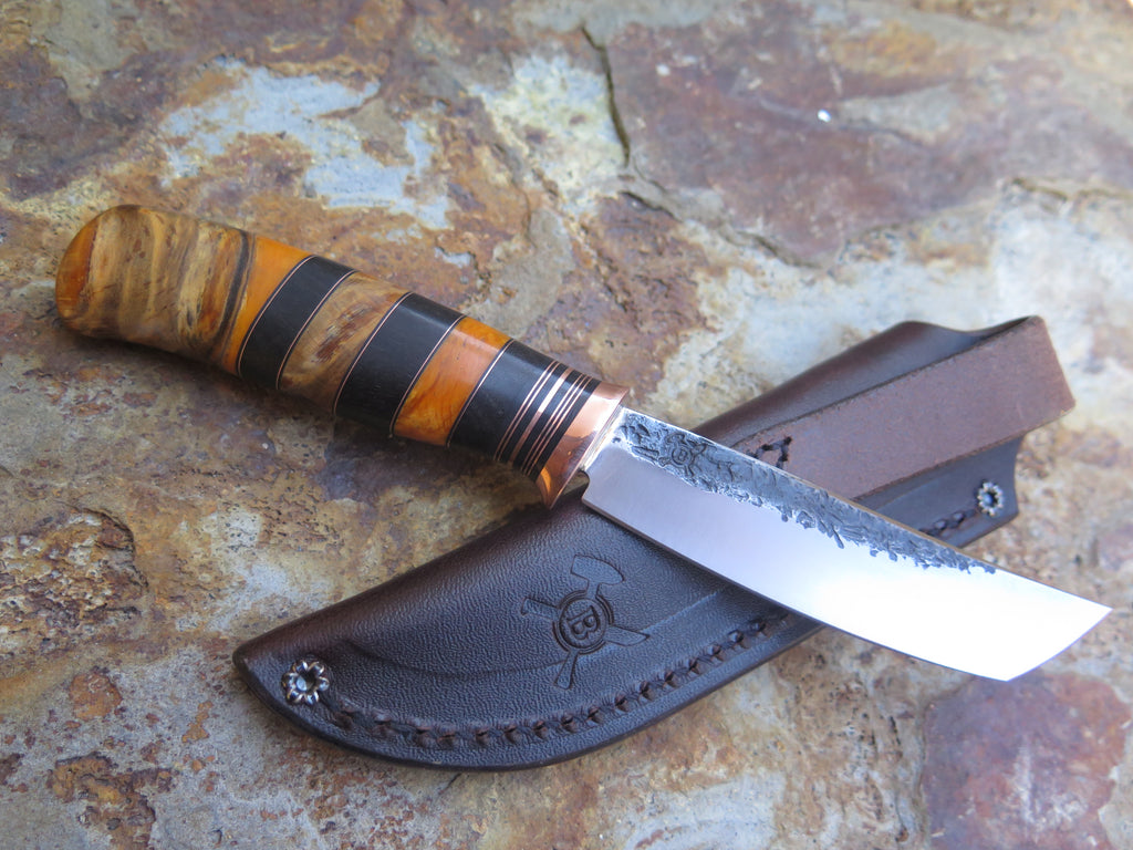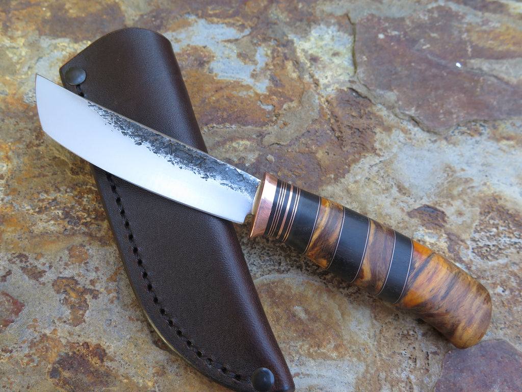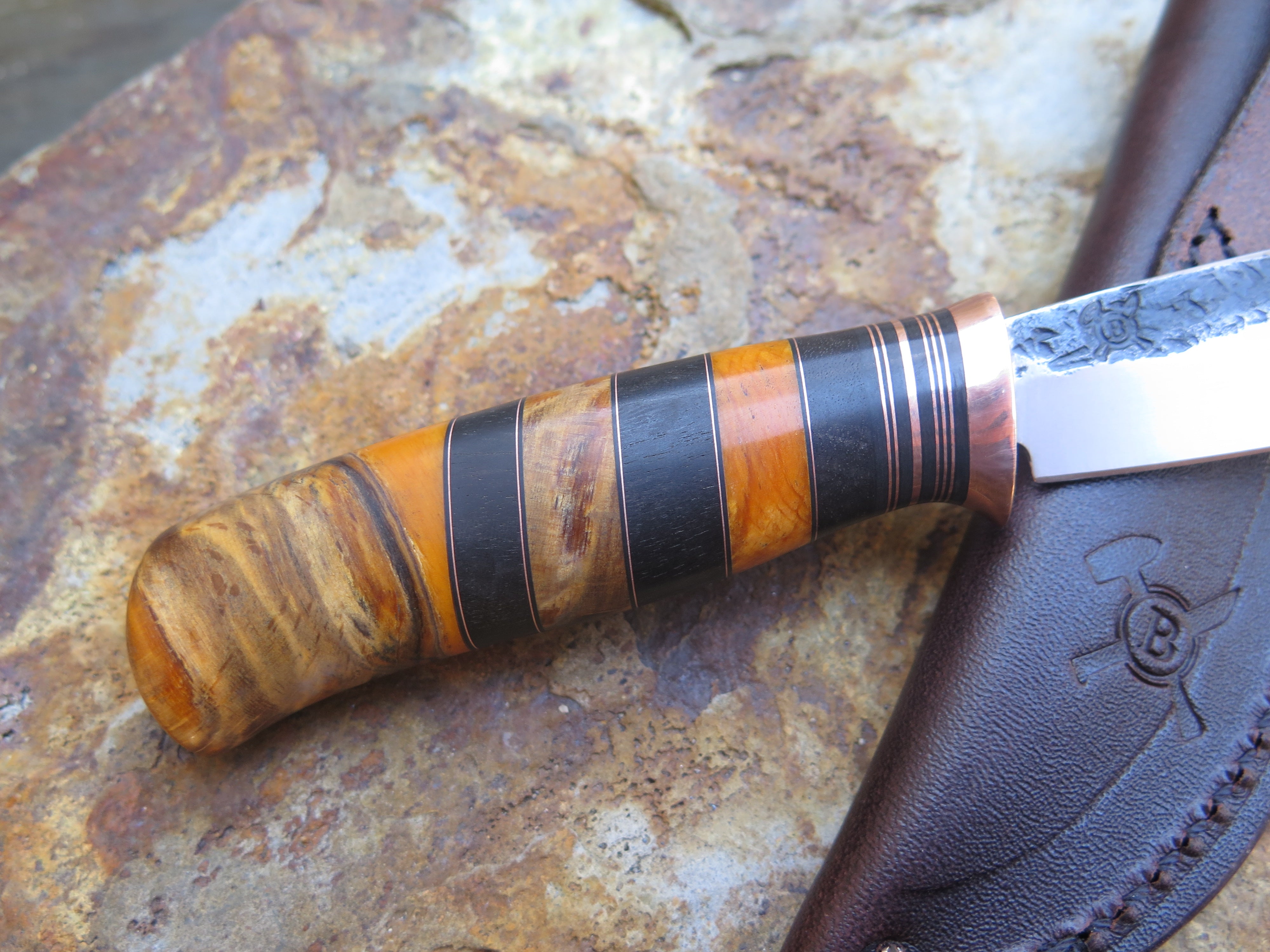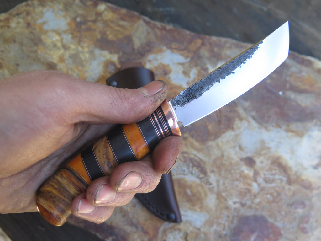 This bad ass new Tanto from Behring Made© is hand forged from 1/8" thick high carbon 01 tool steel and it measures 3 3/4" from tip to guard with a razor sharp hollow grind and our hammermark finish. The copper guard is soldered in place above black fiber and copper spacers in addition to an array of black ebony and stabilized beech wood. The overall length measures just shy of 7 1/2" and it comes in a classic leather belt pouch sheath.