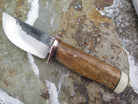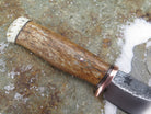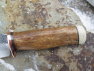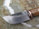 This beautiful new Sharptail from Behring Made© is hand forged from 3/16" thick high carbon 01 tool steel and it measures 3 1/4" from tip to guard with a razor sharp hollow grind and our hammermark finish. The copper guard is soldered in place above black fiber and copper spacers amidst a Stellar's sea cow rib bone handle that's pinned with copper and a musk ox boss butt. The overall length measures 7 3/4" and it will come in a custom sheath from Warlander Leather.