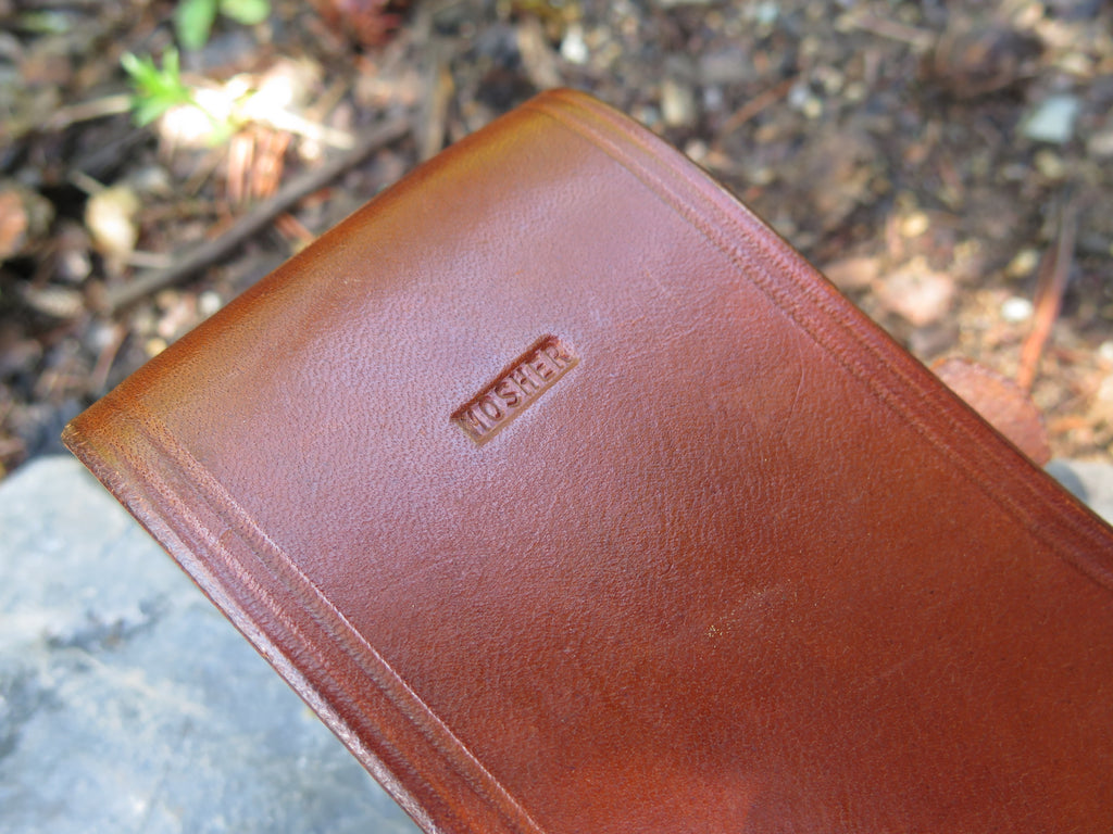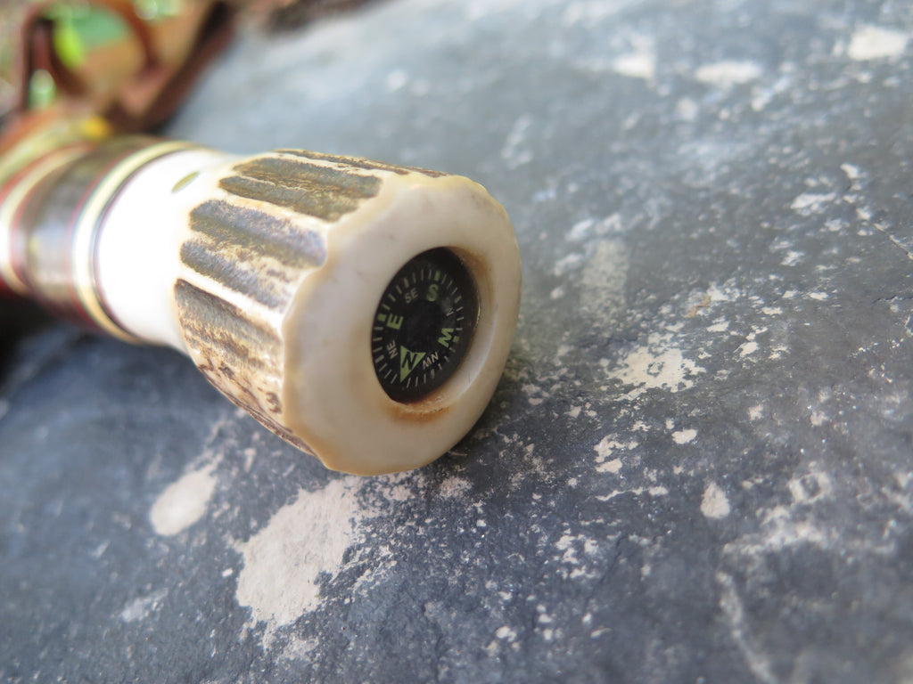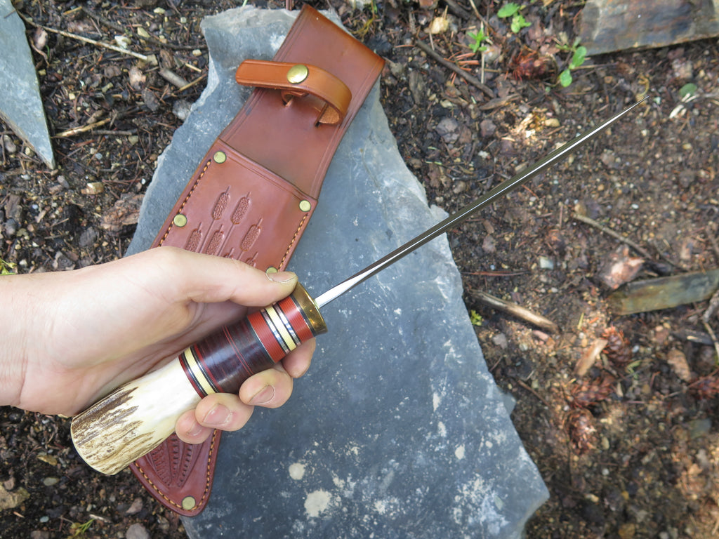 This beastly old Camp knife comes from James' father Jim Behring's shop, aka Treeman Knives. It's hand forged from 1/4" thick high carbon 01 tool steel and it measures 7 3/4" from tip to guard with a razor sharp convex grind. It's stamped with a Scagel Kris, J. Behring Handmade, the retired Treeman logo and USA stamps. The brass guard is soldered in place above black and maroon fiber, ivory micarta, aluminum and horsehide leather spacers which top a premium sambar stag butt that's pinned through the tang with brass and inlaid in the butt with a 14mm compass. The overall length measures about 12 3/4" and it comes in a Jack Mosher custom sheath.