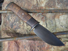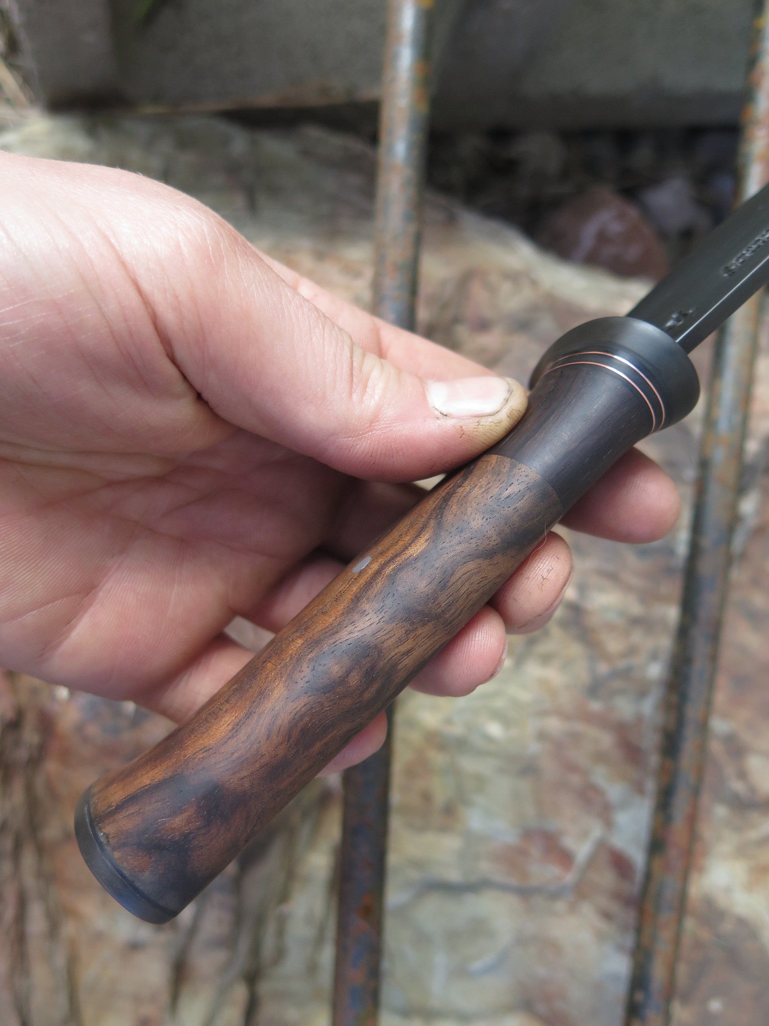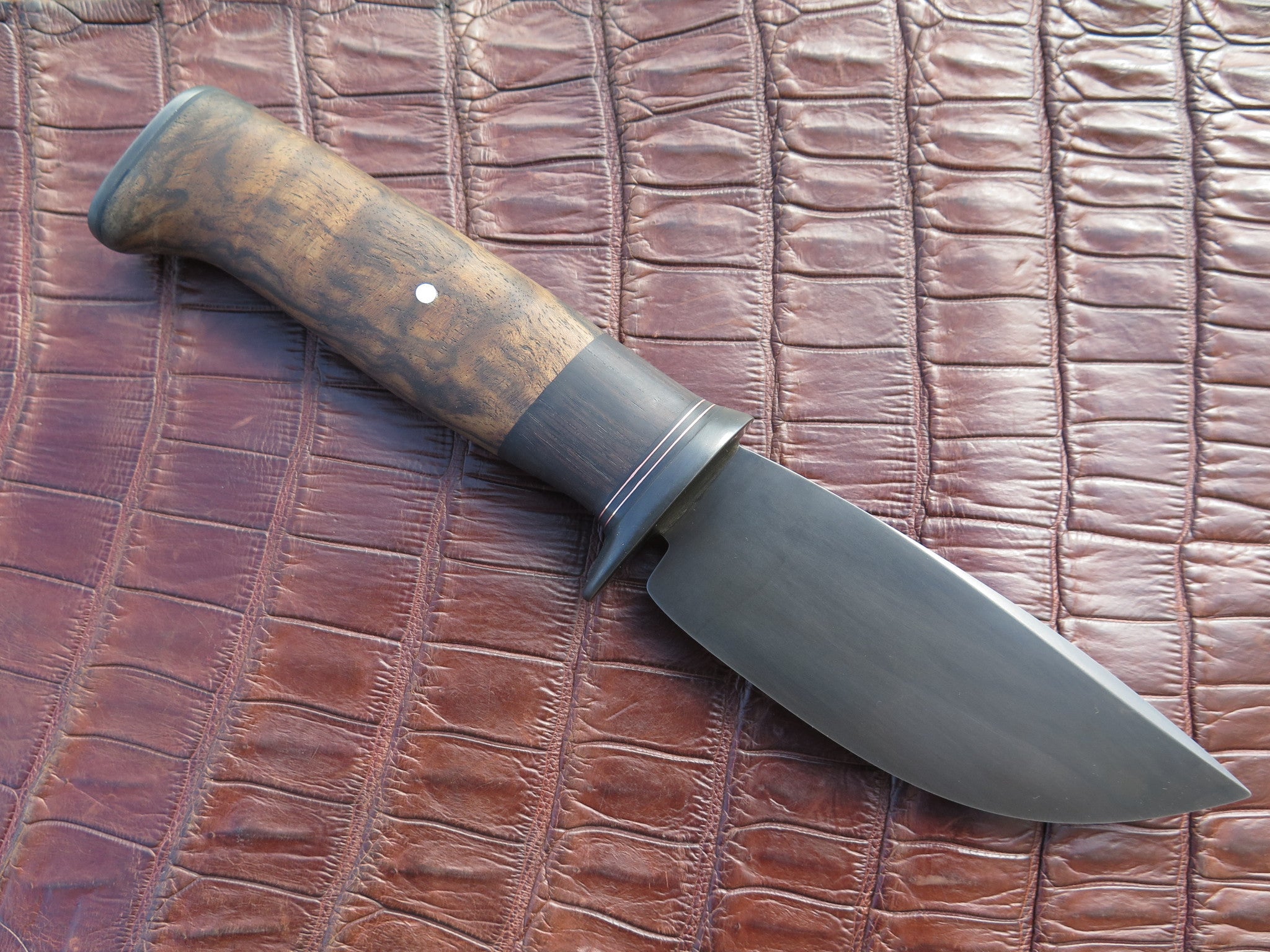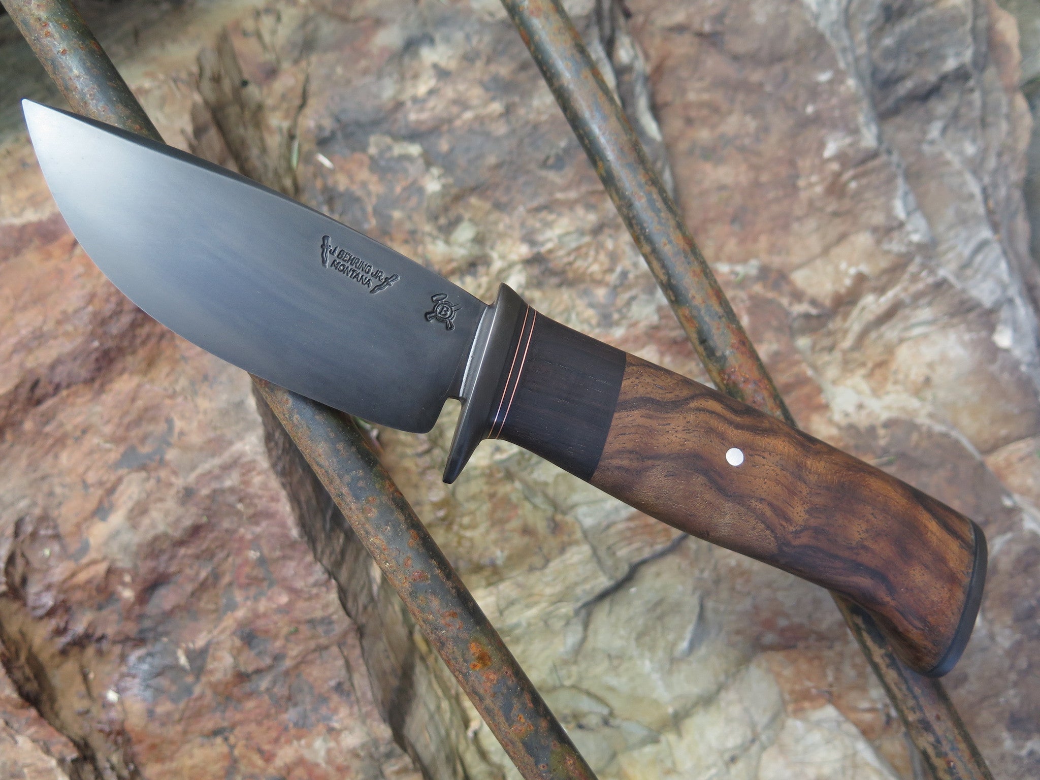This gorgeous new drop point from Behring Made knives is hand forged from high carbon 01 tool steel and it measures 4 1/4" from tip to guard with a razor sharp convex grind and our forced patina blued finish. The blued 01 tool steel guard is soldered in place above black fiber, copper and ebony spacers. The Turkish walnut handle is pinned with aluminum and capped with blued 01 tool steel, giving a measure of 9" overall. This one also comes in an exotic inlay custom sheath from Warlander Leather.