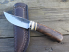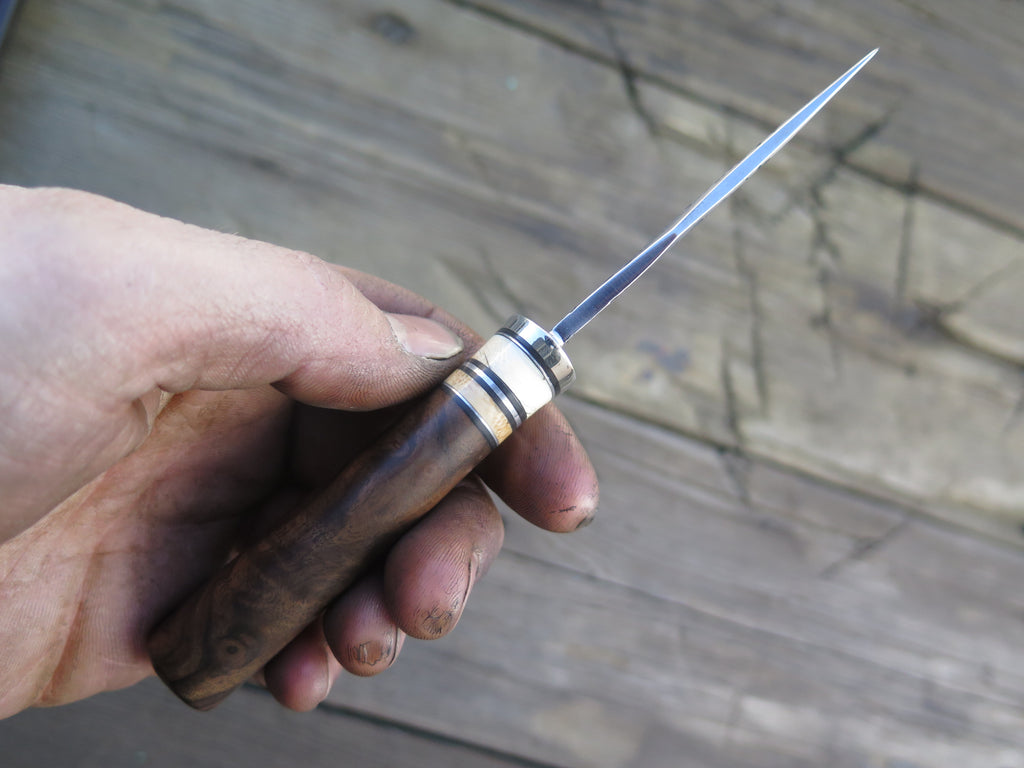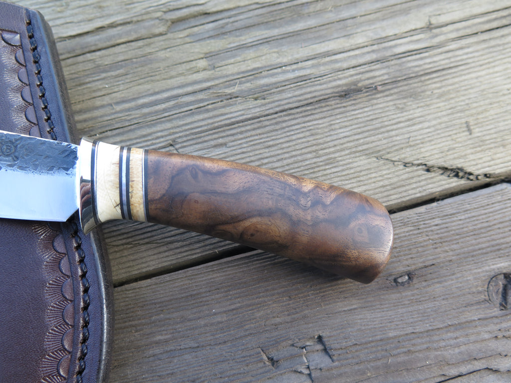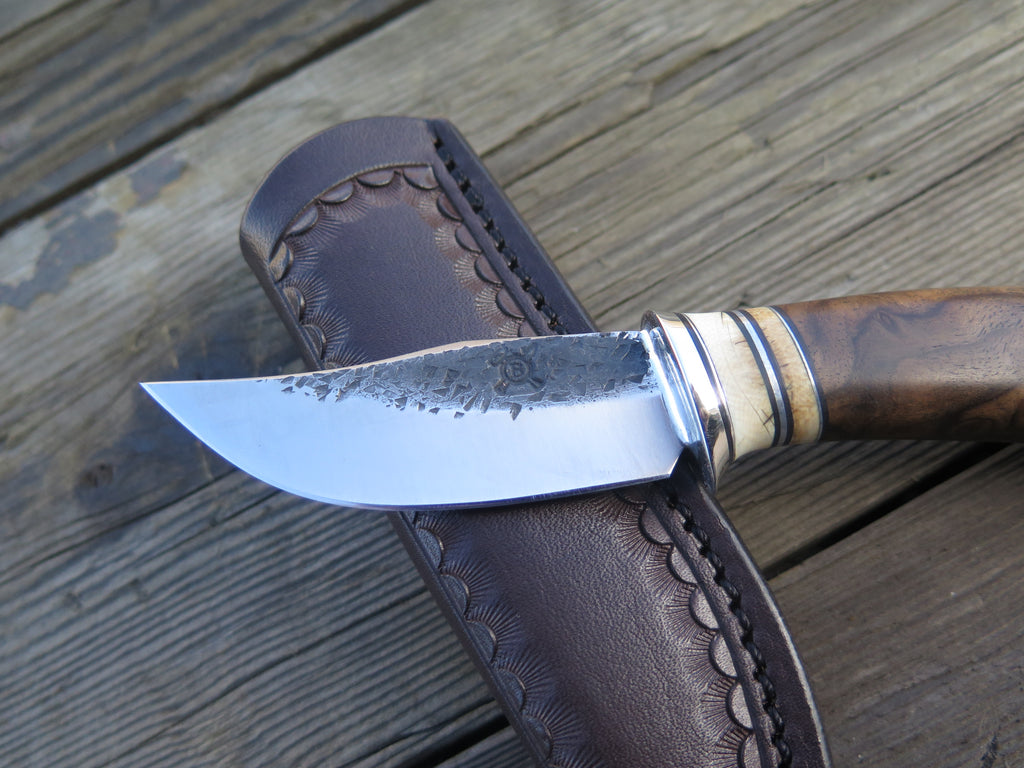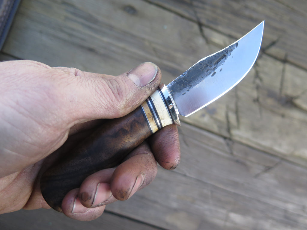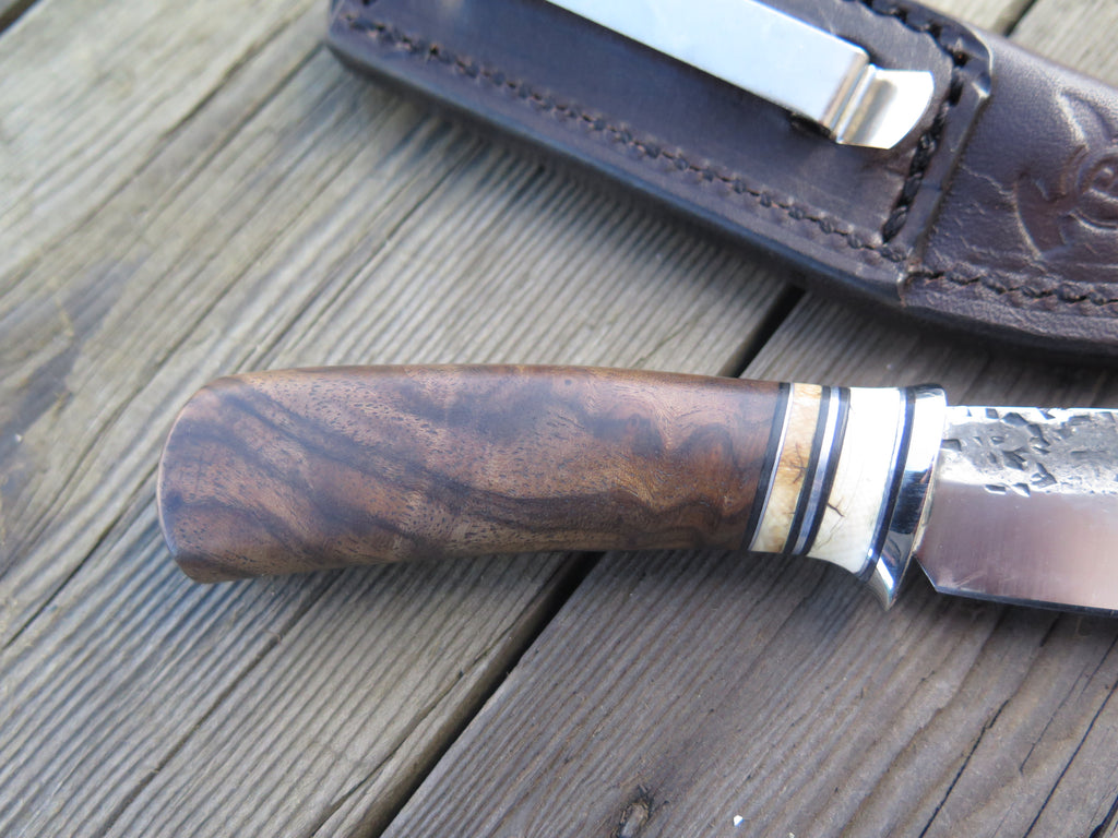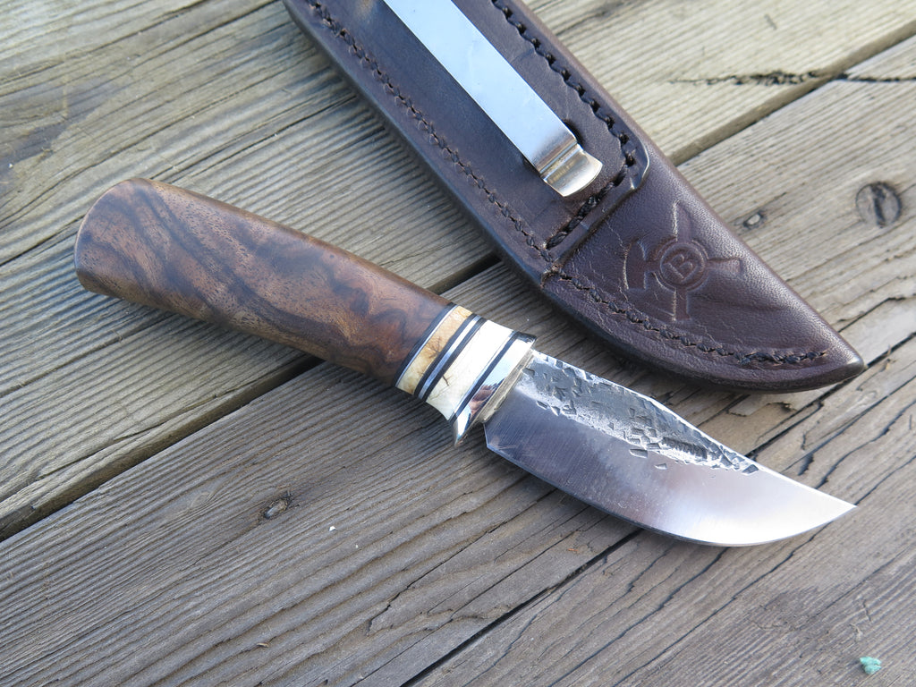 This incredible new Pocket Knife from Behring Made© is hand forged from 1/8" thick high carbon 01 tool steel and it measures 2 3/4" from tip to guard with a razor sharp hollow grind and our hammermark finish. The nickel silver guard is soldered in place above black fiber, aluminum and two premium mammoth ivory spacers atop a beautiful Turkish walnut handle with high figure grains. The overall length measures 6 1/4" and it comes in a custom clip sheath to ride in the right hand pocket of your jeans.