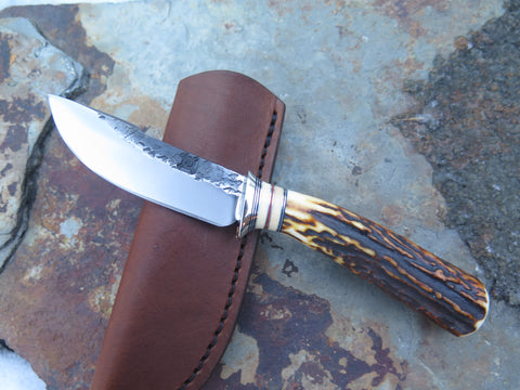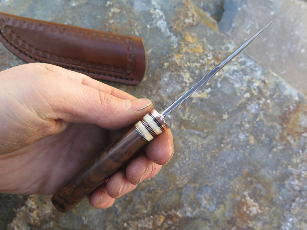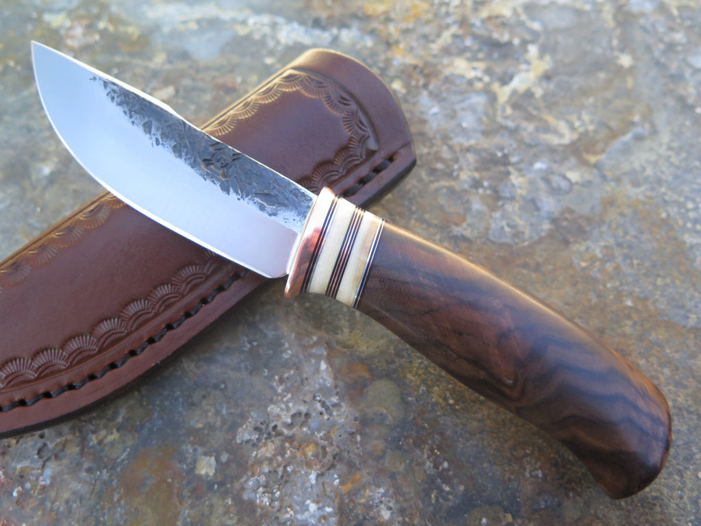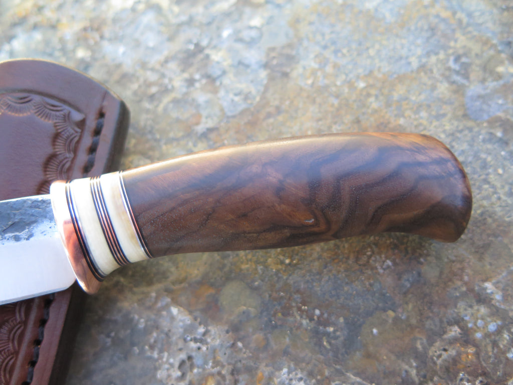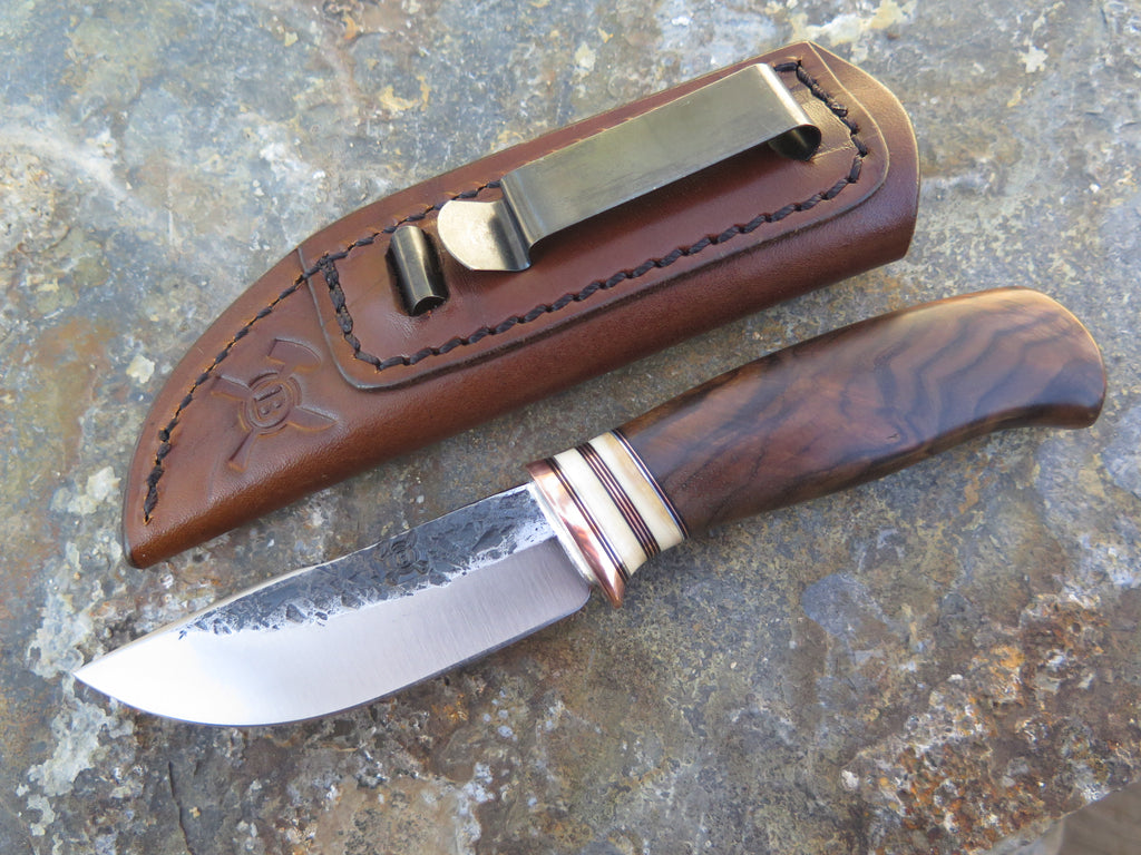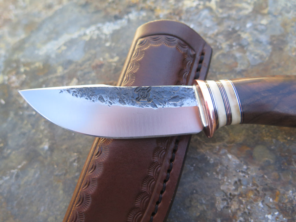 This sleek new Behring Made© Woodcraft pocket is hand forged from 1/8" thick high carbon 01 tool steel and it measures 3" from tip to guard with a razor sharp hollow grind and our hammermark finish. The copper guard is soldered in place above black fiber, copper, aluminum and two mammoth ivory spacers. The premium Turkish walnut handle features a beautiful grain pattern and the overall length measures just over 6 1/2". The sheath is outfitted with a spring clip and designed to ride conveniently inside the right hand pocket of your britches.