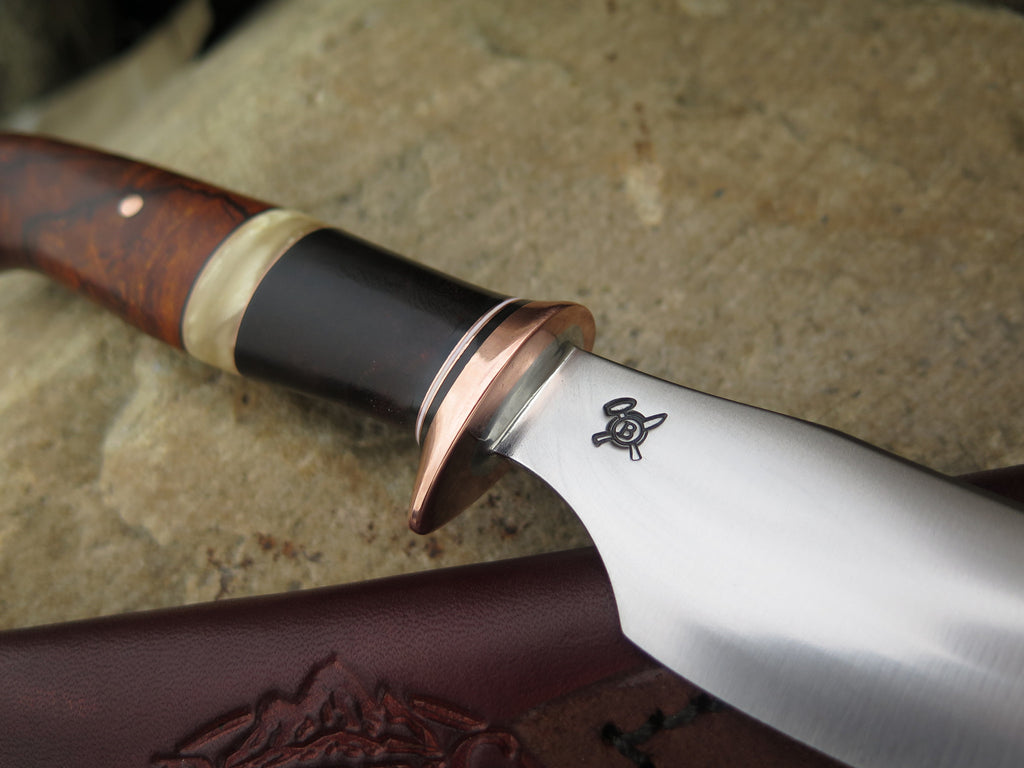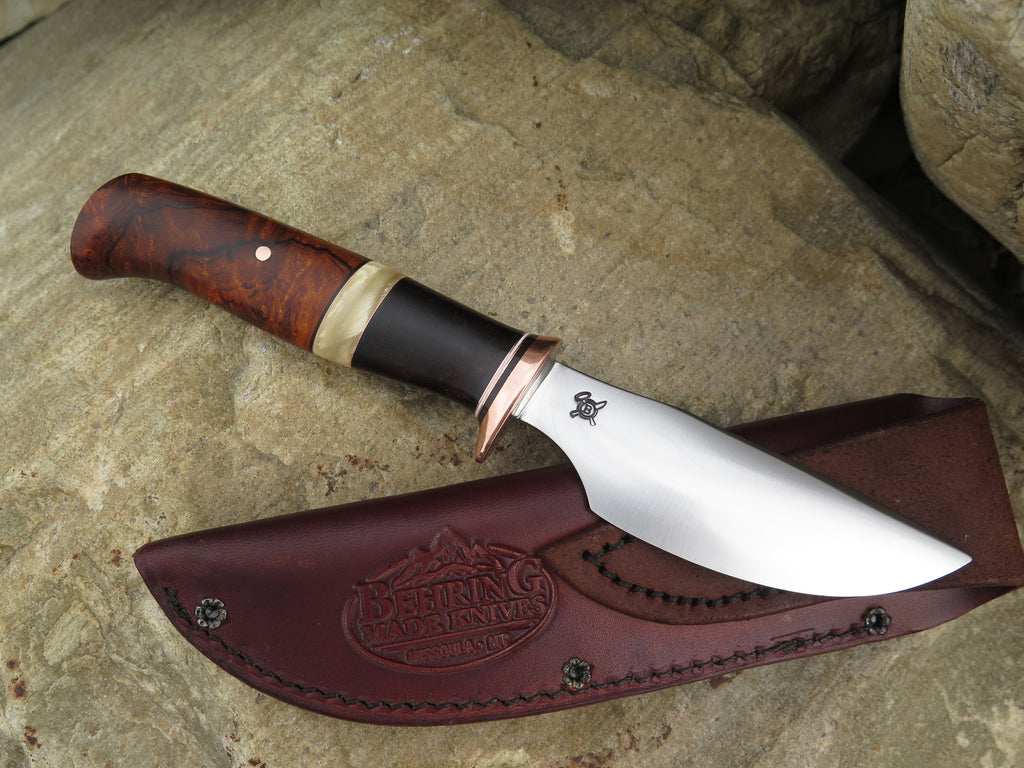 This Behring Made Alaskan is hand forged from high carbon 01 tool steel and measures 4" from tip to guard with a razor sharp convex grind. The copper guard is soldered in place above black, white and copper spacers as well as a two-piece desert ironwood and musk ox boss handle. The overall length measures 8 1/2" and it comes in a Behring Made pouch style sheath.