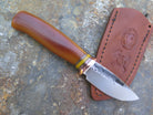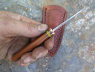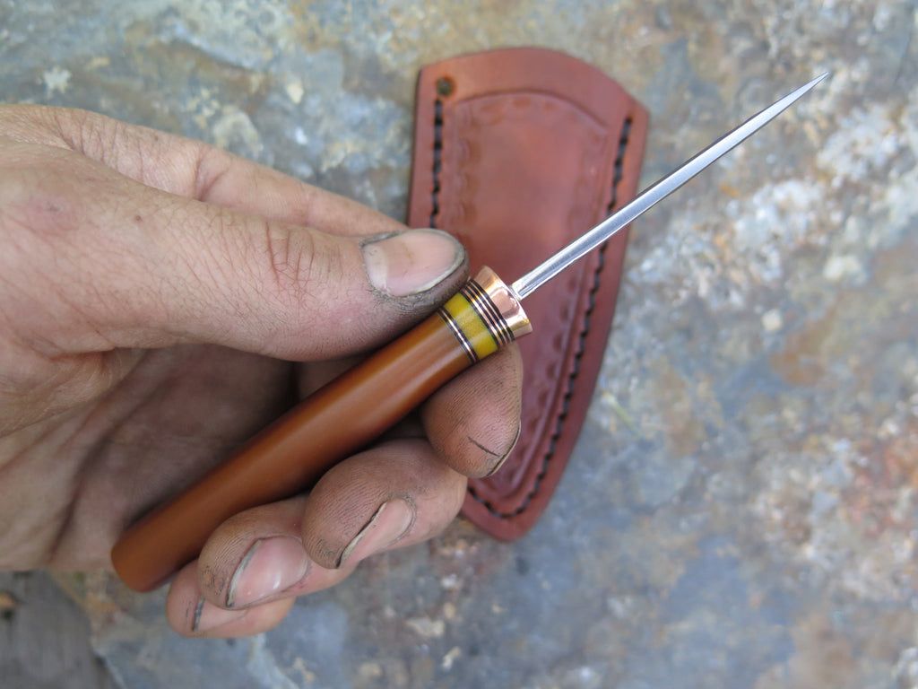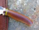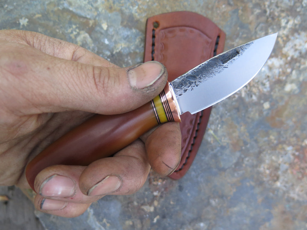 This beautiful Behring Made© 5th pocket is hand forged from 1/8" thick high carbon 01 tool steel and it measures 2 3/8" from tip to guard with a razor sharp hollow grind and our hammermark finish. The copper guard is soldered in place above black fiber, copper and yellow micarta spacers as well as a vintage Westinghouse xxx caramel micarta handle. The overall length measures 5 5/8" and it comes in a border tooled custom leather 5th pocket sleeve.