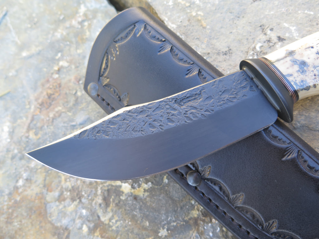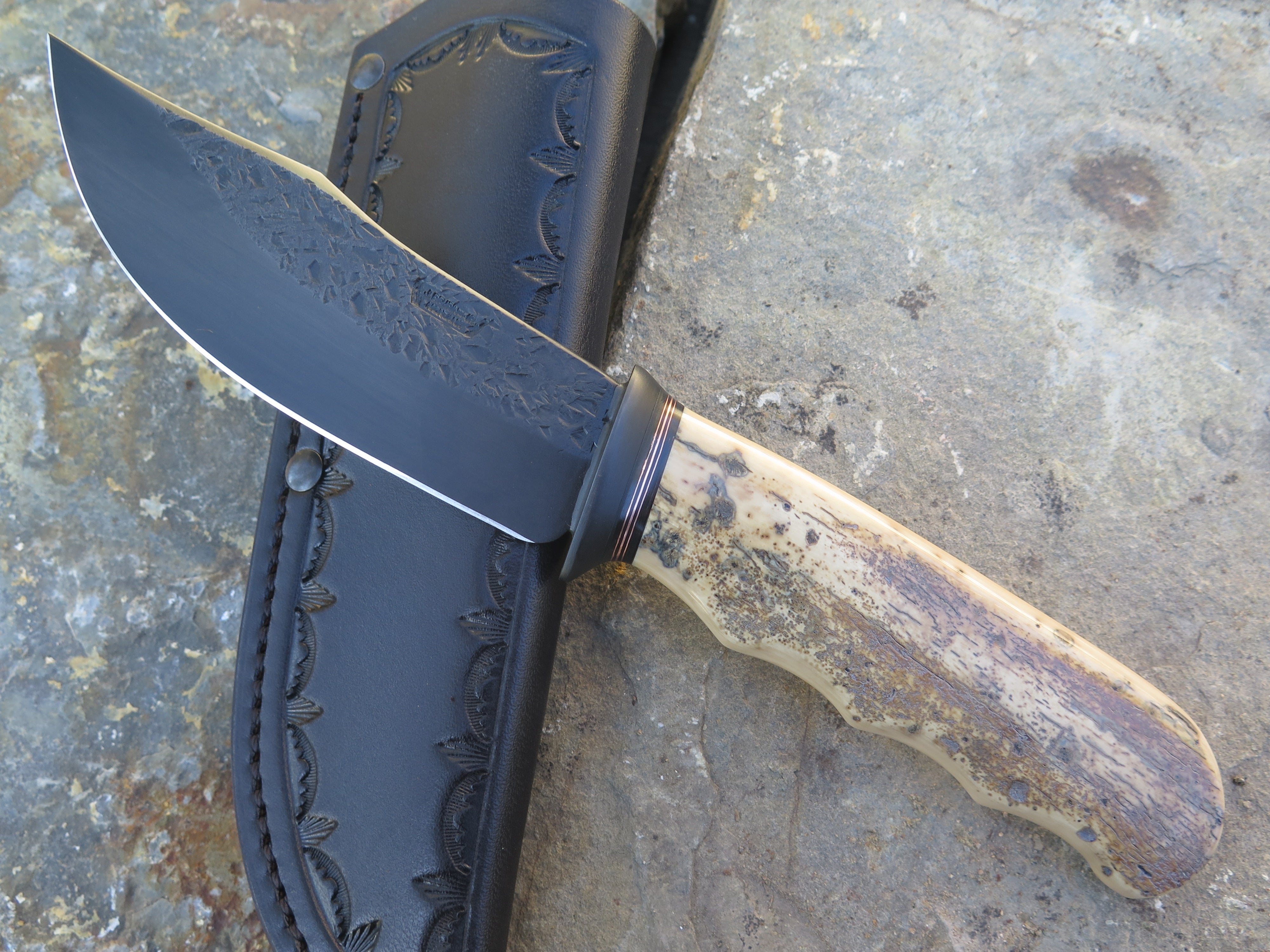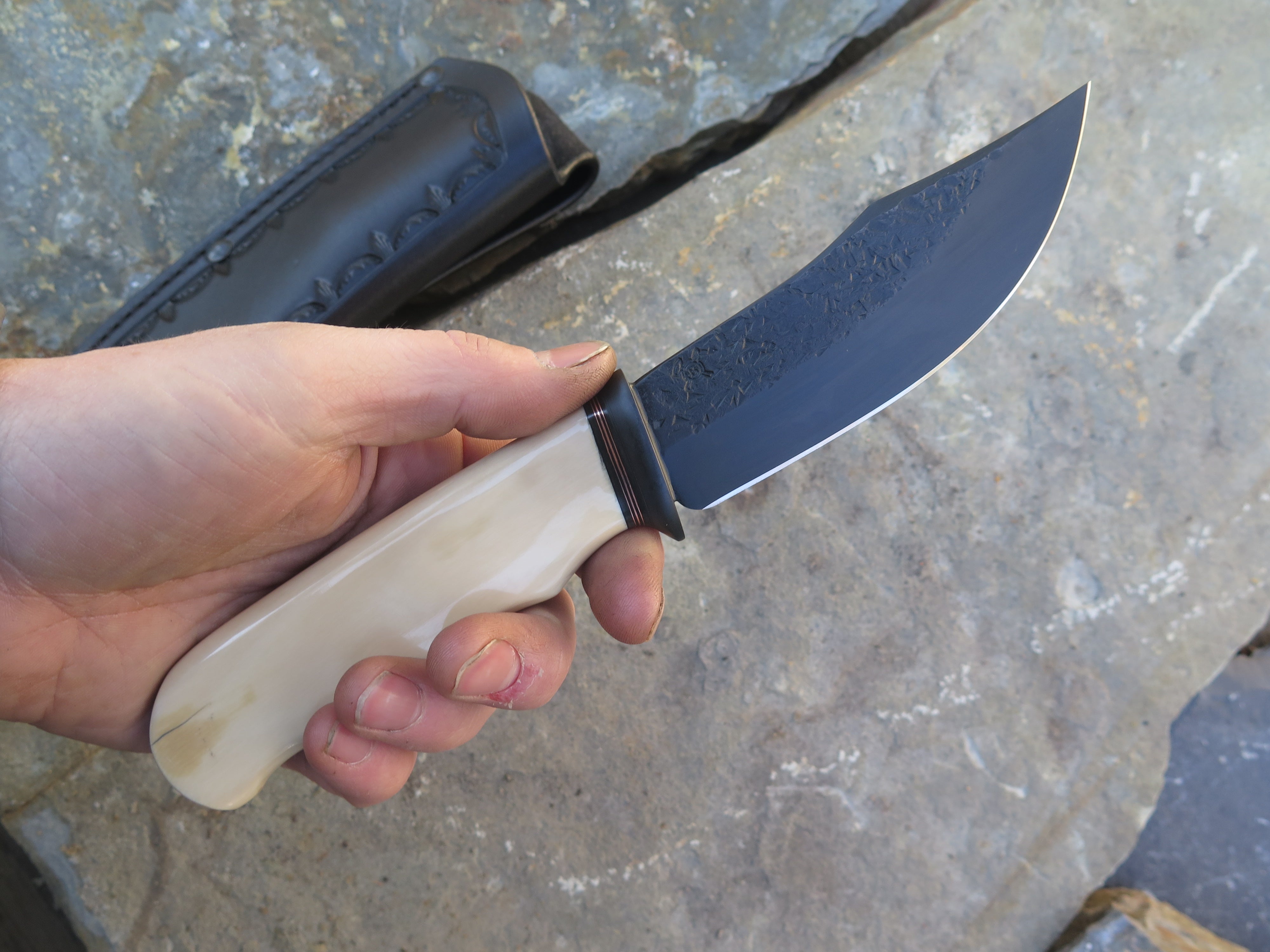 This outstanding new Behring Made© Clip Point is hand forged out of 3/16" thick high carbon 01 tool steel and it measures 4 3/4" from tip to guard with a razor sharp hollow grind, hammermarks and our forced patina blued finish. The blued steel guard is soldered in place above black fiber and copper spacers which top a premium ancient mammoth ivory handle that James ground with a Ward Gay style finger grip. The overall length is just shy of 9 1/2" and this beauty is coming in a custom tooled belt pouch sheath.