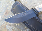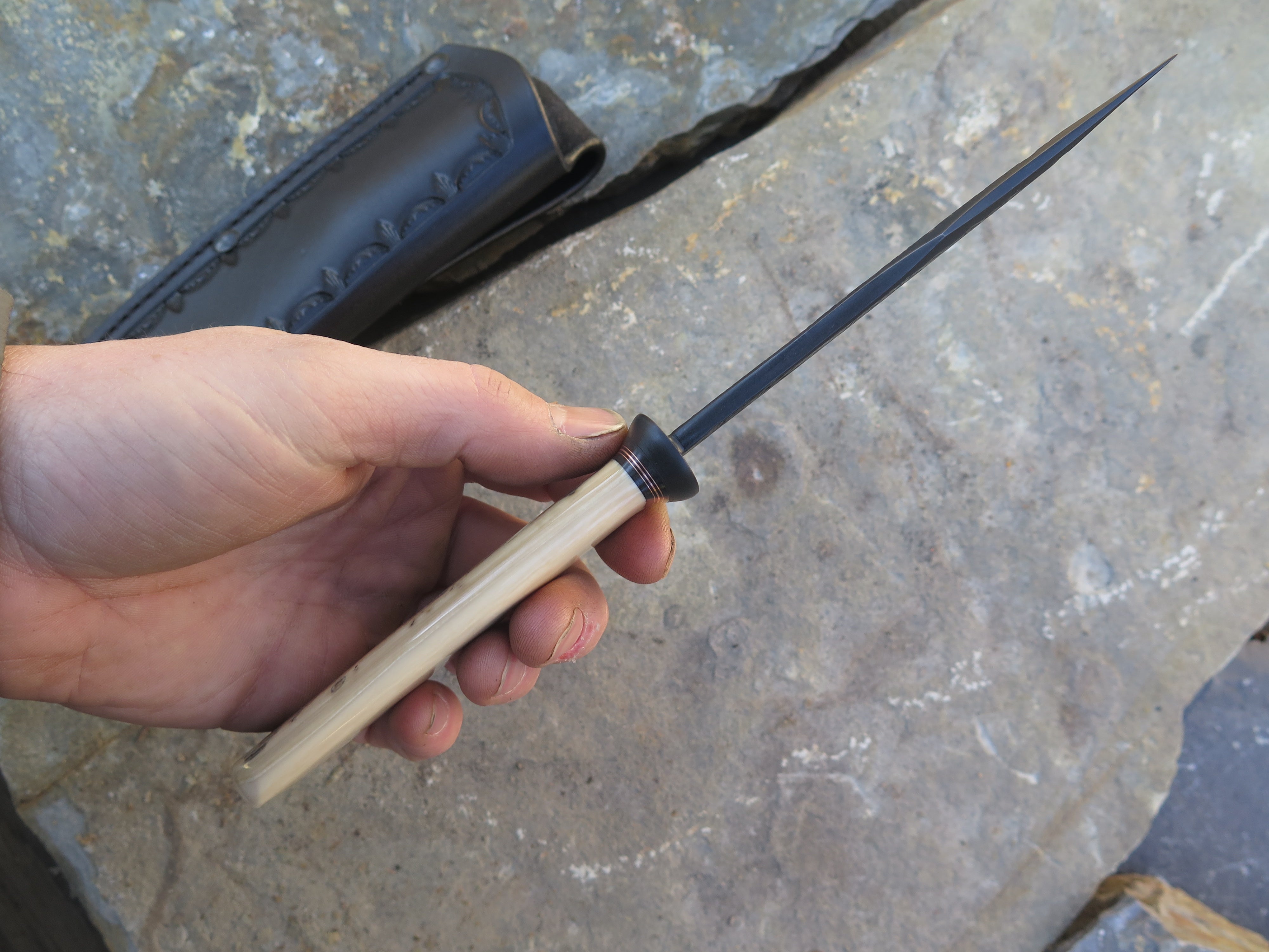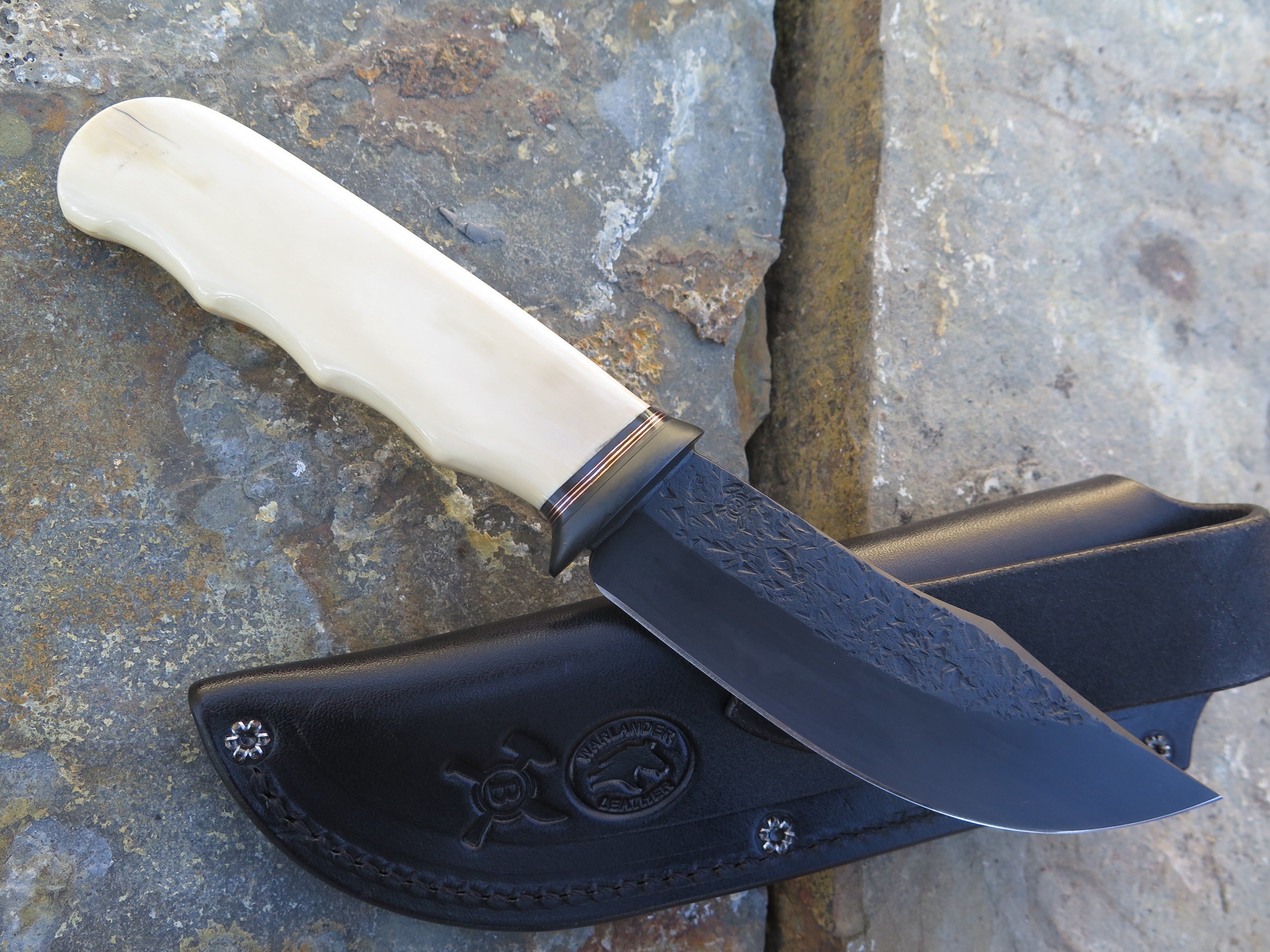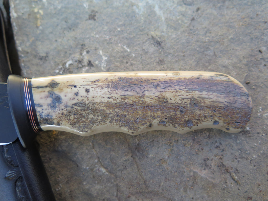 This outstanding new Behring Made© Clip Point is hand forged out of 3/16" thick high carbon 01 tool steel and it measures 4 3/4" from tip to guard with a razor sharp hollow grind, hammermarks and our forced patina blued finish. The blued steel guard is soldered in place above black fiber and copper spacers which top a premium ancient mammoth ivory handle that James ground with a Ward Gay style finger grip. The overall length is just shy of 9 1/2" and this beauty is coming in a custom tooled belt pouch sheath.